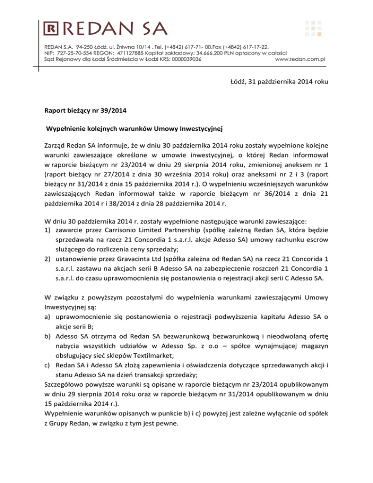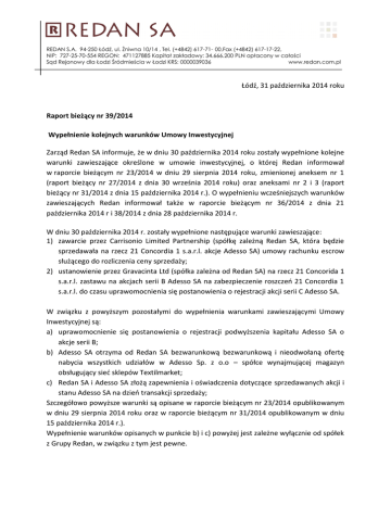 REDAN S.A. 94-250 Łódź, ul. Żniwna 10/14 , Tel. (+4842) 617-71- 00,Fax (+4842) 617-17-22, NIP: 727-25-70-554 REGON: 471127885 Kapitał zakładowy: 34.666.200 PLN opłacony w całości Sąd Rejonowy dla Łodzi Śródmieścia w Łodzi KRS: 0000039036 www.redan.com.pl Łódź, 31 października 2014 roku Raport bieżący nr 39/2014 Wypełnienie kolejnych warunków Umowy Inwestycyjnej Zarząd Redan SA informuje, że w dniu 30 października 2014 roku zostały wypełnione kolejne warunki zawieszające określone w umowie inwestycyjnej, o której Redan informował w raporcie bieżącym nr 23/2014 w dniu 29 sierpnia 2014 roku, zmienionej aneksem nr 1 (raport bieżący nr 27/2014 z dnia 30 września 2014 roku) oraz aneksami nr 2 i 3 (raport bieżący nr 31/2014 z dnia 15 października 2014 r.). O wypełnieniu wcześniejszych warunków zawieszających Redan informował także w raporcie bieżącym nr 36/2014 z dnia 21 października 2014 r i 38/2014 z dnia 28 października 2014 r. W dniu 30 października 2014 r. zostały wypełnione następujące warunki zawieszające: 1) zawarcie przez Carrisonio Limited Partnership (spółkę zależną Redan SA, która będzie sprzedawała na rzecz 21 Concordia 1 s.a.r.l. akcje Adesso SA) umowy rachunku escrow służącego do rozliczenia ceny sprzedaży; 2) ustanowienie przez Gravacinta Ltd (spółka zależna od Redan SA) na rzecz 21 Concorida 1 s.a.r.l. zastawu na akcjach serii B Adesso SA na zabezpieczenie roszczeń 21 Concordia 1 s.a.r.l. do czasu uprawomocnienia się postanowienia o rejestracji akcji serii C Adesso SA. W związku z powyższym pozostałymi do wypełnienia warunkami zawieszającymi Umowy Inwestycyjnej są: a) uprawomocnienie się postanowienia o rejestracji podwyższenia kapitału Adesso SA o akcje serii B; b) Adesso SA otrzyma od Redan SA bezwarunkową bezwarunkową i nieodwołaną ofertę nabycia wszystkich udziałów w Adesso Sp. z o.o – spółce wynajmującej magazyn obsługujący sieć sklepów Textilmarket; c) Redan SA i Adesso SA złożą zapewnienia i oświadczenia dotyczące sprzedawanych akcji i stanu Adesso SA na dzień transakcji sprzedaży; Szczegółowo powyższe warunki są opisane w raporcie bieżącym nr 23/2014 opublikowanym w dniu 29 sierpnia 2014 roku oraz w raporcie bieżącym nr 31/2014 opublikowanym w dniu 15 października 2014 r.). Wypełnienie warunków opisanych w punkcie b) i c) powyżej jest zależne wyłącznie od spółek z Grupy Redan, w związku z tym jest pewne. REDAN S.A. 94-250 Łódź, ul. Żniwna 10/14 , Tel. (+4842) 617-71- 00,Fax (+4842) 617-17-22, NIP: 727-25-70-554 REGON: 471127885 Kapitał zakładowy: 34.666.200 PLN opłacony w całości Sąd Rejonowy dla Łodzi Śródmieścia w Łodzi KRS: 0000039036 www.redan.com.pl Warunek wymieniony w punkcie a) powyżej w zasadzie został wypełniony 27 października 2014 r. (w terminie 7 dni po odebraniu postanowienia o rejestracji podwyższenia kapitału Adesso SA o akcje serii B). Potwierdzenie przez sąd wypełnienia tego warunku poprzez naniesienie na postanowienie adnotacji o prawomocności powinno – w ocenie zarządu – nastąpić do 4 listopada 2014 r. Gdy to nastąpi będzie możliwe wykonanie umowy inwestycyjnej i sfinalizowanie sprzedaży mniejszościowego pakietu akcji Adesso SA na rzecz 21 Concorida 1 s.a.r.l. Podstawa Prawna: Art. 56 ust. 1 pkt 2 ustawy o ofercie – informacje bieżące i okresowe oraz § 5 ust. 1 pkt 4) Rozporządzenia w sprawie informacji bieżących. Bogusz Kruszyński Wiceprezes Zarządu