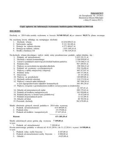 Załącznik Nr 3 do Zarządzenia Nr 19/2015 Burmistrza Miasta Mikołajki z dnia 25 marca 2015 r. Część opisowa do informacji z wykonania budżetu gminy Mikołajki za 2014 rok DOCHODY Dochody w 2014 roku zostały wykonane w kwocie 34 948 503,62 zł, co stanowi 90,52 % planu rocznego. Na uzyskaną kwotę składają się następujące dochody: 1. Dochody własne 2. Subwencja ogólna 3. Dotacje na zadania zlecone 4. Dotacje na zadania własne 5. Środki z funduszy UE 16 654 009,53 zł. 9 121 361,00 zł. 4 571 404,67 zł. 1 833 399,16 zł. 2 768 329,26 zł. Na dochody własne decydujący wpływ miały niżej przedstawione podatki , opłaty lokalne, itp. : 1. Podatek od nieruchomości 5 625 191,51 zł. 2. Dochody z mienia komunalnego 2 548 050,09 zł. 3. Udział w podatkach stanowiących dochód budżetu państwa 3 379 588,51 zł. 4. Podatek rolny 967 209,93 zł. 5. Wpływy za zezwolenia na sprzedaż alkoholu 398 948,23 zł. 6. Podatek od czynności cywilnoprawnych 558 356,80 zł. 7. Wpływy z opłaty miejscowej i targowej 665 473,07 zł. 8. Podatek leśny 149 737,48 zł. 9. Darowizny 25 167,49 zł. 10. Wpływy za przedszkole 140 009,08 zł. 11. Dochody stołówki szkolnej 210 272,50 zł. 12. Wpływy z innych opłat lokalnych 987 504,38 zł. w tym zagospodarowanie odpadów komunalnych 681 491,50 zł 13. Wpływy związane z gromadzeniem środków za korzystanie ze środowiska 41 187,41 zł. 14. Odsetki od nieterminowych wpłat 208 379,43 zł. 15. Podatek od środków transportowych 105 958,00 zł. 16. Podatek płacony w formie karty podatkowej 19 472,68 zł. 17. Podatek od posiadanych psów 12 321,00 zł. 18. Odsetki od lokat 48 703,94 zł. 19. Pozostałe dochody 562 478,00 zł. Skutki 1. 2. 3. obniżenia górnych stawek podatku w 2014 roku wynoszą: Podatek od nieruchomości 614 469,00 zł. Podatek rolny 19 379,00 zł. Podatek od środków transportowych 37 437,28 zł. ------------------------Razem: 671 285,28 zł Skutki udzielonych przez gminę ulg wynoszą 7 109,00 zł. w tym : 1. Podatek od nieruchomości 7 109,00 zł. Kwota umorzonego podatku w okresie od 01.01.2014 r. do 31.12.2014 r. wynosi 14 958,80 zł. w tym: 1. Podatek rolny osoby fizyczne 4 247,00 zł. 2. Podatek od nieruchomości osoby fizyczne - 6 088,80 zł. 3. Odsetki 4 623,00 zł. Kwota odroczenia i rozłożenia podatków i odsetek na raty wynosi - 115 801,00 zł. Ogółem zaległości na dzień 31.12.2014 roku wynoszą - 848 055,37 zł i są niższe od zaległości na 30.06.2014 roku o 296 825,99 zł. Realizacja zaległości podatkowych na dzień 31.12.2014 r. W 2014 roku wystawiono 1123 szt. upomnień na łączną kwotę 1 703 665,74 zł oraz 96 szt. tytułów wykonawczych na łączną kwotę 375 405,36 zł. Wpływy z egzekucji administracyjnej przekazane przez urzędy skarbowe wyniosły: 112 778,77 zł. W 2014 roku organ podatkowy wystąpił z wnioskiem o wpis hipoteki przymusowej na nieruchomości 3 podatników, zabezpieczono należności z tytułu zaległego podatku od nieruchomości, rolnego i leśnego na kwotę 220 837,99 zł wraz z należnymi odsetkami. Wykonanie wpływu podatków na dzień 31.12.2014 r. wg poszczególnych grup podatkowych. 1. Podatek rolny - osoby fizyczne. Ogółem wymiar w tej grupie podatkowej wynosi 764 263,99 zł. Wpływy na dzień 31.12.2014 roku wynoszą 819 566,40 zł, w tym na poczet zaległości za lata ubiegłe wpłacono 167 254,17 zł. Zaległości na 31.12.2014 rok wynoszą 161 457,28 zł. i są to zaległości z roku bieżącego i lat ubiegłych. 2. Podatek od nieruchomości - osoby fizyczne. Ogółem wymiar podatku wynosi 2 883 309,90 zł. Wpływy na dzień 31.12.2014 roku wynoszą 2 964 052,26 zł., w tym na poczet zaległości za lata ubiegłe 293 747,89 zł. Zaległości na 31.12.2014 roku wynoszą 456 191,42 zł. i są to zaległości narastające. 3. Podatek leśny - osoby fizyczne. Wymiar w tej grupie podatkowej wynosi 10 042,00 zł., wpływy na 31.12.2014 r. wynoszą 10 318,60 zł. Zaległość na 31.12.2014 roku wynosi 1 793,00 zł. 4. Podatek od nieruchomości - osoby prawne. Wymiar podatku wynosi 2 689 155,80 zł. Wpływy na dzień 31.12.2014 roku wynoszą 2 674 009,11 zł, w tym na poczet zaległości za lata ubiegłe 41 222,51 zł. Zaległość w tej grupie podatkowej wynosi 210 519,96 zł i są to zaległości narastające. 5. Podatek leśny - osoby prawne. Wymiar podatku na 2014 rok wynosi 139 880,89 zł, wpływy na 31.12.2014 roku wynoszą 139 418,88 zł. Zaległość końcowa wynosi - 794,00 zł. 6. Podatek rolny - osoby prawne. Wymiar podatku w tej grupie podatkowej wynosi 161 368,89 zł, wpływy na dzień 31.12.2014 roku wynoszą 147 839,03 zł. w tym na zaległość - 41 922,56 zł. Zaległość końcowa wynosi 17 299,71 zł i są to zaległości narastające. Ogółem zaległości na dzień 31.12.2014 roku wynoszą 30.06.2014 roku o 296 825,99 zł. Wykaz zaległości i nadpłat osób fizycznych na miejscowościach. - 848 055,37 zł i są niższe od zaległości na dzień 31.12.2014 roku w poszczególnych L. p 1 1. 2. 3. 4. 5. 6. 7. 8. 9. 10. 11. 12. 13. 14. 15. 16. 17. 18. 19. Nazwa wsi 2 Baranowo Cudnochy Faszcze Górkło Grabówka Inulec Jora Wielka Lubiewo Olszewo Prawdowo Stare Sady Tałty Woźnice Zełwągi Kolonia M-ki Stawek Nowe Sady Mikołajki Mikołajki miasto Razem Zaległości końcowe R Nadpłaty końcowe R 3 4 2 777,00 150,00 2 533,00 0,00 3 414,00 306,00 332,00 178,75 6 796,00 158,20 8 747,64 18,10 28 061,92 570,00 254,00 309,00 8 576,10 89,00 258,00 51,09 4 142,19 101,00 1 063,59 704,20 72 463,84 1,00 2 551,00 102,10 15 455,30 12,00 110,20 0,00 143,00 0,00 1 109,20 75,00 2 669,30 402,00 161 457,28 3 227,44 Zaległość końcowa N 5 26 370,00 223,57 548,00 1 312,00 2 045,00 620,00 13 129,70 846,80 7 123,95 2 706,90 4 231,94 6 269,00 49 175,44 52 687,64 1 258,00 10 105,27 0,00 1 396,00 276 142,21 456 191,42 Nadpłata Ilość Ilość końcowa podatni podatnik N ków ów zalegając ych 6 7 8 212,00 55 7 0,00 26 6 0,00 61 11 157,00 111 9 1,20 77 11 14,00