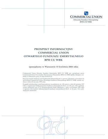 PROSPEKT INFORMACYJNY COMMERCIAL UNION OTWARTEGO FUNDUSZU EMERYTALNEGO BPH CU WBK sporzàdzony w Warszawie 15 kwietnia 2004 roku Commercial Union Otwarty Fundusz Emerytalny BPH CU WBK jest zarzàdzany przez Commercial Union Powszechne Towarzystwo Emerytalne BPH CU WBK Spó∏ka Akcyjna z siedzibà w Warszawie, przy al. Jana Paw∏a II 23. Decyzja Urz´du Nadzoru nad Funduszami Emerytalnymi w sprawie udzielenia zezwolenia na utworzenie Commercial Union Otwartego Funduszu Emerytalnego BPH CU WBK zosta∏a wydana w dniu 26 stycznia 1999 roku. Prospekt informacyjny zosta∏ sporzàdzony na podstawie art. 189 ustawy z dnia 28 sierpnia 1997 roku o organizacji i funkcjonowaniu funduszy emerytalnych (Dz.U. nr 139, poz. 934 z póêniejszymi zmianami) oraz § 2-5 Rozporzàdzenia Rady Ministrów z dnia 14 kwietnia 1999 roku w sprawie obowiàzków informacyjnych funduszy emerytalnych (Dz.U. nr 32, poz. 314 z póêniejszymi zmianami). List Piotra Szczepiórkowskiego, prezesa Commercial Union PTE str. 3 Informacja na temat wyników dzia∏alnoÊci inwestycyjnej Funduszu str. 4 Sprawozdanie finansowe str. 7 Wst´p do sprawozdania finansowego str. 7 SPIS TREÂCI 2 Bilans Funduszu str. 12 Rachunek zysków i strat str. 13 Zestawienie zmian w kapitale w∏asnym str. 14 Rachunek przep∏ywów pieni´˝nych str. 15 Zestawienie portfela inwestycyjnego str. 17 Informacja dodatkowa str. 31 Opinia Niezale˝nego Bieg∏ego Rewidenta str. 40 OÊwiadczenie Depozytariusza str. 41 Statut Commercial Union OFE str. 42 Szanowni Paƒstwo, zapraszam naszych obecnych Klientów i wszystkie osoby rozwa˝ajàce przystàpienie do Commercial Union Otwartego Funduszu Emerytalnego BPH CU WBK do lektury prospektu informacyjnego Funduszu. Znajdà w nim Paƒstwo informacje o wynikach i kierunkach dzia∏alnoÊci inwestycyjnej, zatwierdzone sprawozdanie finansowe oraz aktualny, zmieniony z dniem 1 kwietnia 2004 roku, Statut Funduszu. Obecnie do Commercial Union OFE swoje sk∏adki przekazuje ponad 2,5 miliona osób, a wartoÊç zgromadzonych w Funduszu aktywów przekroczy∏a (w marcu 2004 roku) 14 miliardów z∏otych. Komisja Nadzoru udost´pni∏a dane finansowe na koniec roku 2003, zgodnie z którymi nasze Towarzystwo dysponowa∏o najwi´kszymi kapita∏ami w∏asnymi. Fakty te potwierdzajà pozycj´ lidera, zaufanie Klientów i gwarantujà naszym cz∏onkom bezpieczeƒstwo powierzonych Êrodków. Proces kumulowania oszcz´dnoÊci przeznaczonych na emerytur´ rozciàga si´ na wiele lat. Pragniemy s∏u˝yç Paƒstwu w tym okresie, dlatego podejmujàc nasze dzia∏ania oceniamy ich skutki przez pryzmat d∏ugoterminowych korzyÊci cz∏onków Funduszu Commercial Union. Z tego wzgl´du w roku ubieg∏ym zdecydowaliÊmy si´ obni˝yç op∏at´ od sk∏adki dla osób przy∏àczajàcych si´ do CU OFE z 10 proc. do 8,5 proc. Dalsza obni˝ka tej op∏aty do 7 proc. mia∏a miejsce 1 kwietnia 2004 r. Wszyscy Klienci, którzy przystàpili do Funduszu przed 1 kwietnia 2004 roku, b´dà korzystaç z dalszej obni˝ki op∏at do 4 proc. po uzyskaniu 24-miesi´cznego sta˝u. Z tego przywileju ju˝ obecnie korzysta blisko 1,9 miliona Klientów. Jestem przekonany, ˝e dotrzymanie z∏o˝onych Klientom obietnic dotyczàcych obni˝enia op∏aty od sk∏adki jako przywileju zwiàzanego ze sta˝em cz∏onkowskim, spotka si´ z ich uznaniem i zadowoleniem. Zgodnie z zapisami znowelizowanej ustawy i Statutu CU OFE, od poczàtku 2014 roku op∏ata od sk∏adki dla wszystkich Klientów zostanie dodatkowo obni˝ona do 3,5 proc. 3 Ze wzgl´du na wysokoÊç aktywów, od 1 kwietnia 2004 roku Fundusz pobiera najni˝szà na rynku op∏at´ za zarzàdzanie. Od nadwy˝ki wartoÊci aktywów ponad 8 mld z∏ (na poczàtek kwietnia by∏a to kwota 6 mld z∏, a wi´c blisko 43 proc. zarzàdzanych aktywów), Fundusz pobiera op∏at´ obni˝onà do 0,04 proc. w skali miesiàca. Chcia∏bym zwróciç Paƒstwa uwag´, i˝ z najni˝szej na rynku op∏aty za zarzàdzanie korzystaç b´dà w równym stopniu obecni Klienci Funduszu, jak i wszystkie te osoby, które przystàpià w przysz∏oÊci do CU OFE. Fundusz systematycznie osiàga wyniki inwestycyjne znacznie przewy˝szajàce oczekiwany d∏ugoterminowy zysk ponad poziom inflacji. W roku 2003 realna stopa zwrotu przekroczy∏a 8 proc., co w po∏àczeniu z niskim poziomem op∏at pozwala przyÊpieszyç proces budowania kapita∏u emerytalnego cz∏onków CU OFE. Polityka inwestycyjna Funduszu dà˝y do ograniczenia ryzyka i zapewnienia mo˝liwie wysokiej stopy zwrotu. Podejmujemy dzia∏ania majàce na celu dalszà dywersyfikacj´ portfela inwestycyjnego, poprzez zwi´kszenie stopnia wykorzystania limitu inwestycji zagranicznych oraz rozszerzenie bazy podmiotów w które inwestujemy. W roku 2004 przewidujemy podj´cie inwestycji wspierajàcych rozwój infrastruktury w naszym kraju. W roku 2003 Towarzystwo otrzyma∏o certyfikat potwierdzajàcy spe∏nianie wymagaƒ normy Systemu Zarzàdzania JakoÊcià ISO 9001:2000. Zakres certyfikacji obejmuje zarzàdzanie Otwartym Funduszem Emerytalnym Commercial Union. W Polityce JakoÊci przyj´liÊmy za punkt wyjÊcia naszych dzia∏aƒ misj´ Towarzystwa: Zarzàdzajàc najwi´kszym Otwartym Funduszem Emerytalnym budujemy d∏ugoterminowe oszcz´dnoÊci naszych Klientów i przyczyniamy si´ do wzrostu gospodarczego kraju. Chcemy byç efektywnà i sprawnà organizacjà stosujàcà najlepsze praktyki rynkowe, zapewniajàcà przyjaznà obs∏ug´ i czytelnà informacj´. Naszym sukcesem jest satysfakcja i zaufanie Klientów – to nadaje sens naszej pracy i decyduje o wartoÊci naszej marki i firmy. Chcia∏bym zapewniç Paƒstwa o zaanga˝owaniu Zarzàdu i wszystkich pracowników Commercial Union PTE w realizacj´ misji Towarzystwa. Jest to bowiem najlepszy sposób na spe∏nienie Paƒstwa oczekiwaƒ zwiàzanych z gromadzeniem oszcz´dnoÊci w ramach otwartego funduszu emerytalnego. Z powa˝aniem Piotr Szczepiórkowski Prezes Zarzàdu LIST PREZESA Trzecim filarem naszych dzi