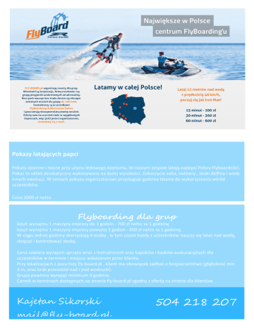 Pokazy latających papci Pokazy dzienne i nocne przy użyciu ledowego kostiumu. W naszym zespole latają najlepsi Polscy Flyboardziści. Pokaz to układ akrobatyczny wykonywany na dużej wysokości. Zobaczycie salta, twistery , skoki delfina i wiele innych ewolucji. W ramach pokazu organizatorowi przysługuje godzina latania do wykorzystania wśród uczestników. Cena 3000 zł netto Flyboarding dla grup koszt wynajmu 1 maszyny imprezy do 3 godzin - 700 zł netto za 1 godzinę koszt wynajmu 1 maszyny imprezy powyżej 3 godzin - 600 zł netto za 1 godzinę W ciągu jednej godziny skorzystają 4 osoby , w tym czasie każdy z uczestników nauczy się latać nad wodą, skręcać i kontrolować deskę. Cena zawiera wynajem sprzętu wraz z instruktorem oraz kapoków i kasków asekuracyjnych dla uczestników w terminie i miejscu wskazanym przez klienta. Przy lokalizacjach z poza listy fly-board.pl , klient ma obowiązek zadbać o bezpieczeństwo (głębokość min 3 m, oraz brak przeszkód nad i pod wodnych). Grupa powinna wynająć minimum 3 godziny. Cennik w terminach dostępnych na stronie fly-board.pl zgodny z ofertą na stronie dla klientów. Kajetan Sikorski [email protected] 504 218 207