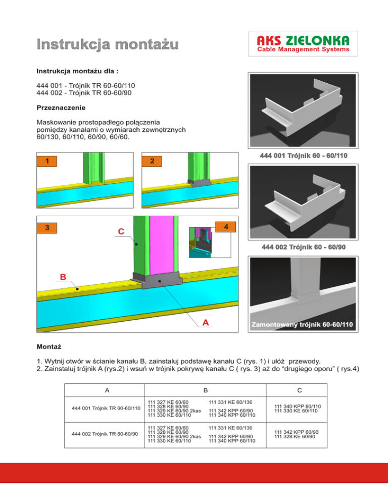 Instrukcja montażu Instrukcja montażu dla : 444 001 - Trójnik TR 60-60/110 444 002 - Trójnik TR 60-60/90 Przeznaczenie Maskowanie prostopadłego połączenia pomiędzy kanałami o wymiarach zewnętrznych 60/130, 60/110, 60/90, 60/60. 1 444 001 Trójnik 60 - 60/110 2 3 4 C 444 002 Trójnik 60 - 60/90 B A Zamontowany trójnik 60-60/110 Montaż 1. Wytnij otwór w ścianie kanału B, zainstaluj podstawę kanału C (rys. 1) i ułóż przewody. 2. Zainstaluj trójnik A (rys.2) i wsuń w trójnik pokrywę kanału C ( rys. 3) aż do “drugiego oporu” ( rys.4) A B C 111 327 KE 60/60 111 328 KE 60/90 111 329 KE 60/90 2kas 111 330 KE 60/110 111 331 KE 60/130 444 001 Trójnik TR 60-60/110 111 327 KE 60/60 111 328 KE 60/90 111 329 KE 60/90 2kas 111 330 KE 60/110 111 331 KE 60/130 444 002 Trójnik TR 60-60/90 111 342 KPP 60/90 111 340 KPP 60/110 111 342 KPP 60/90 111 340 KPP 60/110 111 340 KPP 60/110 111 330 KE 60/110 111 342 KPP 60/90 111 328 KE 60/90 444 001 Trójnik 60 - 60/110 - przykład montażu 444 002 Trójnik 60 - 60/90 444 001 Trójnik 60 - 60/110