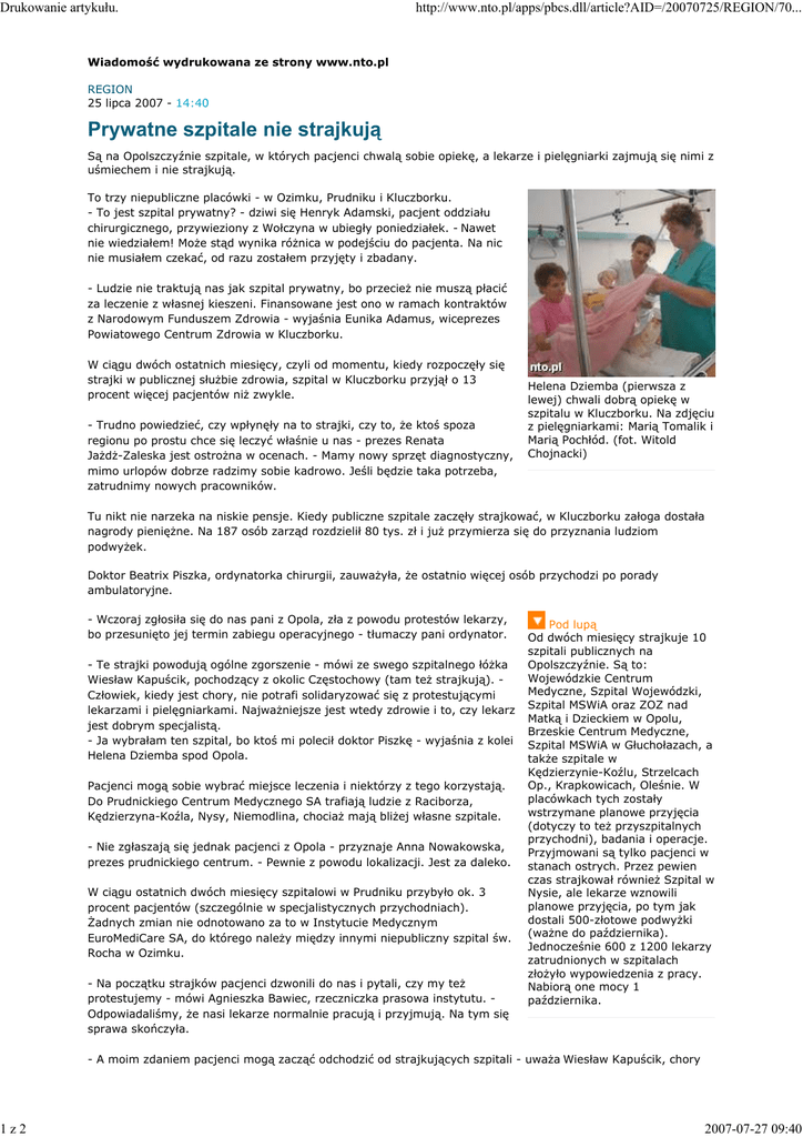 Drukowanie artykułu. 1z2 http://www.nto.pl/apps/pbcs.dll/article?AID=/20070725/REGION/70... Wiadomość wydrukowana ze strony www.nto.pl REGION 25 lipca 2007 - 14:40 Prywatne szpitale nie strajkują Są na Opolszczyźnie szpitale, w których pacjenci chwalą sobie opiekę, a lekarze i pielęgniarki zajmują się nimi z uśmiechem i nie strajkują. To trzy niepubliczne placówki - w Ozimku, Prudniku i Kluczborku. - To jest szpital prywatny? - dziwi się Henryk Adamski, pacjent oddziału chirurgicznego, przywieziony z Wołczyna w ubiegły poniedziałek. - Nawet nie wiedziałem! Może stąd wynika różnica w podejściu do pacjenta. Na nic nie musiałem czekać, od razu zostałem przyjęty i zbadany. - Ludzie nie traktują nas jak szpital prywatny, bo przecież nie muszą płacić za leczenie z własnej kieszeni. Finansowane jest ono w ramach kontraktów z Narodowym Funduszem Zdrowia - wyjaśnia Eunika Adamus, wiceprezes Powiatowego Centrum Zdrowia w Kluczborku. W ciągu dwóch ostatnich miesięcy, czyli od momentu, kiedy rozpoczęły się strajki w publicznej służbie zdrowia, szpital w Kluczborku przyjął o 13 procent więcej pacjentów niż zwykle. - Trudno powiedzieć, czy wpłynęły na to strajki, czy to, że ktoś spoza regionu po prostu chce się leczyć właśnie u nas - prezes Renata Jażdż-Zaleska jest ostrożna w ocenach. - Mamy nowy sprzęt diagnostyczny, mimo urlopów dobrze radzimy sobie kadrowo. Jeśli będzie taka potrzeba, zatrudnimy nowych pracowników. Helena Dziemba (pierwsza z lewej) chwali dobrą opiekę w szpitalu w Kluczborku. Na zdjęciu z pielęgniarkami: Marią Tomalik i Marią Pochłód. (fot. Witold Chojnacki) Tu nikt nie narzeka na niskie pensje. Kiedy publiczne szpitale zaczęły strajkować, w Kluczborku załoga dostała nagrody pieniężne. Na 187 osób zarząd rozdzielił 80 tys. zł i już przymierza się do przyznania ludziom podwyżek. Doktor Beatrix Piszka, ordynatorka chirurgii, zauważyła, że ostatnio więcej osób przychodzi po porady ambulatoryjne. - Wczoraj zgłosiła się do nas pani z Opola, zła z powodu protestów lekarzy, bo przesunięto jej termin zabiegu operacyjnego - tłumaczy pani ordynator. - Te strajki powodują ogólne zgorszenie - mówi ze swego szpitalnego łóżka Wiesław Kapuścik, pochodzący z okolic Częstochowy (tam też strajkują). Człowiek, kiedy jest chory, nie potrafi solidaryzować się z protestującymi lekarzami i pielęgniarkami. Najważniejsze jest wtedy zdrowie i to, czy lekarz jest dobrym specjalistą. - Ja wybrałam ten szpital, bo ktoś mi polecił doktor Piszkę - wyjaśnia z kolei Helena Dziemba spod Opola. Pacjenci mogą sobie wybrać miejsce leczenia i niektórzy z tego korzystają. Do Prudnickiego Centrum Medycznego SA trafiają ludzie z Raciborza, Kędzierzyna-Koźla, Nysy, Niemodlina, chociaż mają bliżej własne szpitale. - Nie zgłaszają się jednak pacjenci z Opola - przyznaje Anna Nowakowska, prezes prudnickiego centrum. - Pewnie z powodu lokalizacji. Jest za daleko. W ciągu ostatnich dwóch miesięcy szpitalowi w Prudniku przybyło ok. 3 procent pacjentów (szczególnie w specjalistycznych przychodniach). Żadnych zmian nie odnotowano za to w Instytucie Medycznym EuroMediCare SA, do którego należy między innymi niepubliczny szpital św. Rocha w Ozimku. - Na początku strajków pacjenci dzwonili do nas i pytali, czy my też protestujemy - mówi Agnieszka Bawiec, rzeczniczka prasowa instytutu. Odpowiadaliśmy, że nasi lekarze normalnie pracują i przyjmują. Na tym się sprawa skończyła. Pod lupą Od dwóch miesięcy strajkuje 10 szpitali publicznych na Opolszczyźnie. Są to: Wojewódzkie Centrum Medyczne, Szpital Wojewódzki, Szpital MSWiA oraz ZOZ nad Matką i Dzieckiem w Opolu, Brzeskie Centrum Medyczne, Szpital MSWiA w Głuchołazach, a także szpitale w Kędzierzynie-Koźlu, Strzelcach Op., Krapkowicach, Oleśnie. W placówkach tych zostały wstrzymane planowe przyjęcia (dotyczy to też przyszpitalnych przychodni), badania i operacje. Przyjmowani są tylko pacjenci w stanach ostrych. Przez pewien czas strajkował również Szpital w Nysie, ale lekarze wznowili planowe przyjęcia, po tym jak dostali 500-złotowe podwyżki (ważne do października). Jednocześnie 600 z 1200 lekarzy zatrudnionych w szpitalach złożyło wypowiedzenia z pracy. Nabiorą one mocy 1 października. - A moim zdaniem pacjenci mogą zacząć odchodzić od strajkujących szpitali - uważa Wiesław Kapuścik, chory 2007-07-27 09:40 Drukowanie artykułu. 2z2 http://www.nto.pl/apps/pbcs.dll/article?AID=/20070725/REGION/70... leczący się w Kluczborku. - To jest tak: jeśli sklep zostanie zamknięty, bo sprzedawczyni za mało zarabia, klienci nie będą czekać, tylko znajdą sobie inne miejsce, w którym bez trudności zrobią zakupy. W dużych miastach (Warszawie, Gdańsku) chorzy coraz częściej korzystają z płatnych usług medycznych. U nas jeszcze nie. Eunika Adamus twierdzi, że ludzi po prostu na to nie stać. Agata Jop [email protected] Pro Media sp. z o.o. - Opole 2007-07-27 09:40