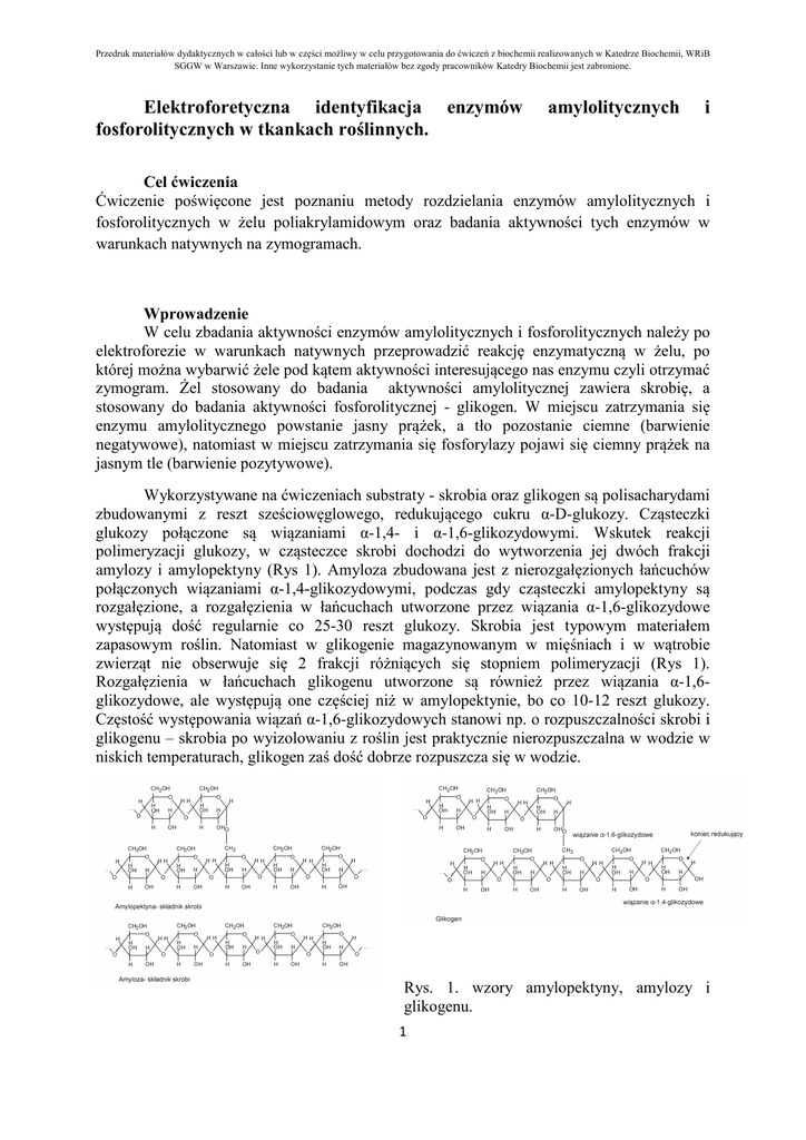 Przedruk materiałów dydaktycznych w całości lub w części możliwy w celu przygotowania do ćwiczeń z biochemii realizowanych w Katedrze Biochemii, WRiB SGGW w Warszawie. Inne wykorzystanie tych materiałów bez zgody pracowników Katedry Biochemii jest zabronione. Elektroforetyczna identyfikacja enzymów fosforolitycznych w tkankach roślinnych. amylolitycznych i Cel ćwiczenia Ćwiczenie poświęcone jest poznaniu metody rozdzielania enzymów amylolitycznych i fosforolitycznych w żelu poliakrylamidowym oraz badania aktywności tych enzymów w warunkach natywnych na zymogramach. Wprowadzenie W celu zbadania aktywności enzymów amylolitycznych i fosforolitycznych należy po elektroforezie w warunkach natywnych przeprowadzić reakcję enzymatyczną w żelu, po której można wybarwić żele pod kątem aktywności interesującego nas enzymu czyli otrzymać zymogram. Żel stosowany do badania aktywności amylolitycznej zawiera skrobię, a stosowany do badania aktywności fosforolitycznej - glikogen. W miejscu zatrzymania się enzymu amylolitycznego powstanie jasny prążek, a tło pozostanie ciemne (barwienie negatywowe), natomiast w miejscu zatrzymania się fosforylazy pojawi się ciemny prążek na jasnym tle (barwienie pozytywowe). Wykorzystywane na ćwiczeniach substraty - skrobia oraz glikogen są polisacharydami zbudowanymi z reszt sześciowęglowego, redukującego cukru α-D-glukozy. Cząsteczki glukozy połączone są wiązaniami α-1,4- i α-1,6-glikozydowymi. Wskutek reakcji polimeryzacji glukozy, w cząsteczce skrobi dochodzi do wytworzenia jej dwóch frakcji amylozy i amylopektyny (Rys 1). Amyloza zbudowana jest z nierozgałęzionych łańcuchów połączonych wiązaniami α-1,4-glikozydowymi, podczas gdy cząsteczki amylopektyny są rozgałęzione, a rozgałęzienia w łańcuchach utworzone przez wiązania α-1,6-glikozydowe występują dość regularnie co 25-30 reszt glukozy. Skrobia jest typowym materiałem zapasowym roślin. Natomiast w glikogenie magazynowanym w mięśniach i w wątrobie zwierząt nie obserwuje się 2 frakcji różniących się stopniem polimeryzacji (Rys 1). Rozgałęzienia w łańcuchach glikogenu utworzone są również przez wiązania α-1,6glikozydowe, ale występują one częściej niż w amylopektynie, bo co 10-12 reszt glukozy. Częstość występowania wiązań α-1,6-glikozydowych stanowi np. o rozpuszczalności skrobi i glikogenu – skrobia po wyizolowaniu z roślin jest praktycznie nierozpuszczalna w wodzie w niskich temperaturach, glikogen zaś dość dobrze rozpuszcza się w wodzie. Rys. 1. wzory amylopektyny, amylozy i glikogenu. 1 Przedruk materiałów dydaktycznych w całości lub w części możliwy w celu przygotowania do ćwiczeń z biochemii realizowanych w Katedrze Biochemii, WRiB SGGW w Warszawie. Inne wykorzystanie tych materiałów bez zgody pracowników Katedry Biochemii jest zabronione. Cząsteczki skrobi zależnie od ilości zawartej w nich amylozy i amylopektyny adsorbują jod na swojej powierzchni, co daje zabarwienie niebieskie lub niebieskofioletowe. Sama amyloza lub produkty częściowej degradacji skrobi, zależnie od wielkości ich cząsteczek, dają zabarwienie fioletowe (dekstryny wysokocząsteczkowe), czerwone i czerwonobrunatne (dekstryny o średniej masie cząsteczkowej). Dekstryny niskocząsteczkowe nie tworzą kompleksu z jodem. Natomiast glikogen w niskich stężeniach barwi się z jodem na kolor żółto-pomarańczowy. Skrobia i glikogen są rozkładane przez enzymy amylolityczne. Są to jedne z najwcześniej poznanych enzymów zaliczanych do klasy hydrolaz. Enzymy amylolityczne występują z racji pełnionych funkcji we wszystkich organizmach żywych. Oprócz skrobi i glikogenu hydrolizują pokrewne im oligo- i polisacharydy. Najważniejsze enzymy amylolityczne to: α-amylaza (EC 3.2.1.1), β-amylaza (EC 3.2.1.2) oraz glukoamylaza (EC 3.2.1.3). Szczególnie wysoką aktywność enzymów amylolitycznych stwierdzono w kiełkujących ziarniakach zbóż (słód pszenny lub jęczmienny) oraz w bulwie ziemniaka w fazie kiełkowania. Amylazy różnego pochodzenia wykazują optimum aktywności w zakresie pH 4,5-7,0, chociaż znane są enzymy, dla których wartość ta wynosi około 10,0. Optymalna temperatura działania amylaz mieści się w granicach 30-50°C, a tylko dla niektórych enzymów bakteryjnych (Bacillus licheniformis) jest bardzo wysoka (około 100°C). Amylazy katalizują hydrolizę głównie wiązań α-1,4-glikozydowych w cząsteczkach substratu (Rys 2), w wyniku czego zanika kompleks, jaki tworzy z jodem substrat przed hydrolizą. Zjawisko to zostanie wykorzystane do lokalizacji pasm aktywności amylaz na zymogramie. Rys. 2. Działanie amylaz na amylopektynę: α-amylaza hydrolizuje wiązania glikozydowe wewnątrz cząsteczki polisacharydu, β-amylaza uwalnia β-maltozę, a glukoamylaza β-Dglukozę od nieredukującego końca cząsteczki. Zymografia służy nie tylko badaniu aktywności enzymów hydrolitycznych. Metodę tę stosuje się do identyfikacji innych enzymów pod warunkiem, że ubytek substratu lub przyrost produktu można uwidocznić w postaci wyróżniających się z tła prążków. Tak jest na przykład przy badaniu aktywności fosforylaz polisacharydów. Fosforylaza skrobiowa należy do klasy transferaz (EC 2.4.1.1), katalizuje odwracalną reakcję przeniesienia reszty glukozy z 2 Przedruk materiałów dydaktycznych w całości lub w części możliwy w celu przygotowania do ćwiczeń z biochemii realizowanych w Katedrze Biochemii, WRiB SGGW w Warszawie. Inne wykorzystanie tych materiałów bez zgody pracowników Katedry Biochemii jest zabronione. nieredukującego końca oligo- lub polisacharydu na fosforan (Rys. 3). W wyniku tej reakcji powstaje o jedną resztę glukozy krótszy polisacharyd oraz glukozo-1-fosforan. Fosforylaza skrobiowa podobnie jak zwierzęca fosforylaza glikogenowa współdziała z fosforanem pirydoksalu (PLP) jako koenzymem. Fosforylazy różnego pochodzenia 