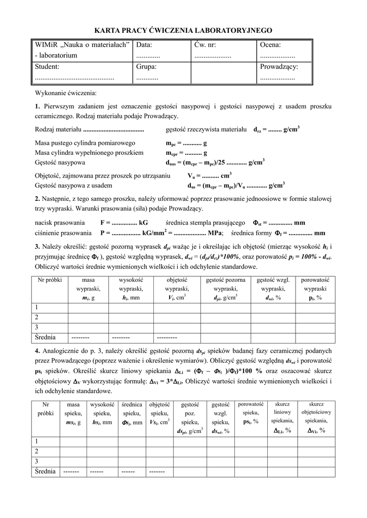 KARTA PRACY ĆWICZENIA LABORATORYJNEGO WIMiR „Nauka o materiałach” - laboratorium Student: ........................................... Ćw. nr: .................... Data: ............. Grupa: ............ Ocena: ................... Prowadzący: ................... Wykonanie ćwiczenia: 1. Pierwszym zadaniem jest oznaczenie gęstości nasypowej i gęstości nasypowej z usadem proszku ceramicznego. Rodzaj materiału podaje Prowadzący. Rodzaj materiału .................................... gęstość rzeczywista materiału Masa pustego cylindra pomiarowego Masa cylindra wypełnionego proszkiem Gęstość nasypowa mpc = ........... g mcpr = .......... g dnas = (mcpr – mpc)/25 ............ g/cm3 Objętość, zajmowana przez proszek po utrząsaniu Gęstość nasypowa z usadem drz = ........ g/cm3 Vu = .......... cm3 dus = (mcpr – mpc)/Vu ............ g/cm3 2. Następnie, z tego samego proszku, należy uformować poprzez prasowanie jednoosiowe w formie stalowej trzy wypraski. Warunki prasowania (siła) podaje Prowadzący. nacisk prasowania średnica stempla prasującego F = ............... kG ciśnienie prasowania 2 P = ................. kG/mm = ................... MPa; st = .............. mm średnica formy f = .............. mm 3. Należy określić: gęstość pozorną wyprasek dpi ważąc je i określając ich objętość (mierząc wysokość hi i przyjmując średnicę f ), gęstość względną wyprasek, dwi = (dpi/drz)*100%, oraz porowatość pi = 100% - dwi. Obliczyć wartości średnie wymienionych wielkości i ich odchylenie standardowe. Nr próbki 1 2 3 Średnia wysokość wypraski, hi, mm masa wypraski, mi, g -------- -------- objętość wypraski, Vi, cm3 gęstość pozorna wypraski, dpi, g/cm3 gęstość wzgl. wypraski, dwi, % porowatość wypraski pi, % --------- 4. Analogicznie do p. 3, należy określić gęstość pozorną dspi spieków badanej fazy ceramicznej podanych przez Prowadzącego (poprzez ważenie i określenie wymiarów). Obliczyć gęstość względną dswi i porowatość psi spieków. Określić skurcz liniowy spiekania Li = (f – si )/f)*100 % oraz oszacować skurcz objętościowy Vwykorzystując formułę: Vi = 3*Li. Obliczyć wartości średnie wymienionych wielkości i ich odchylenie standardowe. Nr próbki 1 2 3 Średnia masa spieku, msi, g wysokość spieku, hsi, mm średnica spieku, si, mm objętość spieku, Vsi, cm3 ------- ------ ------ ------- gęstość poz. spieku, dspi, g/cm3 gęstość wzgl. spieku, dswi, % porowatość spieku, skurcz liniowy skurcz objętościowy psi, % spiekania, spiekania, Li, % Vi, %