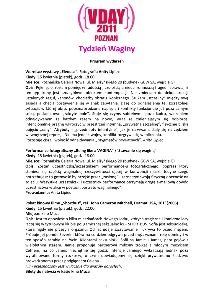Tydzieo Waginy Program wydarzeo Wernisaż wystawy „Eleousa”. Fotografia Anity Lipiec Kiedy: 15 kwietnia (piątek), godz. 18.00 Miejsce: Poznaoska Galeria Nowa, ul. Mielżyoskiego 20 (budynek GBW SA, wejście G) Opis: Pęknięcie, rozłam pomiędzy radością , czułością a nieuchronnością tragedii sprawia, iż ten typ ikony jest szczególnym obiektem kontemplacji. Nie zmierzam do dekonstrukcji ustalonych reguł, kanonów, chociażby obrazu ikonicznego. Szukam „szczeliny” między ową zasadą a chęcią postawienia jej w znak zapytania. Dążę do odnalezienia tej szczególnej sytuacji, w której obraz poprzez zrodzone napięcia i konflikty funkcjonuje już poza samym sobą, posiada owo „zakryte pole”. Staje się czymś subtelnym spoza kadru, widzeniem odnajdywanym za każdym razem na nowo, wraz ze zmieniającym się odbiorcą. Intencjonalnie pragnę wkroczyd w przestrzeo intymną, „prywatną szczelinę”, fizycznie bliską pojęciu „rany”. Atrybuty - „przedmioty infantylne”, jak je nazywam, stały się narzędziem wewnętrznej represji. Nie ma jednak wojny, konflikt rozgrywa się w milczeniu. Pozostaje cisza i wolnośd odnajdywania „ stygmatów prywatnych”. Anita Lipiec Performance fotograficzny „Being like a VAGINA” /”Stawanie się waginą” Kiedy: 15 kwietnia (piątek), godz. 18.00 Miejsce: Poznaoska Galeria Nowa, ul. Mielżyoskiego 20 (budynek GBW SA, wejście G) Opis: Zostao uczestniczką/uczestnikiem performance-u fotograficznego, poprzez który staniesz się częścią waginalnej rzeczywistości ujętej w konwencji maski. Jedyne czego potrzebujesz to gotowośd by przejśd przez „zasłonę” i zaznaczyd swoją fizyczną obecnośd na zdjęciu. Wszystkie uczestniczki i uczestnicy performance otrzymają drogą e-mailową dowód uczestnictwa w akcji w postaci „portretu waginalnego”. Prowadzenie: Anita Lipiec Pokaz kinowy filmu „Shortbus”, reż. John Cameron Mitchell, Dramat USA, 101’ (2006) Kiedy: 15 kwietnia (piątek), godz. 22.00 Miejsce: kino Muza Opis: Jest to opowieśd o kilku mieszkaocach Nowego Jorku, których tragiczne i komiczne losy łączą się w tytułowym klubie poligamicznej seksualności – SHORTBUS. Sofia jest seksuolożką, która nigdy nie przeżyła orgazmu. Od lat udaje szczytowanie i ukrywa to przed mężem. Próbuje jej pomóc Severin, która na co dzieo odgrywa przed mężczyznami rolę dominy i w ten sposób zarabia na życie. Klientami seksuolożki Sofii są Jamie i James, para gejów z wieloletnim stażem. Jamie proponuje partnerowi miłosny trójkąt z młodym muzykiem Cethem, na co James niechętnie się godzi. Intencje Jamiego wykraczają jednak poza wyrafinowane formy rozkoszy, o czym dowiadujemy się dzięki prywatnemu śledztwu prowadzonemu przez podglądacza Caleba... Film przeznaczony jest wyłącznie dla widzów dorosłych. Bilety do nabycia w kasie kina Muza 1 Warsztaty Taoca Flamenco Kiedy: 16 kwietnia (sobota), godz. 16.00 Miejsce: Szkoła Flamenco La Tormenta, Poznao, ul. Zielona 8 (wejście od ul. Długiej) Opis: Kobiecy wdzięk, kobieca siła, rytm, pasja, czysta energia - z takimi pojęciami kojarzy mi się flamenco. Taniec pozwala na oderwanie się od rzeczywistości przy jednoczesnym wyrzuceniu z siebie problemów i trosk oraz wyrażeniu radości i szczęścia towarzyszącego nam na co dzieo. We flamenco ważne aby jest pozwolid ponieśd się rytmowi i dźwiękom gitary, pokonad barierę wstydu i swobodnie poruszad swoim ciałem, bo tylko tak uwalniamy całą swoją zmysłowośd, wrażliwośd i piękno. Prowadzenie: Katarzyna Burgiel „La Tormenta”, www.tormenta.pl Zgłoszenia: Prosimy o zgłoszenie udziału mailem na adres: [email protected] do 10 kwietnia. Koszt: 10 zł. „Władza, język i sny: psychoanaliza a kobiety” Debata panelowa. Udział wezmą: dr Joanna Bednarek (filozofka), mgr Agnieszka Izdebska (UAM, seksuolożka) oraz Andrzej Marzec (UAM, filozof). Prowadzenie: Marianna Szczygielska Kiedy: 16 kwietnia (sobota), godz. 16.00 Miejsce: Poznaoska Galeria Nowa, ul. Mielżyoskiego 20 (budynek GBW SA, wejście G) Opis: „Waginatyzm”. Prace Iwony Demko. Otwarcie wystawy oraz wykład artystki. Kiedy: : 16 kwietnia (sobota), godz. 19.00 Miejsce: Poznaoska Galeria Nowa, ul. Mielżyoskiego 20 (budynek GBW SA, wejście G) Opis: Iwona Demko, rzeźbiarka, artystka, feministka. Jest znana przede wszystkim z podejmowania tematu kobiecej seksualności, a dokładniej: waginy. Trzeba niestety przyznad, że w naszej obecnej kulturze słowo "wagina" wywołuje głównie uczucie zażenowania. Jest tematem wstydliwym, bądź tematem, który łączy się raczej z prowokacją, niż z poważnym tematem godnym dyskusji. Byd może dzieje się tak, ponieważ zostaliśmy wychowani w chrześcijaoskim kręgu, w którym otaczanie kultem waginy to wręcz bluźnierstwo, ponieważ wagina jest uosobieniem zła i zakazanej seksualności. Nie zdajemy sobie jednak zupełnie sprawy z tego, że kiedyś ludzie całkowicie inaczej postrzegali ten kobiecy narząd płciowy... W naszej fallogocentrycznej rzeczywistości prace Iwony Demko wynoszą waginę na ołtarze, tak symbolicznie, jak i dosłownie. Poprzez uroczą i infantylną formę artystka odczarowuje klątwę wstydu i wstrętu towarzyszącą menstruacji i kobiecej cielesności. Intymnośd przedstawiona za pomocą pluszu, czerwonych cekinów, koralików czy futerka, owinięta w różowy aksamit tworzy swoisty „kult waginy”. 2 Waginalne warsztaty artystyczne Kiedy: 17 kwietnia (niedziela), godz. 13.00 Miejsce: Poznaoska Galeria Nowa, ul. Mielżyoskiego 20 (budynek GBW SA, wejście G) Opis: Zapraszamy wszystkie chętne kobiety i dziewczyny na kreatywne warsztaty artystyczne. Wagina, cipa, cipka – strasznie brzydkie słowa? O nie! Podczas naszego spotkania odczarujemy to tabu i wyruszymy na poszukiwanie waginalnej twórczej energii! Pokażemy Wam, jak samodzielnie zaprojektowad, a następnie wyciąd i odbid szablon, którym możecie ozdobid ubranie, torbę