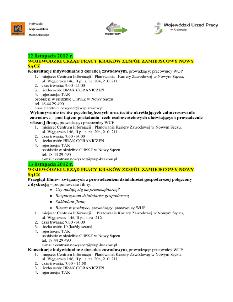 12 listopada 2012 r. WOJEWÓDZKI URZĄD PRACY KRAKÓW ZESPÓŁ ZAMIEJSCOWY NOWY SĄCZ Konsultacje indywidualne z doradcą zawodowym, prowadzący: pracownicy WUP 1. miejsce: Centrum Informacji i Planowania Kariery Zawodowej w Nowym Sączu, ul. Węgierska 146, II p., s. nr 204, 210, 211 2. czas trwania: 9.00 -15.00 3. liczba osób: BRAK OGRANICZEŃ 4. rejestracja: TAK osobiście w siedzibie CIiPKZ w Nowy Sączu tel. 18 44 29 490 e-mail: [email protected] Wykonywanie testów psychologicznych oraz testów określających zainteresowania zawodowe – pod kątem posiadania cech osobowościowych ułatwiających prowadzenie własnej firmy, prowadzący: pracownicy WUP 1. miejsce: Centrum Informacji i Planowania Kariery Zawodowej w Nowym Sączu, ul. Węgierska 146, II p., s. nr 204, 210, 211 2. czas trwania: 9.00 -14.00 3. liczba osób: BRAK OGRANICZEŃ 4. rejestracja: TAK osobiście w siedzibie CIiPKZ w Nowy Sączu tel. 18 44 29 490 e-mail: [email protected] 13 listopada 2012 r. WOJEWÓDZKI URZĄD PRACY KRAKÓW ZESPÓŁ ZAMIEJSCOWY NOWY SĄCZ Przegląd filmów związanych z prowadzeniem działalności gospodarczej połączony z dyskusją – proponowane filmy: Czy nadaję się na przedsiębiorcę? Rozpoczynam działalność gospodarczą Zakładam firmę Biznes w praktyce, prowadzący: pracownicy WUP 1. miejsce: Centrum Informacji i Planowania Kariery Zawodowej w Nowym Sączu, ul. Węgierska 146, II p., s. nr 212 2. czas trwania: 9.00 -14.00 3. liczba osób: 10 (każdy seans) 4. rejestracja: TAK osobiście w siedzibie CIiPKZ w Nowy Sączu tel. 18 44 29 490 e-mail: [email protected] Konsultacje indywidualne z doradcą zawodowym, prowadzący: pracownicy WUP 1. miejsce: Centrum Informacji i Planowania Kariery Zawodowej w Nowym Sączu, ul. Węgierska 146, II p., s. nr 204, 210, 211 2. czas trwania: 9.00 - 15.00 3. liczba osób: BRAK OGRANICZEŃ 4. rejestracja: TAK osobiście w siedzibie CIiPKZ w Nowy Sączu tel. 18 44 29 490 e-mail: [email protected] 14 listopada 2012 r. WOJEWÓDZKI URZĄD PRACY KRAKÓW ZESPÓŁ ZAMIEJSCOWY NOWY SĄCZ Warsztat: Własna firma – zanim zrealizujesz pomysł, część I, prowadzący: Teresa Kupis, Monika Kulig 1. miejsce: Centrum Informacji i Planowania Kariery Zawodowej Nowy Sącz, ul. Węgierska 146, II p., s. nr 212 2. czas trwania: 9.00 - 14.00 3. liczba osób: 10 4. rejestracja: TAK osobiście w siedzibie CIiPKZ w Nowy Sączu tel. 18 44 29 490 e-mail: [email protected] Krótki opis działania: Trzydniowy warsztat adresowany do ludzi młodych, a także wszystkich poszukujących swojego miejsca na rynku pracy i rozważających możliwość podjęcia działalności gospodarczej. Biorąc udział w zajęciach uczestnicy: poznają własne cele i predyspozycje istotne w prowadzeniu firmy, zdobędą wiedzę przydatną w projektowaniu własnego przedsięwzięcia, dowiedzą się, jakie formalności należy spełnić, aby założyć firmę. Program warsztatu obejmuje trzy podstawowe obszary, nad którymi warto się zastanowić i poddać szczegółowej analizie. Są to: własne cechy i predyspozycje, pomysł na biznes, uwarunkowania rynkowe. 15 listopada 2012 r. WOJEWÓDZKI URZĄD PRACY KRAKÓW ZESPÓŁ ZAMIEJSCOWY NOWY SĄCZ Warsztat: Własna firma – zanim zrealizujesz pomysł, część II, prowadzący: Teresa Kupis, Monika Kulig 1. miejsce: Centrum Informacji i Planowania Kariery Zawodowej Nowy Sącz, ul. Węgierska 146, II p.,s. nr 212 2. czas trwania: 9.00 - 14.00 3. liczba osób: 10 4. rejestracja: TAK osobiście w siedzibie CIiPKZ w Nowy Sączu tel. 18 44 29 490 e-mail: [email protected] Krótki opis działania: Trzydniowy warsztat adresowany do ludzi młodych, a także wszystkich poszukujących swojego miejsca na rynku pracy i rozważających możliwość podjęcia działalności gospodarczej. Biorąc udział w zajęciach uczestnicy: poznają własne cele i predyspozycje istotne w prowadzeniu firmy, zdobędą wiedzę przydatną w projektowaniu własnego przedsięwzięcia, dowiedzą się, jakie formalności należy spełnić, aby założyć firmę. Program warsztatu obejmuje trzy podstawowe obszary, nad którymi warto się zastanowić i poddać szczegółowej analizie. Są to: własne cechy i predyspozycje, pomysł na biznes, uwarunkowania rynkowe. 16 listopada 2012 r. WOJEWÓDZKI URZĄD PRACY KRAKÓW ZESPÓŁ ZAMIEJSCOWY NOWY SĄCZ Warsztat: Własna firma – zanim zrealizujesz pomysł, część III, prowadzący: Teresa Kupis 1. miejsce: Centrum Informacji i Planowania Kariery Zawodowej Nowy Sącz, ul. Węgierska 146,IIp., s. nr 212 2. czas trwania: 9.00 - 14.00 3. liczba osób: 10 4. rejestracja: TAK osobiście w siedzibie CIiPKZ w Nowy Sączu tel. 18 44 29 490 e-mail: [email protected] Krótki opis działania: Trzydniowy warsztat adresowany do ludzi młodych, a także wszystkich poszukujących swojego miejsca na rynku pracy i rozważających możliwość podjęcia działalności gospodarczej. Biorąc udział w zajęciach uczestnicy: poznają własne cele i predyspozycje istotne w prowadzeniu firmy, zdobędą wiedzę przydatną w projektowaniu własnego przedsięwzięcia, dowiedzą się, jakie formalności należy spełnić, aby założyć firmę. Program warsztatu obejmuje trzy podstawowe obszary, nad którymi warto się zastanowić i poddać szczegółowej analizie. Są to: własne cechy i predyspozycje, pomysł na biznes, uwarunkowania rynkowe. Gra: „Cashflow”, prowadzący: Monika Kulig 1. miejsce: Centrum Informacji i Planowania Kariery Zawodowej w Nowym Sączu, ul. Węgierska 146, II p. , s. nr 2012 2. czas trwania: 12.00 -15.00 3. liczba osób: 10 4. rejestracja: TAK osobiście w siedzibie CIiPKZ w Nowy Sączu tel. 18 44 29 490 e-mail: [email protected] Krótki opis działania: Ta popularna edukacyjna gra planszowa stworzona została przez autora książek z serii „Bogaty ojciec, biedny ojciec" - Roberta Kiyosaki. Gra prowadzi do intensywnego rozwoju inteligencji finansowej i uruchomienia potencjalnych zdolności biznesowych. Cashflow uczy rachunkowości, 