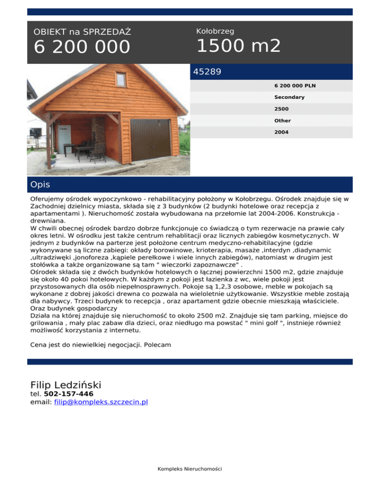 Kołobrzeg OBIEKT na SPRZEDAŻ 1500 m2 6 200 000 45289 6 200 000 PLN Secondary 2500 Other 2004 Opis Oferujemy ośrodek wypoczynkowo - rehabilitacyjny położony w Kołobrzegu. Ośrodek znajduje się w Zachodniej dzielnicy miasta, składa się z 3 budynków (2 budynki hotelowe oraz recepcja z apartamentami ). Nieruchomość została wybudowana na przełomie lat 2004-2006. Konstrukcja drewniana. W chwili obecnej ośrodek bardzo dobrze funkcjonuje co świadczą o tym rezerwacje na prawie cały okres letni. W ośrodku jest także centrum rehablitacji oraz licznych zabiegów kosmetycznych. W jednym z budynków na parterze jest położone centrum medyczno-rehabitilacyjne (gdzie wykonywane są liczne zabiegi: okłady borowinowe, krioterapia, masaże ,interdyn ,diadynamic ,ultradziwęki ,jonoforeza ,kąpiele perełkowe i wiele innych zabiegów), natomiast w drugim jest stołówka a także organizowane są tam " wieczorki zapoznawcze" . Ośrodek składa się z dwóch budynków hotelowych o łącznej powierzchni 1500 m2, gdzie znajduje się około 40 pokoi hotelowych. W każdym z pokoji jest łazienka z wc, wiele pokoji jest przystosowanych dla osób niepełnosprawnych. Pokoje są 1,2,3 osobowe, meble w pokojach są wykonane z dobrej jakości drewna co pozwala na wieloletnie użytkowanie. Wszystkie meble zostają dla nabywcy. Trzeci budynek to recepcja , oraz apartament gdzie obecnie mieszkają właściciele. Oraz budynek gospodarczy Działa na której znajduje się nieruchomość to około 2500 m2. Znajduje się tam parking, miejsce do grilowania , mały plac zabaw dla dzieci, oraz niedługo ma powstać " mini golf ", instnieje również możliwość korzystania z internetu. Cena jest do niewielkiej negocjacji. Polecam Filip Ledziński tel. 502-157-446 email: [email protected] Kompleks Nieruchomości Powered by TCPDF (www.tcpdf.org)