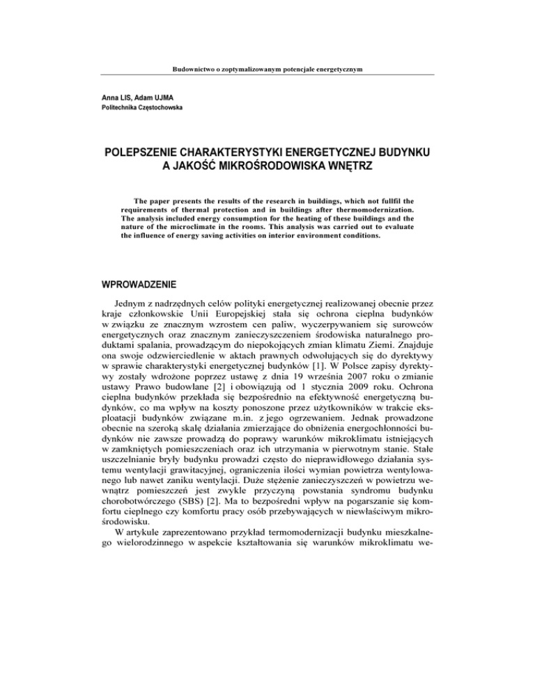 Budownictwo o zoptymalizowanym potencjale energetycznym Anna LIS, Adam UJMA Politechnika Częstochowska POLEPSZENIE CHARAKTERYSTYKI ENERGETYCZNEJ BUDYNKU A JAKOŚĆ MIKROŚRODOWISKA WNĘTRZ The paper presents the results of the research in buildings, which not fullfil the requirements of thermal protection and in buildings after thermomodernization. The analysis included energy consumption for the heating of these buildings and the nature of the microclimate in the rooms. This analysis was carried out to evaluate the influence of energy saving activities on interior environment conditions. WPROWADZENIE Jednym z nadrzędnych celów polityki energetycznej realizowanej obecnie przez kraje członkowskie Unii Europejskiej stała się ochrona cieplna budynków w związku ze znacznym wzrostem cen paliw, wyczerpywaniem się surowców energetycznych oraz znacznym zanieczyszczeniem środowiska naturalnego produktami spalania, prowadzącym do niepokojących zmian klimatu Ziemi. Znajduje ona swoje odzwierciedlenie w aktach prawnych odwołujących się do dyrektywy w sprawie charakterystyki energetycznej budynków [1]. W Polsce zapisy dyrektywy zostały wdrożone poprzez ustawę z dnia 19 września 2007 roku o zmianie ustawy Prawo budowlane [2] i obowiązują od 1 stycznia 2009 roku. Ochrona cieplna budynków przekłada się bezpośrednio na efektywność energetyczną budynków, co ma wpływ na koszty ponoszone przez użytkowników w trakcie eksploatacji budynków związane m.in. z jego ogrzewaniem. Jednak prowadzone obecnie na szeroką skalę działania zmierzające do obniżenia energochłonności budynków nie zawsze prowadzą do poprawy warunków mikroklimatu istniejących w zamkniętych pomieszczeniach oraz ich utrzymania w pierwotnym stanie. Stałe uszczelnianie bryły budynku prowadzi często do nieprawidłowego działania systemu wentylacji grawitacyjnej, ograniczenia ilości wymian powietrza wentylowanego lub nawet zaniku wentylacji. Duże stężenie zanieczyszczeń w powietrzu wewnątrz pomieszczeń jest zwykle przyczyną powstania syndromu budynku chorobotwórczego (SBS) [2]. Ma to bezpośredni wpływ na pogarszanie się komfortu cieplnego czy komfortu pracy osób przebywających w niewłaściwym mikrośrodowisku. W artykule zaprezentowano przykład termomodernizacji budynku mieszkalnego wielorodzinnego w aspekcie kształtowania się warunków mikroklimatu we- 130 A. Lis, A. Ujma wnątrz pomieszczeń. W latach 2004-2011 prowadzony był w nim monitoring efektów wykonanej termomodernizacji. 1. WYMAGANIA DOTYCZĄCE OCHRONY CIEPLNEJ BUDYNKÓW I OSZCZĘDNOŚCI ENERGII Zagadnienia ochrony cieplnej związane są bezpośrednio, lecz nie tylko, z oszczędnością energii. Celem ochrony cieplnej jest m.in.: − ograniczenie zapotrzebowania na energię do racjonalnego poziomu, − obniżenie kosztów eksploatacji budynków, − zapewnienie odpowiednich warunków mikroklimatu wnętrz, − ochrona przed przegrzewaniem pomieszczeń, − zapewnienie odpowiednich warunków komfortu cieplnego osób przebywających w pomieszczeniach, − zmniejszenie zanieczyszczenia powietrza, − ochrona przegród budowlanych przed szkodami wywołanymi ich zawilgoceniem. Działania mające na celu zapewnienie odpowiedniej ochrony cieplnej budynków oparte są na wymaganiach zawartych w przepisach Prawa budowlanego [3]. Według artykułu 5 tej ustawy, obiekt budowlany należy projektować i budować w sposób określony w przepisach, w tym techniczno-budowlanych, oraz zgodnie z zasadami wiedzy technicznej, zapewniając spełnienie wymagań podstawowych dotyczących oszczędności energii i odpowiedniej izolacyjności cieplnej przegród. W ramach projektowania i wznoszenia budynku należy zapewnić również właściwe warunki użytkowe, zgodne z przeznaczeniem obiektu, w zakresie zaopatrzenia w energię cieplną i elektryczną, przy założeniu efektywnego wykorzystania tych czynników oraz możliwości utrzymania właściwego stanu technicznego budynku. Wśród wymagań, które musi spełnić budynek oddawany do użytkowania (artykuł 5, punkt 3) z wyjątkiem pewnej grupy obiektów m.in. wpisanych do rejestru zabytków oraz objętych ochroną konserwatorską, znajduje się również wymóg ustalenia charakterystyki energetycznej, określającej wielkość energii wyrażoną w kWh/m2/rok, niezbędnej do zaspokojenia różnych potrzeb związanych z użytkowaniem budynku, przedstawionej w formie świadectwa. Świadectwo charakterystyki energetycznej powinno więc być gwarancją jakości energetycznej budynku. Spełnienie wymagań ochrony cieplnej związane jest z koniecznością utrzymania odpowiedniego stanu technicznego budynków w trakcie eksploatacji. Użytkowanie budynku powinno być zgodne z jego przeznaczeniem i wymaganiami ochrony środowiska (artykuł 5, punkt 2). Budynek powinno utrzymywać się w należytym stanie technicznym i estetycznym, nie dopuszczając do nadmiernego pogorszenia jego właściwości użytkowych i sprawności technicznej. Obowiązek spełnienia tych wymagań wynika także z artykułu 61. Zgodnie z artykułem 62, przepisy nakazują okresową kontrolę co najmniej raz w roku stanu technicznego elementów budynku narażonych na szkodliwe wpływy atmosferyczne i niszczące Polepszenie charakterystyki energetycznej budynku a jakość mikrośrodowiska wnętrz 131 działania czynników występujących podczas użytkowania obiektu oraz co najmniej raz na 5 lat sprawdzanie stanu technicznego obiektu budowlanego i jego przydatności do użytkowania, w tym także jego estetyki. Niewłaściwe użytkowanie budynków, zwłaszcza energooszczędnych, może zwiększyć ich energochłonność oraz prowadzić do pogorszenia stanu technicznego, co w konsekwencji może spowodować pogorszenie ich charakterystyki energetycznej. Nieuzyskiwanie przez budynek odpowiednich wartości cieplnych wpływa na zwiększenie częstotliwości i zakresu prac remontowo-naprawczych. Uszczegółowienie wymagań warunków ochrony 