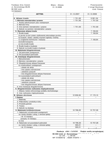 Fundacja Arna Canem ul. Żeromskiego 85/25 90-502 Łódź 7272609457 Przeznaczenie: I Urząd Skarbowy Łódź Polesie Bilans - Aktywa 31.12.2008 AKTYWA 31.12.2007 A. Aktywa trwałe 1. Wartości niematerialne i prawne 1. Koszty zakończonych prac rozwojowych 2. Wartość firmy 3. Inne wartości niematerialne i prawne 4. Zaliczki na wartości niematerialne i prawne II. Rzeczowe aktywa trwałe 1. Środki trwałe a) grunty (w tym prawo użytkowania wieczystego gruntu) b) budynki, lokale i obiekty inżynierii lądowej i wodnej c) urządzenia techniczne i maszyny d) środki transportu e) inne środki trwałe 2. Środki trwałe w budowie 3. Zaliczki na środki trwałe w budowie III. Należności długoterminowe 1. Od jednostek powiązanych 2. Od pozostałych jednostek IV. Inwestycje długoterminowe 1. Nieruchomości 2. Wartości niematerialne i prawne 3. Długoterminowe aktywa finansowe a) w jednostkach powiązanych - udziały lub akcje - inne papiery wartościowe - udzielone pożyczki - inne długoterminowe aktywa finansowe b) w pozostałych jednostkach - udziały lub akcje - inne papiery wartościowe - udzielone pożyczki - inne długoterminowe aktywa finansowe 4. Inne inwestycje długoterminowe V. Długoterminowe rozliczenia międzyokresowe 1. Aktywa z tytułu odroczonego podatku dochodowego 2. Inne rozliczenia międzyokresowe B. Aktywa o b r o t o w e I. Zapasy 1. Materiały 2. Półprodukty i produkty w toku 3. Produkty gotowe 4. Towary 5. Zaliczki na dostawy II. Należności krótkoterminowe 1. Należności od jednostek powiązanych a) z tytułu dostaw i usług, o okresie spłaty: - do 12 miesięcy -powyżej 12 miesięcy b) inne 2. Należności od pozostałych jednostek a) z tytułu dostaw i usług, o okresie spłaty: - do 12 miesięcy 31.12.2008 1 751,00 1 751,00 8 901,04 1 751,00 1 751,00 1 751,00 - 7 150,04 7 150,04 - 7 150,04 12 059,36 - 17 172,15 10 798,20 - 13 757,28 - - - - 10 798,20 593,21 593,21 13 757,28 A -—i Podpis osotfy zarządzającej Fundacja AMA CANEM a S / 90-502 Łódź ul Żeromskiego te! (04. , • j 46 24 NIP 72726094 5/ ,<EGON 4732076 •> 2 ^ ^ ^ ^ _ ^ ° ^ Fundacja Ama Canem ul. Żeromskiego 85/25 90-502 Łódź 7272609457 Bilans - Aktywa 31.12.2008 -powyżej 12 miesięcy b) z tytułu podatków, dotacji, ceł, ubezpieczeń społecznych i zdrowotnych oraz innych świadczeń c) inne d) dochodzone na drodze sądowej III. Inwestycje krótkoterminowe 1. Krótkoterminowe aktywa finansowe a) w jednostkach powiązanych - udziały lub akcje - inne papiery wartościowe - udzielone pożyczki - inne krótkoterminowe aktywa finansowe b) w pozostałych jednostkach - udziały lub akcje - inne papiery wartościowe - udzielone pożyczki - inne krótkoterminowe aktywa finansowe c) środki pieniężne i inne aktywa pieniężne - środki pieniężne w kasie i na rachunkach - inne środki pieniężne - inne aktywa pieniężne 2. Inne inwestycje krótkoterminowe IV. Krótkoterminowe rozliczenia międzyokresowe AKTYWA RAZEM Przeznaczenie: I Urząd Skarbowy Łódź Polesie 10 204,99 13 757,28 1 261,16 1 261,16 - 3 414,87 3 414,87 - - - 1 261,16 1 261,16 3 414,87 3 414,87 13 810,36 26 073,19 fundacja AM CANEM 90-502 Łódź u! Żeromskiego 85/ ¿'s te! |C4. • J 46 24 NIP 7 ^ 2 ^ 4 ^ < ^ ^ ? 0 7 ^ 0 o 2 b Fundacja Ama Canem Ul. Żeromskiego 85/25 90-502 Łódź NIP 7272609457 Przeznaczenie: Urząd Skarbowy Łódź Polesie Bilans - Pasywa na dzień 31.12.2008 PASYWA A. Kapitał (fundusz) własny 1. Kapitał (fundusz) podstawowy II. Należne wpłaty na kapitał podstawowy (wielkość ujer III. Udziały (akcje) własne (wielkość ujemna) IV. Kapitał (fundusz) zapasowy V. Kapitał (fundusz) z aktualizacji wyceny VI. Pozostałe kapitały (fundusze) rezerwowe VII. Zysk (strata) z lat ubiegłych VIII. Zysk (strata) netto IX. Odpisy z zysku netto wciągu roku obrotowego (wielki B. Zobowiązania i rezerwy na zobowiązania 1. Rezerwy na zobowiązania 1. Rezerwa z tytułu odroczonego podatku dochodowego 2. Rezerwa na świadczenia emerytalne i podobne - długoterminowa - krótkoterminowa 3. Pozostałe rezerwy - długoterminowe - krótkoterminowe II. Zobowiązania długoterminowe 1. Wobec jednostek powiązanych 2. Wobec pozostałych jednostek a) kredyty i pożyczki b) z tytułu emisji dłużnych papierów wartościowych c) inne zobowiązania finansowe d) inne III. Zobowiązania krótkoterminowe 1. Wobec jednostek powiązanych a) z tytułu dostaw i usług, o okresie wymagalności: - do 12 miesięcy - powyżej 12 miesięcy b) inne 2. Wobec pozostałych jednostek a) kredyty i pożyczki b) z tytułu emisji dłużnych papierów wartościowych c) inne zobowiązania finansowe d) z tytułu dostaw i usług, o okresie wymagalności: - do 12 miesięcy - powyżej 12 miesięcy e) zaliczki otrzymane na dostawy f) zobowiązania wekslowe g) z tytułu podatków, ceł, ubezpieczeń i innych świadcz h) z tytułu wynagrodzeń i) inne 3. Fundusze specjalne IV. Rozliczenia międzyokresowe 1. Ujemna wartość firmy 2. Inne rozliczenia międzyokresowe - długoterminowe - krótkoterminowe P A S Y W A R A Z E M ARRA LEASING'iNKASj" : Stan na dzień 31.12.2008 22 759,36 zł 7 670,85 zł -51,99 zł 7 619,04 zł 15 140,32 zł 6 191,50 zł 0,00 zł 3 313,83 zł 0,00 zł 0,00 zł 0,00 zł 0,00 zł 0,00 zł 0,00 zł 0,00 zł 0,00 zł 0,00 zł 6 191,50 zł 0,00 zł 0,00 zł 3 313,83 zł 0,00 zł 0,00 zł 6 191,50 zł 3 313,83 zł 6 191,50 zł 3 313,83 zł 0,00 zł 0,00 zł 0,00 zł 0,00 zł 1 3 8 1 0 , 3 6 * ilJLl^ 26 073,19 zł .-/qV ' L - 7 ' \ O ^ J a * | S 0 ? o t ) y zarządzającej »3-557 Bdź, ai. Nodi»* NIP 726-00 34-413 MM 470848565 - i / m v ' 0 4 2 ) 64879 44 . .,-o-il. aU'[email protected]|A Stan na dzień 31.12.2007 7 618,86 zł s s ° Fundacja Arna Canem ul. Żeromskiego 85/25 90-502 Łódź NIP 7272609457 Rachunek zysków i strat na dzień 31.12.2008 Przeznaczenie: Urząd Skarbowy Łódź Polesie 31.12.2007 A. Przychody netto ze sprzedaży i zrównanie z nimi w tym: - od jednostek powiązanych I. Przychody nett