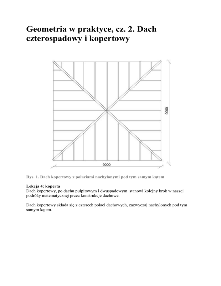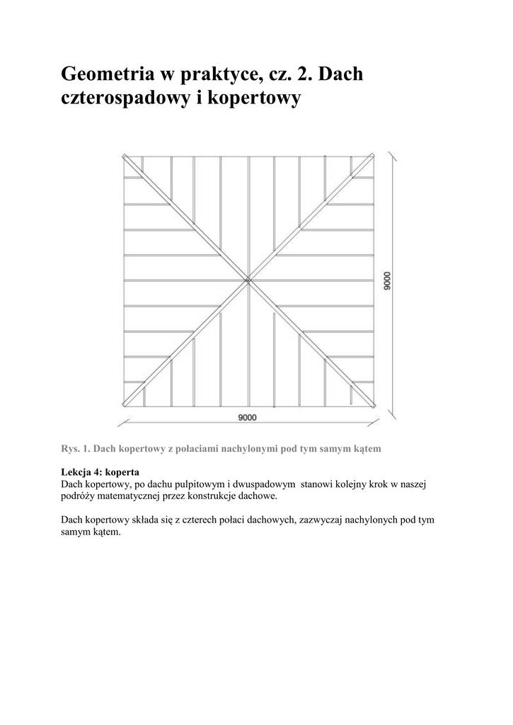 Geometria w praktyce, cz. 2. Dach czterospadowy i kopertowy Rys. 1. Dach kopertowy z połaciami nachylonymi pod tym samym kątem Lekcja 4: koperta Dach kopertowy, po dachu pulpitowym i dwuspadowym stanowi kolejny krok w naszej podróży matematycznej przez konstrukcje dachowe. Dach kopertowy składa się z czterech połaci dachowych, zazwyczaj nachylonych pod tym samym kątem. Rys. 2 Gdzie: H – wysokość dachu h – wysokość połaci dachowej AB, BC, CD, DA – długości podstaw połaci dachowych E – wierzchołek dachu B – kąt nachylenia połaci dachowej, tu: 45o Musimy jeszcze zauważyć, że w naszym przypadku rzut wierzchołka dachu przypada dokładnie na środku rzutu dachu. Zatem długość odcinka GF jest równy połowie długości odcinka AB, zatem jest to 4,5 m. Dach kopertowy składa się z czterech trójkątnych połaci, potrzebny więc będzie podstawowy wzór na pole trójkąta: gdzie: a – podstawa trójkąta h – wysokość trójkąta Przyjrzyjmy się rzutowi perspektywicznemu dachu kopertowego. Powierzchnia połaci ADE będzie wynosić: Jak możemy zauważyć, nie znamy wysokości naszej połaci. Musimy ją więc obliczyć. Przydatna będzie tu funkcja tangens (tangens kąta alfa to stosunek długości przyprostokątnej leżącej naprzeciw kata alfa do długości drugiej przyprostokątnej). Dla naszych oznaczeń: Po przekształceniach otrzymujemy Tg beta dla 45º jest równy 1 (wartość odczytujemy z tabeli wartości funkcji trygonometrycznych dla kątów w trójkącie). Zatem wysokość H dachu jest równa długości GF – wysokość jest równa 4,5 m. Korzystając z twierdzenia Pitagorasa możemy teraz swobodnie obliczyć wysokość wysokość połaci dachowej: zatem Mając już wysokość połaci możemy obliczyć jej powierzchnię. Jako że założyliśmy równość kąta nachylenia wszystkich połaci, to powierzchnia całego dachu będzie równa czterokrotności powierzchni połaci AED. Lekcja 5: koperta z kalenicą, czyli dach czterospadowy Dach czterospadowy może mieć dwie pary połaci o tym samym kącie nachylenia lub też każda z czterech połaci dachowych charakteryzuje się innym kątem pochylenia Przekroje dachu o dwóch parach połaci o tym samym kącie nachylenia prezentuje rys. 3, zaś rzut perspektywiczny prezentuje rys. 4. Rys. 3. Dach z dwiema połaciami o takim samym kącie nachylenia Rys. 4. Dach z rys. 3 w rzucie perspektywicznym Zatem obliczmy powierzchnię dachu o rzucie z rys. 4. Przyjmijmy następujące założenia: • • kąt beta, alfa są sobie równe i wynoszą 70º zaś kąty gamma, sigma wynoszą 60º , długości boków AA’ i FE i F’E’ są sobie równe i wynoszą 8 m, zaś EE’, BB’ i FF’ mają po 12 m. W związku z faktem, że mamy do czynienia z trójkątem równoramiennym AA’C, wysokość H dzieli podstawę na dwie równe części AI = IA’. Pierwszą rzeczą, którą musimy zrobić to wyliczenie wysokości dachu H. Korzystając z twierdzenia tangensów mamy: Mając wysokość dachu możemy obliczyć wysokość połaci 1 i 3: Możemy teraz wyliczyć z pola powierzchni trójkąta wyliczyć pole połaci 1 i 3: Pola połaci 1 i 3 są sobie równe. Kolejnym krokiem będzie wyliczenie długości odcinka a z trójkąta BDC. Odcinek ten odpowiada długościom odcinków EG i E’G’. Tu możemy już skorzystać z twierdzenia Pitagorasa: Kolejnym etapem jest przypomnienie sobie wzoru na pole powierzchni trapezu: Ptrapezu = 1/2 (a + b) • h Wzór ten jest nam niezbędny, aby policzyć powierzchnię połaci ECC’E’ (rys. 5). Zatem musimy znaleźć długości boków EE’ i CC’: Odcinek EE’ = EG + GG’ + G’E’ 12 m = 1,20 m + GG’+ 1,20 m GG’= CC’ = 9,60 m Wysokość h2 połaci 2 jest równa: Teraz mamy wszystkie dane do wyliczenia pola połaci (EE’ CC’): Pola połaci 2 i 4 są sobie równe. Pole powierzchni dachu jest równe sumie pól połaci 1 do 4: Powierzchnia dachu = P P dachu połaci 1 + P połaci 2 + P połaci 3 +P połaci 4 = 141,32 m2 Jak widać, nie trzeba znać zaawansowanej matematyki, żeby prawidłowo wyliczyć powierzchnię dachu. W kolejnej części zajmiemy się wyliczaniem długości krawędzi, powierzchni połaci dachu czterospadowego o wszystkich czterech kątach nachylenia połaci różnych od siebie, a także dachami mansardowymi. Monika A. Tomaszewska-Rzęsista Przedstawione rysunki mają charakter poglądowy i w żaden sposób nie mogą być traktowane jako wskazówki konstrukcyjne. Źródło: Dachy, nr 1 (133) 2011 Usługi Ciesielskie - domy drewniane - domy szkieletowe - konstrukcje dachowe więźby - www.lechbud.org