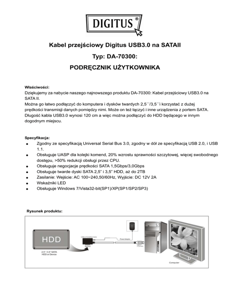Kabel przejściowy Digitus USB3.0 na SATAII Typ: DA-70300: PODRĘCZNIK UŻYTKOWNIKA Właściwości: Dziękujemy za nabycie naszego najnowszego produktu DA-70300: Kabel przejściowy USB3.0 na SATA II. Można go łatwo podłączyć do komputera i dysków twardych 2,5´´/3,5´´i korzystać z dużej prędkości transmisji danych pomiędzy nimi. Może on też łączyć i inne urządzenia z portem SATA. Długość kabla USB3.0 wynosi 120 cm a więc można podłączyć do HDD będącego w innym dogodnym miejscu. Specyfikacja: ● ● ● ● ● ● ● Zgodny ze specyfikacją Universal Serial Bus 3.0, zgodny w dół ze specyfikacją USB 2.0, i USB 1.1. Obsługuje UASP dla kolejki komend, 20% wzrostu sprawności szczytowej, więcej swobodnego dostępu, >50% redukcji obsługi przez CPU. Obsługuje negocjacje prędkości SATA 1,5Gbps/3,0Gbps Obsługuje twarde dyski SATA 2,5” i 3,5” HDD, aż do 2TB Zasilanie: Wejście: AC 100~240,50/60Hz, Wyjście: DC 12V 2A Wskaźniki LED Obsługuje Windows 7/Vista32-bit(SP1)/XP(SP1/SP2/SP3) Rysunek produktu: 2.5”/3.5” SATA HDD or Device USB 3.0 TO SATA II Cable SATA II Power adapter USB 3.0 A Type Male Computer HDD 2,5”/3,5” SATA lub urządzenie Kabel USB 3.0 DO SATA II SATA II Zasilacz USB 3.0 A męskie Komputer UŻYTKOWANIE: 1. Sprawdzić czy twardy dysk, kabel przejściowy USB3.0 do SATAII i zasilacz AC są gotowe do użycia. 2. Podłączyć port SATA produktu do twardego dysku (urządzenia z portem SATA). 3. Podłączyć zasilanie do produktu; jeśli zadziała prawidłowo to zaświeci się czerwony LED. 4.Podłączyć port USB 3.0 produktu do portu USB3.0 w PC, podłączenie jest prawidłowe jeśli świecą lampki LED, jeśli czerwony i niebieski LED świeci jednocześnie to możliwy jest swobodny dostęp do danych. 5. Twardy dysk zostanie automatycznie wykryty po zakończeniu podłączania, można wówczas uzyskać dostęp do danych. (Migotanie wskaźnika niebieskiego LED oznacza trwającą transmisję danych). UWAGA: 1. Proszę ustawić produkt na biurku lub innej stabilnej powierzchni i zapewnić jego stabilność po połączeniu z twardym dyskiem. Następnie proszę podłączyć zasilanie; nie ruszać twardego dysku gdy pracuje, bo dane zostaną utracone a dysk może się uszkodzić. 2. Jeśli system nie wykrywa urządzenia automatycznie, to należy go sformatować używając “Disk Management” (zarządzanie dyskiem) lub “Disk Utility” (narzędzia dyskowe). 3. Szybkość transmisji danych może sięgać do szybkości USB 3.0 jeśli PC także posiada port USB 3.0 przy dostępie do danych. 4. Jeśli szybkość transmisji nie osiąga prędkości USB 3.0, to proszę sprawdzić czy podłączenie zostało wykonane do kanału USB 3.0. Proszę pamiętać, że są pewne różnice w szybkości transmisji, zależne od twardego dysku.