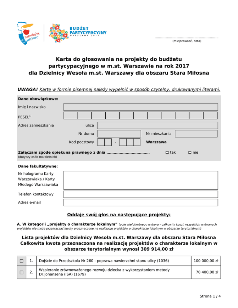 ..................................................................... (miejscowość, data) Karta do głosowania na projekty do budżetu partycypacyjnego w m.st. Warszawie na rok 2017 dla Dzielnicy Wesoła m.st. Warszawy dla obszaru Stara Miłosna UWAGA! Kartę w formie pisemnej należy wypełnić w sposób czytelny, drukowanymi literami. Dane obowiązkowe: Imię i nazwisko PESEL1) Adres zamieszkania ulica Nr domu Kod pocztowy Nr mieszkania - Warszawa Załączam zgodę opiekuna prawnego z dnia ……………………………… tak nie (dotyczy osób małoletnich) Dane fakultatywne: Nr hologramu Karty Warszawiaka / Karty Młodego Warszawiaka Telefon kontaktowy Adres e-mail Oddaję swój głos na następujące projekty: A. W kategorii „projekty o charakterze lokalnym” (pole wielokrotnego wyboru - całkowity koszt wszystkich wybranych projektów nie może przekraczać kwoty przeznaczone na realizację projektów o charakterze lokalnym w obszarze terytorialnym) Lista projektów dla Dzielnicy Wesoła m.st. Warszawy dla obszaru Stara Miłosna Całkowita kwota przeznaczona na realizację projektów o charakterze lokalnym w obszarze terytorialnym wynosi 309 914,00 zł □ 1. Dojście do Przedszkola Nr 260 - poprawa nawierzchni stanu ulicy (1036) 100 000,00 zł □ 2. Wspieranie zrównoważonego rozwoju dziecka z wykorzystaniem metody Dr.Johansena (ISA) (1679) 70 400,00 zł Strona 1 / 4 □ 3. Oświetlenie placu zabaw na Jeździeckiej (2524) 32 000,00 zł □ 4. Rowerem przez Wesołą (442) 11 520,00 zł □ 5. Bezpieczny azyl dla pożytecznych owadów (2637) □ 6. Zielony Punkt Kontrolny - mapy orientacji sportowej i punkty kontrolne w Wesołej część druga (892) 38 500,00 zł □ 7. Oświetlenie części ulicy Brzozowej (1125) 75 000,00 zł □ 8. Budowa dodatkowego miejsca parkingowego przy SP 173 ul. Trakt Brzeski (1464) □ 9. Młodzieżowy park rekreacji (2616) □ 10. Alternatywnie aktywnie (2431) 81 280,00 zł □ 11. Budowa ul. Leszczynowej (odcinek od ul.Piotrusia Pana do końca posesji nr 6 przy ul. Leszczynowej) (1043) 92 000,00 zł □ 12. Gościniec - bezpieczna uliczka lokalna (923) 71 000,00 zł □ 13. Rower cargo do bezpłatnego wypożyczania (25) 10 300,00 zł □ 14. Budowa kładki nad Kanałem Wawerskim (rejon ulicy Ptasiej) (1280) 89 000,00 zł □ 15. Zakup audiobooków dla Filii Nr 1 w Starej Miłośnie (577) 5 750,00 zł □ 16. Lustro drogowe na Malachitowej (615) 3 130,00 zł □ 17. Oświetlenie ulicy Marmurowej (2518) 72 000,00 zł □ 18. Taneczny rok z zumbą (2626) 17 250,00 zł □ 19. Pas zieleni przy ul.Pogodnej (2640) 28 600,00 zł □ 20. Chodnik na ul.Konwaliowej – uzupełnienie i wyrównanie nawierzchni (2638) 22 600,00 zł □ 21. Park kultury dla młodzieży (2615) 69 500,00 zł □ 22. Doposażenie świetlicy w gry edukacyjne w SP 173 i SP 353 (1448) □ 23. Wspieranie koordynacji ruchów, kondycji i wytrzymałości poprzez zajęcia Breakdance (2007) 12 300,00 zł □ 24. Jana Pawła II - druga strona rowerowa (920) 97 500,00 zł □ 25. Ładniej w Starej Miłośnie - więcej drzew i barwnych krzewów wzdłuż głównej ulicy (511) 49 000,00 zł □ 26. Bezpieczna droga do szkoły (419) 11 900,00 zł □ 27. Joga - na zdrowie (2627) 12 500,00 zł □ 28. Park dla młodzieży (2614) 74 500,00 zł 2 000,00 zł 5 000,00 zł 100 000,00 zł 5 000,00 zł Strona 2 / 4 □ 29. Aktywny senior (1187) Wybrałam(/-łem) 27 000,00 zł projekt(y/-ów) o charakterze lokalnym, (liczba słownie) których łączny koszt realizacji wynosi zł (kwota liczbowa) Strona 3 / 4 Na podstawie art. 23 ust. 1 pkt 1 ustawy z dnia 29 sierpnia 1997 r. o ochronie danych osobowych (Dz.U. z 2014 r. poz. 1182, z późn. zm.), wyrażam zgodę na przetwarzanie moich danych osobowych przez Prezydenta m.st. Warszawy w celu realizacji budżetu partycypacyjnego w m.st. Warszawie na rok 20172). Oświadczam, iż wszystkie informacje podane w formularzu, w tym o zamieszkiwaniu na terenie m.st. Warszawy, są zgodne z aktualnym stanem faktycznym. Oświadczam także, iż zapoznałem się z treścią zarządzenia nr 1400/2015 Prezydenta m.st. Warszawy z dnia 08.10.2015 r. w sprawie konsultacji społecznych z mieszkańcami m.st. Warszawy w zakresie budżetu partycypacyjnego na rok 2017. Jestem świadomy(-ma) możliwości weryfikacji zamieszczonych przeze mnie danych na podstawie dostępnych m.st. Warszawie rejestrów, ewidencji lub innych danych. Jestem również świadomy(-ma) odpowiedzialności wynikającej z podawania nieprawdziwych informacji i składania nieprawdziwych oświadczeń. ..................................................................... Podpis głosującego / w przypadku gdy głosującym jest osoba małoletnia podpis opiekuna prawnego Fakultatywnie: Wyrażam zgodę na otrzymywanie na powyżej podany adres e-mail informacji o przebiegu budżetu partycypacyjnego w m.st. Warszawie na rok 2017, informacji o kolejnych edycjach budżetu partycypacyjnego w m.st. Warszawie oraz informacji o konsultacjach społecznych dotyczących realizacji projektów wyłonionych w ramach budżetu partycypacyjnego w m.st. Warszawie. ..................................................................... Podpis głosującego / w przypadku gdy głosującym jest osoba małoletnia podpis opiekuna prawnego Adnotacje urzędowe: Okazano dokument pozwalający na stwierdzenie tożsamości: TAK NIE Inne uwagi ..................................................................... (podpis oraz pieczęć albo oznaczenie przyjmującego kartę) 1) Pole należy pozostawić puste, jeżeli głosującym jest mieszkaniec m.st. Warszawy będący cudzoziemcem nieposiadającym numeru PESEL. Jego udział w głosowaniu jest możliwy po uprzednim okazaniu pracownikowi Wydziału Obsługi Mieszkańców wybranego urzędu dzielnicy dokumentu podróży, wydanego przez państwo, którego jest obywatelem i jednoczesnym złożeniu oświadczenia o zgodzie na przetwarzanie danych osobowych. 2) Administratorem danych jest Prezydent m.s
