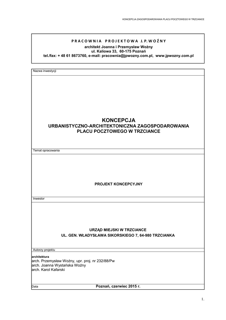 KONCEPCJA ZAGOSPODAROWANIA PLACU POCZTOWEGO W TRZCIANCE P R A C O W N I A P R O J E K T O W A J. P. W O Ź N Y architekt Joanna i Przemysław Woźny ul. Kaliowa 33, 60-175 Poznań tel./fax: + 48 61 8673760, e-mail: [email protected], www.jpwozny.com.pl Nazwa inwestycji KONCEPCJA URBANISTYCZNO-ARCHITEKTONICZNA ZAGOSPODAROWANIA PLACU POCZTOWEGO W TRZCIANCE Temat opracowania PROJEKT KONCEPCYJNY Inwestor URZĄD MIEJSKI W TRZCIANCE UL. GEN. WŁADYSŁAWA SIKORSKIEGO 7, 64-980 TRZCIANKA Autorzy projektu architektura arch. Przemysław Woźny, upr. proj. nr 232/88/Pw arch. Joanna Wystańska Woźny arch. Karol Kafarski Data Poznań, czerwiec 2015 r. 1. KONCEPCJA ZAGOSPODAROWANIA PLACU POCZTOWEGO W TRZCIANCE ZAWARTOŚĆ DOKUMENTACJI I. Opis koncepcji II. Rysunki Plac Pocztowy w skali miasta 1:500................................ rys. nr A-01 Schematy funkcjonalne zabudowy .................................. rys. nr A-02 Schematy komunikacyjne ............................................... rys. nr A-03 Schematy przestrzenne .................................................. rys. nr A-04 Zagospodarowanie terenu opracowania1:1000 .............. rys. nr A-05 Zagospodarowanie Placu Pocztowego 1:500 ................. rys. nr A-06 Plac Pocztowy, schematy aranżacji placu ....................... rys. nr A-07 Plac Pocztowy – przekroje, detale .................................. rys. nr A-08 Plac Pocztowy - pawilon ................................................. rys. nr A-09 Plac Pocztowy - wizualizacje........................................... rys. nr A-10 Plac Pocztowy - wizualizacje........................................... rys. nr A-11 Plac Pocztowy - wizualizacje........................................... rys. nr A-12 Plac Pocztowy - wizualizacje........................................... rys. nr A-13 Plac Pocztowy - wizualizacje........................................... rys. nr A-14 Plac Pocztowy - wizualizacje........................................... rys. nr A-15 Plac targowy - wizualizacje ............................................. rys. nr A-16 III. Kosztorys 2. KONCEPCJA ZAGOSPODAROWANIA PLACU POCZTOWEGO W TRZCIANCE PODSTAWY OPRACOWANIA 1. 2. 3. 4. 5. 6. Zlecenie Inwestora. Mapa zasadnicza. Mapa stanu prawnego. Koncepcje i uzgodnienia z Zamawiającym. Inwentaryzacja stanu istniejącego. Prawo Budowlane, Polskie Normy i obowiązujące przepisy techniczno – budowlane. 3. KONCEPCJA ZAGOSPODAROWANIA PLACU POCZTOWEGO W TRZCIANCE OPIS DO PROJEKTU KONCEPCYJNEGO 1. Przedmiot inwestycji Przedmiotem inwestycji jest przebudowa Placu Pocztowego w Trzciance wraz z zagospodarowaniem przyległych ulic. 2. Cel opracowania Celem opracowania jest wykonanie projektu koncepcyjnego, który po akceptacji przez Zamawiającego ma być podstawą do wykonania projektów budowlanowykonawczych dotyczących przebudowy Placu Pocztowego. 3. Istniejący stan zagospodarowania terenu Plac Pocztowy znajduje się w ścisłym centrum starego miasta. Pierwotnie „rynek” był zamkniętą przestrzenią z dwoma kościołami jako dominantami. Jeden kościół zamykał pierzeję rynku od strony południowej. Drugi kościół stał na rynku w północnej jego części. Obecnie rynek jest z trzech stron otoczony historyczną zabudową. W wyniku działań wojennych i późniejszych decyzji kościół na rynku został wyburzony. Również w wyniku wojny ucierpiała południowa pierzeja rynku, która została wyburzona. Po wojnie w środkowej części rynku wybudowano Mauzoleum Żołnierzy Radzieckich i dworzec autobusowy. W wyniku dalszych przeobrażeń i potrzeb komunikacyjnych została poszerzona obecna ul. Sikorskiego i wybudowane rondo. Te zmiany spowodowały regres przestrzeni urbanistycznej i niemożnść powrotu do dawnych założeń kompozycyjnych. Przed II wojną światową rynek był jednolicie wybrukowaną powierzchnią z wydzielonymi chodnikami wzdłuż pierzei a jedyną zielenią były drzewa okalające kościół. Obecnie w środkowych częściach rynku założone są trawniki i rosną, szczególnie w południowej części różne gatunki drzew i krzewów nie tworzących żadnej kompozycji. Jezdnie są pokryte asfaltem z wyjątkiem części północno-wschodniej gdzie został odkryty i częściowo zrekonstruowany dawny bruk. Chodniki wyłożone są kostką i płytami betonowymi. W środkowej części rynku funkcjonuje dworzec autobusowy. Parkingi zlokalizowane są głównie w zachodniej i północnej części rynku. 4. Opis projektowanego zagospodarowania placu Jedna z koncepcji projektowych zakładała zagospodarowanie Placu nawiązujące do historycznego założenia rynku. Jednak ze względu na istniejący układ drogowy i zmiany w tkance urbanistycznej nie jest możliwy powrót do dawnego układu rynku. Projekt jednak zakłada i nie zamyka możliwości powrotu w przyszłości do planów rekonstrukcji dawnej przestrzeni rynku. Uwzględniając uwagi mieszkańców zaprojektowano nowe zagospodarowanie Placu z podziałem na dwie części. W części północnej Placu, w miejscu dawnego kościoła zaprojektowano zabudowę kubaturową o funkcji wystawienniczej i gastronomicznej a w części południowej rekreację w zieleni. Strefowanie rynku pozwoli na stworzenie kameralnych wnętrz o ludzkiej skali, atmosferę przytulności a co za tym idzie dobrego samopoczucia. Obie części łączyć będzie, w miejscu obecnej drogi, fontanna. Ruch na placu zostanie ograniczony i zorganizowany na zasadzie ronda. W północnej części Placu zostały zaprojektowane miejsca parkingowe a od strony wschodniej przystanek autobusowy i postój taxi. 4. KONCEPCJA ZAGOSPODAROWANIA PLACU POCZTOWEGO W TRZCIANCE 5. Zabudowa kubaturowa wokół placu Budynki otaczające rynek charakteryzują się dość zróżnicowaną, eklektyczną i typową dla małych miast formą. Projekt nie przewiduje ingerencji w zabudowę. Winna ona zostać poddana szczegółowej analizie przy pracach modernizacyjnych parterów. W jej wyniku powinien zostać wprowadzony u