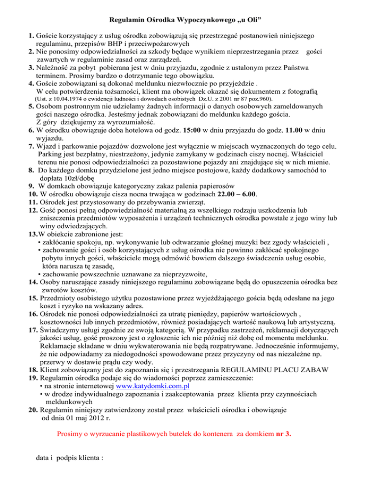 Regulamin Ośrodka Wypoczynkowego „u Oli” 1. Goście korzystający z usług ośrodka zobowiązują się przestrzegać postanowień niniejszego regulaminu, przepisów BHP i przeciwpożarowych 2. Nie ponosimy odpowiedzialności za szkody będące wynikiem nieprzestrzegania przez gości zawartych w regulaminie zasad oraz zarządzeń. 3. Należność za pobyt pobierana jest w dniu przyjazdu, zgodnie z ustalonym przez Państwa terminem. Prosimy bardzo o dotrzymanie tego obowiązku. 4. Goście zobowiązani są dokonać meldunku niezwłocznie po przyjeździe . W celu potwierdzenia tożsamości, klient ma obowiązek okazać się dokumentem z fotografią (Ust. z 10.04.1974 o ewidencji ludności i dowodach osobistych Dz.U. z 2001 nr 87 poz.960). 5. Osobom postronnym nie udzielamy żadnych informacji o danych osobowych zameldowanych gości naszego ośrodka. Jesteśmy jednak zobowiązani do meldunku każdego gościa. Z góry dziękujemy za wyrozumiałość. 6. W ośrodku obowiązuje doba hotelowa od godz. 15:00 w dniu przyjazdu do godz. 11.00 w dniu wyjazdu. 7. Wjazd i parkowanie pojazdów dozwolone jest wyłącznie w miejscach wyznaczonych do tego celu. Parking jest bezpłatny, niestrzeżony, jedynie zamykany w godzinach ciszy nocnej. Właściciel terenu nie ponosi odpowiedzialności za pozostawione pojazdy ani znajdujące się w nich mienie. 8. Do każdego domku przydzielone jest jedno miejsce postojowe, każdy dodatkowy samochód to dopłata 10zł/dobę 9. W domkach obowiązuje kategoryczny zakaz palenia papierosów 10. W ośrodku obowiązuje cisza nocna trwająca w godzinach 22.00 – 6.00. 11. Ośrodek jest przystosowany do przebywania zwierząt. 12. Gość ponosi pełną odpowiedzialność materialną za wszelkiego rodzaju uszkodzenia lub zniszczenia przedmiotów wyposażenia i urządzeń technicznych ośrodka powstałe z jego winy lub winy odwiedzających. 13.W obiekcie zabronione jest: • zakłócanie spokoju, np. wykonywanie lub odtwarzanie głośnej muzyki bez zgody właścicieli , • zachowanie gości i osób korzystających z usług ośrodka nie powinno zakłócać spokojnego pobytu innych gości, właściciele mogą odmówić bowiem dalszego świadczenia usług osobie, która narusza tę zasadę, • zachowanie powszechnie uznawane za nieprzyzwoite, 14. Osoby naruszające zasady niniejszego regulaminu zobowiązane będą do opuszczenia ośrodka bez zwrotów kosztów. 15. Przedmioty osobistego użytku pozostawione przez wyjeżdżającego gościa będą odesłane na jego koszt i ryzyko na wskazany adres. 16. Ośrodek nie ponosi odpowiedzialności za utratę pieniędzy, papierów wartościowych , kosztowności lub innych przedmiotów, również posiadających wartość naukową lub artystyczną. 17. Świadczymy usługi zgodnie ze swoją kategorią. W przypadku zastrzeżeń, reklamacji dotyczących jakości usług, gość proszony jest o zgłoszenie ich nie później niż dobę od momentu meldunku. Reklamacje składane w dniu wykwaterowania nie będą rozpatrywane. Jednocześnie informujemy, że nie odpowiadamy za niedogodności spowodowane przez przyczyny od nas niezależne np. przerwy w dostawie prądu czy wody. 18. Klient zobowiązany jest do zapoznania się i przestrzegania REGULAMINU PLACU ZABAW 19. Regulamin ośrodka podaje się do wiadomości poprzez zamieszczenie: • na stronie internetowej www.katydomki.com.pl • w drodze indywidualnego zapoznania i zaakceptowania przez klienta przy czynnościach meldunkowych 20. Regulamin niniejszy zatwierdzony został przez właścicieli ośrodka i obowiązuje od dnia 01 maj 2012 r. Prosimy o wyrzucanie plastikowych butelek do kontenera za domkiem nr 3. data i podpis klienta : REGULAMIN PLACU ZABAW 1. PLAC ZABAW DLA DZIECI JEST TERENEM SŁUŻĄCYM ZABAWIE I WYPOCZYNKOWI. 2. ELEMENTY PLACU ZABAW PRZEZNACZONE SĄ DLA DZIECI OD 3 DO 13 LAT. 3. DZIECI NA TERENIE PLACU ZABAW POWINNY PRZEBYWAĆ WYŁĄCZNIE POD OPIEKĄ RODZICÓW LUB DOROSŁYCH OPIEKUNÓW, KTÓRZY ZA NIE PONOSZĄ ODPOWIEDZIALNOŚĆ 4. OSOBY PRZEBYWAJĄCE NA TERENIE PLACU ZABAW OBOWIĄZANE SĄ DO ZACHOWANIA PORZĄDKU. 5. Z URZĄDZEŃ ZABAWOWYCH NALEŻY KORZYSTAĆ ZGODNIE Z ICH PRZEZNACZENIEM. 6. NA TERENIE PLACU ZABAW OBOWIĄZUJE BEZWZGLĘDNY ZAKAZ SPOŻYWANIA NAPOJÓW ALKOHOLOWYCH, INNYCH UŻYWEK ORAZ PALENIA PAPIEROSÓW. 7. NA TERENIE PLACU ZABAW ZABRONIONE SĄ GRY ZESPOŁOWE 8. WSZELKIE USZKODZENIA ELEMENTÓW ZABAWOWYCH NALEŻY ZGŁASZAC DO WŁAŚCICIELA OBIEKTU . 9. OSOBY NISZCZĄCE SPRZĘT I URZADZENIA PLACU ZABAW BĄDŹ ICH OPIEKUNOWIE PONOSZĄ ODPOWIEDZIALNOŚC MATERIALNĄ. Telefony alarmowe: Policja – 997 Pogotowie ratunkowe – 999 Ogólny, pomoc – 112 DZIĘKUJEMY ZA PRZESTRZEGANIE REGULAMINU, ŻYCZYMY MIŁEJ ZABAWY!