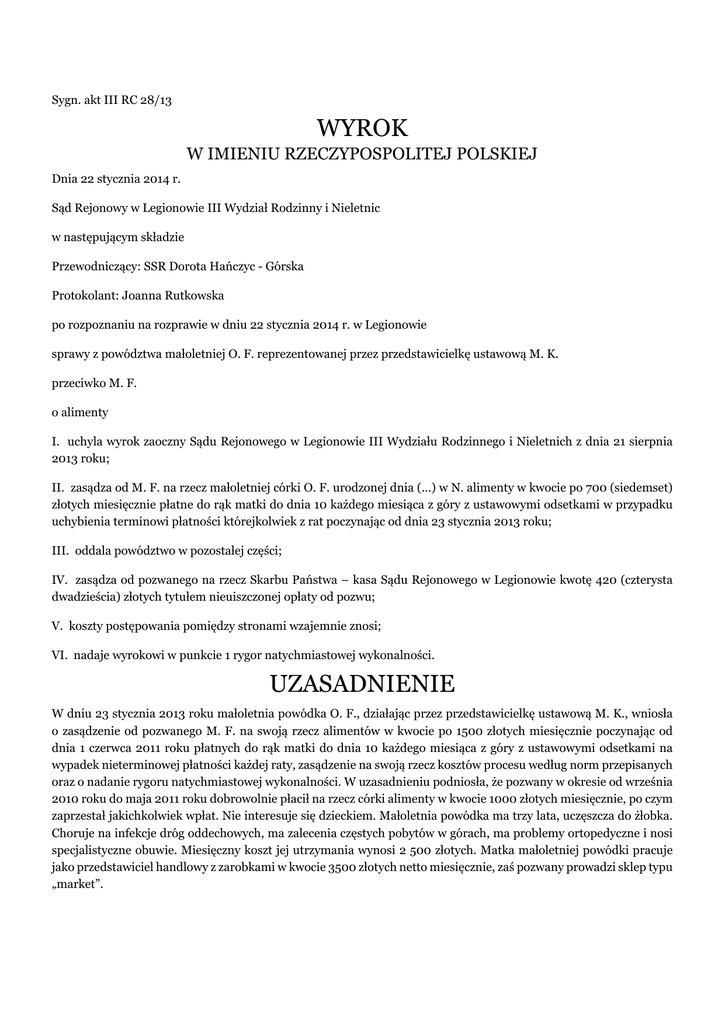 Sygn. akt III RC 28/13 WYROK W IMIENIU RZECZYPOSPOLITEJ POLSKIEJ Dnia 22 stycznia 2014 r. Sąd Rejonowy w Legionowie III Wydział Rodzinny i Nieletnic w następującym składzie Przewodniczący: SSR Dorota Hańczyc - Górska Protokolant: Joanna Rutkowska po rozpoznaniu na rozprawie w dniu 22 stycznia 2014 r. w Legionowie sprawy z powództwa małoletniej O. F. reprezentowanej przez przedstawicielkę ustawową M. K. przeciwko M. F. o alimenty I. uchyla wyrok zaoczny Sądu Rejonowego w Legionowie III Wydziału Rodzinnego i Nieletnich z dnia 21 sierpnia 2013 roku; II. zasądza od M. F. na rzecz małoletniej córki O. F. urodzonej dnia (...) w N. alimenty w kwocie po 700 (siedemset) złotych miesięcznie płatne do rąk matki do dnia 10 każdego miesiąca z góry z ustawowymi odsetkami w przypadku uchybienia terminowi płatności którejkolwiek z rat poczynając od dnia 23 stycznia 2013 roku; III. oddala powództwo w pozostałej części; IV. zasądza od pozwanego na rzecz Skarbu Państwa – kasa Sądu Rejonowego w Legionowie kwotę 420 (czterysta dwadzieścia) złotych tytułem nieuiszczonej opłaty od pozwu; V. koszty postępowania pomiędzy stronami wzajemnie znosi; VI. nadaje wyrokowi w punkcie 1 rygor natychmiastowej wykonalności. UZASADNIENIE W dniu 23 stycznia 2013 roku małoletnia powódka O. F., działając przez przedstawicielkę ustawową M. K., wniosła o zasądzenie od pozwanego M. F. na swoją rzecz alimentów w kwocie po 1500 złotych miesięcznie poczynając od dnia 1 czerwca 2011 roku płatnych do rąk matki do dnia 10 każdego miesiąca z góry z ustawowymi odsetkami na wypadek nieterminowej płatności każdej raty, zasądzenie na swoją rzecz kosztów procesu według norm przepisanych oraz o nadanie rygoru natychmiastowej wykonalności. W uzasadnieniu podniosła, że pozwany w okresie od września 2010 roku do maja 2011 roku dobrowolnie płacił na rzecz córki alimenty w kwocie 1000 złotych miesięcznie, po czym zaprzestał jakichkolwiek wpłat. Nie interesuje się dzieckiem. Małoletnia powódka ma trzy lata, uczęszcza do żłobka. Choruje na infekcje dróg oddechowych, ma zalecenia częstych pobytów w górach, ma problemy ortopedyczne i nosi specjalistyczne obuwie. Miesięczny koszt jej utrzymania wynosi 2 500 złotych. Matka małoletniej powódki pracuje jako przedstawiciel handlowy z zarobkami w kwocie 3500 złotych netto miesięcznie, zaś pozwany prowadzi sklep typu „market”. Wyrokiem zaocznym z dnia 21 sierpnia 2013 roku Sąd Rejonowy w Legionowie zasądził od pozwanego M. F. na rzecz córki O. F. urodzonej w dniu (...) w N. alimenty w kwocie 1 000 złotych miesięcznie płatne do rąk matki M. K. do dnia 10 każdego miesiąca z góry z ustawowymi odsetkami w przypadku uchybienia terminowi płatności którejkolwiek z rat poczynając od dnia 23 stycznia 2013 roku, odstąpił od obciążenia pozwanego kosztami sądowymi i przejął je na rachunek Skarbu Państwa, a nadto wyrokowi nadał rygor natychmiastowej wykonalności. W zakreślonym terminie pozwany, działając przez profesjonalnego pełnomocnika, złożył sprzeciw od wyroku zaocznego, w którym wniósł o uchylenie zaskarżonego wyroku zaocznego i o oddalenie powództwa w części to jest w zakresie zasądzenia od pozwanego na rzecz powódki alimentów w wysokości przekraczającej kwotę 500 złotych miesięcznie, zasądzenie od powódki na rzecz pozwanego kosztów postępowania, w tym kosztów zastępstwa procesowego według norm prawem przepisanych oraz o zawieszenie rygoru natychmiastowej wykonalności nadanego zaskarżonemu wyrokowi w punkcie I. Postanowieniem z dnia 18 października 2013 roku Sąd Rejonowy oddalił wniosek o zawieszenie rygoru natychmiastowej wykonalności. ( k 78 – 80) Na podstawie całokształtu materiału dowodowego zgromadzonego w sprawie Sąd ustalił następujący stan faktyczny: Małoletnia powódka O. F. urodziła się w dniu (...) ze związku pozamałżeńskiego M. K. oraz M. F.. Aktualnie uczęszcza do publicznego przedszkola, za które opłata wynosi 250 złotych. Dodatkowe opłaty to rada rodziców w kwocie 55 złotych miesięcznie oraz zajęcia dodatkowe w postaci tańca i języka angielskiego w kwocie 65 złotych miesięcznie. Małoletnia powódka cierpi na infekcje dróg oddechowych. Często choruje na zapalenie płuc, zapalenie gardła. Z tego powodu w roku 2013 przebywała w sanatorium z NFZ. Jednakże za swój pobyt matka dziecka uiściła kwotę 1890 złotych.(k 100) Dodatkowe wydatki związane z pobytem O. K. w sanatorium wyniosły jej matkę kwotę 1 000 złotych. Małoletnia powódka często zapada na infekcje dróg oddechowych. W czasie chorób matka małoletniej na lekarstwa wydaje 300 złotych miesięcznie. O. K. nie ma stwierdzonej żadnej choroby, jednak pozostaje pod kontrolą pulmonologa. Przyjmuje okresowo wziewne lekarstwa ze sterydami oraz antybiotyki. Dziadkowe macierzyści małoletniej powódki w czasie jej choroby opiekują się nią. Jako że zamieszkują poza L., matka małoletniej odwozi ją do swoich rodziców. Miesięczny koszt utrzymania małoletniej powódki jej matka oszacowała na kwotę 2 000 złotych. M. F. nie utrzymuje żadnego kontaktu ze swoją córką. Do miesiąca czerwca 2011 roku pozwany dobrowolnie łożył na utrzymanie córki kwotę 1 000 złotych miesięcznie tytułem alimentów. Małoletnia powódka korzystała z prywatnych wizyt u stomatologa. Nie wymaga specjalistycznej diety. ( dowód: przesłuchanie przedstawicielki ustawowej małoletniej powódki k 141 – 142, częściowo przesłuchanie pozwanego k 142 – 142 - verte) O. F. zamieszkuje wraz z matką w dwupokojowym mieszkaniu o powierzchni 42,5 m 2. Matka małoletniej ponosi co miesiąc opłaty związane z utrzymaniem mieszkania w postaci czynszu w kwocie 370 złotych miesięcznie, kwotę 130 złote z tytułu zużycia wody, kwotę 100 złotych za zużycie prądu, kwotę 80,90 złotych z tytułu zużycia paliwa gazowego, opłat telewizyjnych w kwocie 59 złotyc