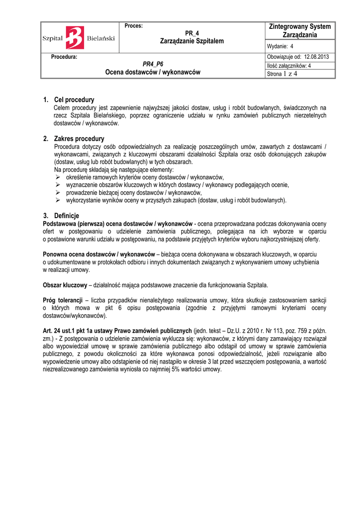 Zintegrowany System Zarządzania Proces: PR_4 Zarządzanie Szpitalem Procedura: Wydanie: 4 Obowiązuje od: 12.08.2013 PR4_P6 Ocena dostawców / wykonawców Ilość załączników: 4 Strona 1 z 4 1. Cel procedury Celem procedury jest zapewnienie najwyższej jakości dostaw, usług i robót budowlanych, świadczonych na rzecz Szpitala Bielańskiego, poprzez ograniczenie udziału w rynku zamówień publicznych nierzetelnych dostawców / wykonawców. 2. Zakres procedury Procedura dotyczy osób odpowiedzialnych za realizację poszczególnych umów, zawartych z dostawcami / wykonawcami, związanych z kluczowymi obszarami działalności Szpitala oraz osób dokonujących zakupów (dostaw, usług lub robót budowlanych) w tych obszarach. Na procedurę składają się następujące elementy: określenie ramowych kryteriów oceny dostawców / wykonawców, wyznaczenie obszarów kluczowych w których dostawcy / wykonawcy podlegających ocenie, prowadzenie bieżącej oceny dostawców / wykonawców, wykorzystanie wyników oceny w przyszłych zakupach (dostaw, usług i robót budowlanych). 3. Definicje Podstawowa (pierwsza) ocena dostawców / wykonawców - ocena przeprowadzana podczas dokonywania oceny ofert w postępowaniu o udzielenie zamówienia publicznego, polegająca na ich wyborze w oparciu o postawione warunki udziału w postępowaniu, na podstawie przyjętych kryteriów wyboru najkorzystniejszej oferty. Ponowna ocena dostawców / wykonawców – bieżąca ocena dokonywana w obszarach kluczowych, w oparciu o udokumentowane w protokołach odbioru i innych dokumentach związanych z wykonywaniem umowy uchybienia w realizacji umowy. Obszar kluczowy – działalność mająca podstawowe znaczenie dla funkcjonowania Szpitala. Próg tolerancji – liczba przypadków nienależytego realizowania umowy, która skutkuje zastosowaniem sankcji o których mowa w pkt 6 opisu postępowania (zgodnie z przyjętymi ramowymi kryteriami oceny dostawców/wykonawców). Art. 24 ust.1 pkt 1a ustawy Prawo zamówień publicznych (jedn. tekst – Dz.U. z 2010 r. Nr 113, poz. 759 z późn. zm.) - Z postępowania o udzielenie zamówienia wyklucza się: wykonawców, z którymi dany zamawiający rozwiązał albo wypowiedział umowę w sprawie zamówienia publicznego albo odstąpił od umowy w sprawie zamówienia publicznego, z powodu okoliczności za które wykonawca ponosi odpowiedzialność, jeżeli rozwiązanie albo wypowiedzenie umowy albo odstąpienie od niej nastąpiło w okresie 3 lat przed wszczęciem postępowania, a wartość niezrealizowanego zamówienia wyniosła co najmniej 5% wartości umowy. Zintegrowany System Zarządzania Proces: PR_4 Zarządzanie Szpitalem Wydanie: 4 Procedura: Obowiązuje od: 12.08.2013 PR4_P6 Ilość załączników: 4 Strona 2 z 4 Ocena dostawców / wykonawców 1. 2. 3. 4. Utworzenie wykazu kluczowych obszarów w których dostawcy / wykonawcy podlegają ocenie Określenie ramowych kryteriów oceny dostawców / wykonawców Bieżące przekazywanie informacji procedura PR4_P5 związanych z nienależytą realizacją umów kierownikowi Działu ZP Prowadzenie rejestru przypadków nienależytego realizowania umowy Rejestr zamówień publicznych 5. 6 7 8. W Oi Bieżący monitoring uchybień i wzywanie do należytej realizacji umowy Utworzenie i bieżące prowadzenie wykazu podmiotów, które przekroczyły „próg tolerancji” Bieżące informowanie o przypadkach przekroczenia „progu tolerancji” Wykorzystanie danych z oceny w kolejnych procedurach zakupu – wykonuje zadanie = odpowiada – odbiera informację Osoby upoważnione do dokonywania zakupów o wartości nie przekraczającej progu stosowania ustawy Pzp ZADANIA N W Oi Wykaz obszarów kluczowych N W W Ramowe kryteria oceny dostawców / wykonawców Oi W Di W Di Di ZAPISY Osoba odpowiedzialna za realizację umowy w obszarze kluczowym Lp. Kier. Działu Zamówień Publicznych UCZESTNICY Właściwy Zastępca Dyrektora Dokumenty związane 4. Diagram postępowania Zgłoszenie nienależytej realizacji umowy Wykaz wykonawców, którzy przekroczyli „próg tolerancji” W Oi Oi W W W Di - dostarcza informacji N - sprawuje nadzór 5. Opis postępowania 1. Kierownik Działu Zamówień Publicznych określa wykaz obszarów kluczowych w których dostawy, usługi i roboty budowlane podlegają ocenie (Wykaz obszarów kluczowych). Wykaz ten może podlegać weryfikacji. 2. Kierownik Działu Zamówień Publicznych, wspólnie z osobami odpowiedzialnymi za realizację umów w obszarach kluczowych, określa ramowe kryteria oceny dostawców/wykonawców wyznaczające „progi tolerancji”, przekroczenie których może być podstawą do zastosowania sankcji o których mowa w pkt 6 (progi tolerancji mogą podlegać zmianom). 3. Osoby wyznaczone do realizacji poszczególnych umów na bieżąco przekazują kierownikowi Działu Zamówień Proces: PR_4 Zarządzanie Szpitalem Procedura: PR4_P6 Ocena dostawców / wykonawców 4. 5. 6. 7. 8. Zintegrowany System Zarządzania Wydanie: 4 Obowiązuje od: 12.08.2013 Ilość załączników: 4 Strona 3 z 4 Publicznych informacje o przypadkach nienależytego wykonywania umowy (na formularzu Zgłoszenie nienależytej realizacji umowy). Każdy przypadek stwierdzenia nienależytego wykonywania umowy musi być oparty na konkretnych dowodach, które przechowuje osoba przekazująca informację. Kierownik Działu Zamówień Publicznych przechowuje oraz rejestruje formularze Zgłoszenie nienależytej realizacji umowy, poprzez wpis do odpowiedniej rubryki w Rejestrze zamówień publicznych. Kierownik Działu Zamówień publicznych prowadzi bieżący monitoring zarejestrowanych uchybień i w przypadku, gdy dostawca/wykonawca dopuści się 2 uchybień istotnych lub 6 uchybień o mniejszej randze, wzywa go do należytego realizowania zawartej umowy oraz informuje o zagrożeniu jej rozwiązaniem, w przypadku popełnienia kolejnych uchybień. Kierownik Działu Zamówień Publicznych zlicza uchybienia wykonawców w realizacji poszczególnyc