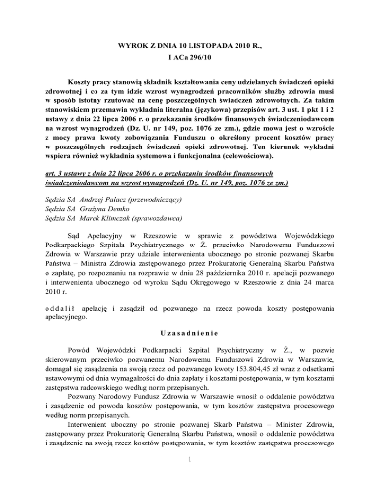 WYROK Z DNIA 10 LISTOPADA 2010 R., I ACa 296/10 Koszty pracy stanowią składnik kształtowania ceny udzielanych świadczeń opieki zdrowotnej i co za tym idzie wzrost wynagrodzeń pracowników służby zdrowia musi w sposób istotny rzutować na cenę poszczególnych świadczeń zdrowotnych. Za takim stanowiskiem przemawia wykładnia literalna (językowa) przepisów art. 3 ust. 1 pkt 1 i 2 ustawy z dnia 22 lipca 2006 r. o przekazaniu środków finansowych świadczeniodawcom na wzrost wynagrodzeń (Dz. U. nr 149, poz. 1076 ze zm.), gdzie mowa jest o wzroście z mocy prawa kwoty zobowiązania Funduszu o określony procent kosztów pracy w poszczególnych rodzajach świadczeń opieki zdrowotnej. Ten kierunek wykładni wspiera również wykładnia systemowa i funkcjonalna (celowościowa). art. 3 ustawy z dnia 22 lipca 2006 r. o przekazaniu środków finansowych świadczeniodawcom na wzrost wynagrodzeń (Dz. U. nr 149, poz. 1076 ze zm.) Sędzia SA Andrzej Palacz (przewodniczący) Sędzia SA Grażyna Demko Sędzia SA Marek Klimczak (sprawozdawca) Sąd Apelacyjny w Rzeszowie w sprawie z powództwa Wojewódzkiego Podkarpackiego Szpitala Psychiatrycznego w Ż. przeciwko Narodowemu Funduszowi Zdrowia w Warszawie przy udziale interwenienta ubocznego po stronie pozwanej Skarbu Państwa – Ministra Zdrowia zastępowanego przez Prokuratorię Generalną Skarbu Państwa o zapłatę, po rozpoznaniu na rozprawie w dniu 28 października 2010 r. apelacji pozwanego i interwenienta ubocznego od wyroku Sądu Okręgowego w Rzeszowie z dnia 24 marca 2010 r. o d d a l i ł apelację i zasądził od pozwanego na rzecz powoda koszty postępowania apelacyjnego. U za sa dnienie Powód Wojewódzki Podkarpacki Szpital Psychiatryczny w Ż., w pozwie skierowanym przeciwko pozwanemu Narodowemu Funduszowi Zdrowia w Warszawie, domagał się zasądzenia na swoją rzecz od pozwanego kwoty 153.804,45 zł wraz z odsetkami ustawowymi od dnia wymagalności do dnia zapłaty i kosztami postępowania, w tym kosztami zastępstwa radcowskiego według norm przepisanych. Pozwany Narodowy Fundusz Zdrowia w Warszawie wnosił o oddalenie powództwa i zasądzenie od powoda kosztów postępowania, w tym kosztów zastępstwa procesowego według norm przepisanych. Interwenient uboczny po stronie pozwanej Skarb Państwa – Minister Zdrowia, zastępowany przez Prokuratorię Generalną Skarbu Państwa, wnosił o oddalenie powództwa i zasądzenie na swoją rzecz kosztów postępowania, w tym kosztów zastępstwa procesowego 1 według norm przepisanych na rzecz Skarbu Państwa – Prokuratorii Generalnej Skarbu Państwa. Sąd Okręgowy w Rz. wyrokiem z dnia 24 marca 2010 r. zasądził od pozwanego na rzecz powoda kwotę 153.804,45 zł z ustawowymi odsetkami od dnia 7 maja 2009 r. do dnia zapłaty. Wyrokiem tym Sąd Okręgowy orzekł nadto o kosztach procesu, w tym o kosztach sądowych należnych Skarbowi Państwa. Wyrok ten, jak wynika z jego pisemnego uzasadnienia oparty został na następujących ustaleniach faktycznych i wnioskach prawnych. Powód Wojewódzki Podkarpacki Szpital Psychiatryczny w Ż. w dniu 26 listopada 2006 r. zawarł z pozwanym umowę o udzielanie świadczeń opieki zdrowotnej – opieka psychiatryczna i leczenie uzależnień – nr (…), której przedmiotem było udzielanie w okresie od 1 stycznia do 31 grudnia 2007 r. świadczeń opieki zdrowotnej określonych w załączniku nr 1 do tej umowy. Kwota zobowiązania oddziału Funduszu została ustalona na 9.362.232,42 zł. Liczbę i cenę jednostek rozliczeniowych określono w planie rzeczowo-finansowym, stanowiącym załącznik do umowy. W § 4 ust. 4 umowy postanowiono, że kwota zobowiązania z ust. 1 zawiera w sobie kwotę stanowiąca realizację art. 3 ust. 1 pkt 2 ustawy z dnia 22 lipca 2006 r. o przekazaniu środków finansowych świadczeniodawcom na wzrost wynagrodzeń, w wysokości 1.605.581,42 zł. Strony związane były podobną umową także w okresie od 1 stycznia do 31 grudnia 2008 r. W § 5 ust. 1 tej umowy strony ustaliły maksymalną kwotę zobowiązania Funduszu na 9.532.389,42 zł, ustalając jednocześnie w ust. 8, że kwota ta zawiera w sobie kwotę przeznaczoną na wzrost wynagrodzeń w roku 2008 zgodnie z postanowieniami rozdziału 3 ustawy z dnia 22 lipca 2006 r. o przekazaniu środków finansowych świadczeniodawcom na wzrost wynagrodzeń, w wysokości 1.605.581,42 zł. Analogicznie jak w poprzedniej umowie, strony uzgodniły, że środki na podwyżki będą przekazywane w równych miesięcznych ratach do 5-tego dnia każdego miesiąca. Do umowy zawierane były aneksy, m. in. aneks nr 2 z dnia 29 lutego 2008 r. na mocy którego zwiększono kwotę zobowiązania Funduszu, ustaloną w § 5 ust. 1 umowy, do kwoty 9.789.634,42 zł oraz aneks nr 3 z tego samego dnia zwiększający kwotę zobowiązania pozwanego do sumy 11.899.634,42 zł. Kolejnym aneksem z dnia 31 lipca 2008 r. strony zmieniły warunki finansowania świadczeń w ten sposób, że zwiększyły kwotę zobowiązania Funduszu do sumy 11.930.166,92 zł. W dniu 2 stycznia 2009 r. strony zawarły kolejny aneks do umowy celem dostosowania ilości świadczeń określonych w umowie do rzeczywistego wykonania w okresie od 1 stycznia do 31 grudnia 2008 r. ustalając ostatecznie kwotę zobowiązania pozwanego na 11.874.103,92 zł. Powód wystawił pozwanemu faktury za wykonane w listopadzie i grudniu 2007 r. świadczenia na kwotę 61.521,78 zł oraz za wykonane w okresie od 1 stycznia 2008 r. do 31 marca 2008 r. świadczenia na kwotę 92.282,67 zł. Kwoty te stanowiły różnicę pomiędzy faktycznie poniesionymi kosztami przez powoda a kwotą uznaną przez pozwanego i następnie wypłaconą. W odpowiedzi na wezwanie do zapłaty wymienionych faktur pozwany oświadczył, iż zawarta w § 4 ust. 4 umowy kwota na podwyżki wynagrodzeń w wysokości 1.605.581,42 zł została naliczona przez pozwanego jako realizacja postanowień art. 3 ustawy z dnia 22 lipca 2006 r. o przekazaniu środków finansowych świ