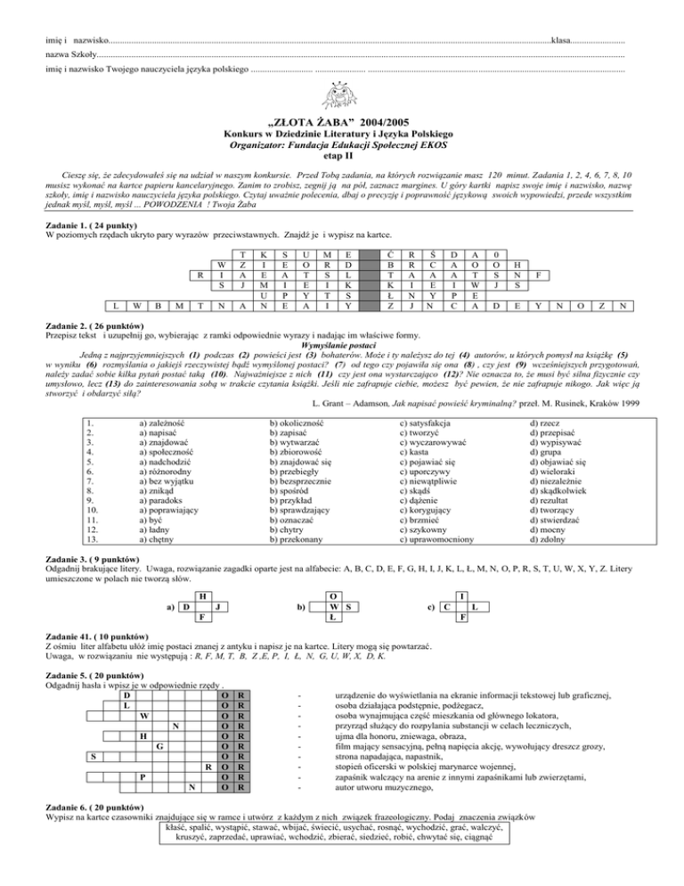 imię i nazwisko.................................................................................................................................................................................................klasa........................ nazwa Szkoły...................................................................................................................................................................................................................................... imię i nazwisko Twojego nauczyciela języka polskiego ........................... ...................... ................................................................................................................ „ZŁOTA ŻABA” 2004/2005 Konkurs w Dziedzinie Literatury i Języka Polskiego Organizator: Fundacja Edukacji Społecznej EKOS etap II Cieszę się, że zdecydowałeś się na udział w naszym konkursie. Przed Tobą zadania, na których rozwiązanie masz 120 minut. Zadania 1, 2, 4, 6, 7, 8, 10 musisz wykonać na kartce papieru kancelaryjnego. Zanim to zrobisz, zegnij ją na pół, zaznacz margines. U góry kartki napisz swoje imię i nazwisko, nazwę szkoły, imię i nazwisko nauczyciela języka polskiego. Czytaj uważnie polecenia, dbaj o precyzję i poprawność językową swoich wypowiedzi, przede wszystkim jednak myśl, myśl, myśl ... POWODZENIA ! Twoja Żaba Zadanie 1. ( 24 punkty) W poziomych rzędach ukryto pary wyrazów przeciwstawnych. Znajdź je i wypisz na kartce. L W B M R W I S T Z A J T N A K I E M U N S E A I P E U O T E Y A M R S I T I E D L K S Y Ć B T K Ł Z R R A I N J Ś C A E Y N D A A I P C A O T W E A 0 O S J H N S F D E Y N O Z N Zadanie 2. ( 26 punktów) Przepisz tekst i uzupełnij go, wybierając z ramki odpowiednie wyrazy i nadając im właściwe formy. Wymyślanie postaci Jedną z najprzyjemniejszych (1) podczas (2) powieści jest (3) bohaterów. Może i ty należysz do tej (4) autorów, u których pomysł na książkę (5) w wyniku (6) rozmyślania o jakiejś rzeczywistej bądź wymyślonej postaci? (7) od tego czy pojawiła się ona (8) , czy jest (9) wcześniejszych przygotowań, należy zadać sobie kilka pytań postać taką (10). Najważniejsze z nich (11) czy jest ona wystarczająco (12)? Nie oznacza to, że musi być silna fizycznie czy umysłowo, lecz (13) do zainteresowania sobą w trakcie czytania książki. Jeśli nie zafrapuje ciebie, możesz być pewien, że nie zafrapuje nikogo. Jak więc ją stworzyć i obdarzyć siłą? L. Grant – Adamson, Jak napisać powieść kryminalną? przeł. M. Rusinek, Kraków 1999 1. 2. 3. 4. 5. 6. 7. 8. 9. 10. 11. 12. 13. a) zależność a) napisać a) znajdować a) społeczność a) nadchodzić a) różnorodny a) bez wyjątku a) znikąd a) paradoks a) poprawiający a) być a) ładny a) chętny b) okoliczność b) zapisać b) wytwarzać b) zbiorowość b) znajdować się b) przebiegły b) bezsprzecznie b) spośród b) przykład b) sprawdzający b) oznaczać b) chytry b) przekonany c) satysfakcja c) tworzyć c) wyczarowywać c) kasta c) pojawiać się c) uporczywy c) niewątpliwie c) skądś c) dążenie c) korygujący c) brzmieć c) szykowny c) uprawomocniony d) rzecz d) przepisać d) wypisywać d) grupa d) objawiać się d) wieloraki d) niezależnie d) skądkolwiek d) rezultat d) tworzący d) stwierdzać d) mocny d) zdolny Zadanie 3. ( 9 punktów) Odgadnij brakujące litery. Uwaga, rozwiązanie zagadki oparte jest na alfabecie: A, B, C, D, E, F, G, H, I, J, K, L, Ł, M, N, O, P, R, S, T, U, W, X, Y, Z. Litery umieszczone w polach nie tworzą słów. H a) D J b) F O W S Ł I c) C L F Zadanie 41. ( 10 punktów) Z ośmiu liter alfabetu ułóż imię postaci znanej z antyku i napisz je na kartce. Litery mogą się powtarzać. Uwaga, w rozwiązaniu nie występują : R, F, M, T, B, Z ,E, P, I, Ł, N, G, U, W, X, D, K. Zadanie 5. ( 20 punktów) Odgadnij hasła i wpisz je w odpowiednie rzędy . D O L O W O N O H O G O S O R O P O N O R R R R R R R R R R - urządzenie do wyświetlania na ekranie informacji tekstowej lub graficznej, osoba działająca podstępnie, podżegacz, osoba wynajmująca część mieszkania od głównego lokatora, przyrząd służący do rozpylania substancji w celach leczniczych, ujma dla honoru, zniewaga, obraza, film mający sensacyjną, pełną napięcia akcję, wywołujący dreszcz grozy, strona napadająca, napastnik, stopień oficerski w polskiej marynarce wojennej, zapaśnik walczący na arenie z innymi zapaśnikami lub zwierzętami, autor utworu muzycznego, Zadanie 6. ( 20 punktów) Wypisz na kartce czasowniki znajdujące się w ramce i utwórz z każdym z nich związek frazeologiczny. Podaj znaczenia związków kłaść, spalić, wystąpić, stawać, wbijać, świecić, usychać, rosnąć, wychodzić, grać, walczyć, kruszyć, zaprzedać, uprawiać, wchodzić, zbierać, siedzieć, robić, chwytać się, ciągnąć Zadanie 7. ( 31 punktów) W wierszu Danuty Wawiłow podkreśl neologizmy. Napisz zabawny, ośmiozgłoskowy wierszyk na temat związany ze szkołą, w którym wykorzystasz utworzone przez Ciebie cztery neologizmy. Danuta Wawiłow Kałużyści Już od rana na podwórzu wśród patyków i wśród liści przykucnęli nad kałużą pracowici kałużyści. Wygrzebują brud z kałuży, niech kałuża będzie czysta! Pełne ręce ma roboty każdy dobry kałużysta! Rękawiczką i chusteczką Dwóch błocistów chodnik czyści Obrzucają się szyszkami bardzo dzielni szyszkowiści. Dwie kocistki pod ławeczką Cukierkami karmią kota ... Świątek, piątek czy niedziela, Na podwórku wre robota! Zadanie 8. ( 18 punktów) Znajdź ukryte poziomo, pionowo i ukośnie wyrazy związane z historią książki i przepisz je na osobną kartkę. M E L O H Y N Z S A Z T L A D R S A F I W R O R O S N J E S G S E Ó W U J W P U R D K Ą Ś S J G Y Ł A J C E T R Z U E R G A M L I P I L S I W O R F K H O G O I R T S L L E Y A I G Y T P A Ę P U J Ł Ó D R A U Ć U G O I K I R M F L A R T U J N A N I F N E M 