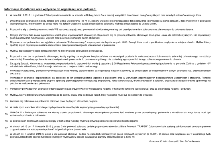 Informacje dodatkowe oraz wytyczne do organizacji ww. polowań: