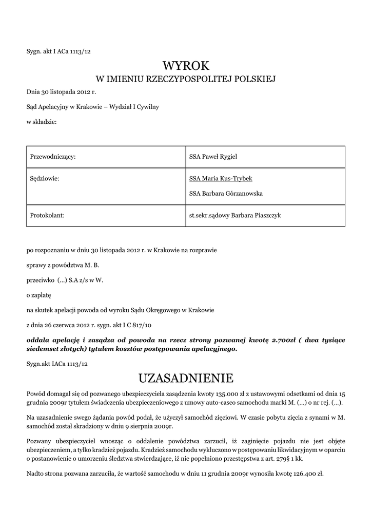 Sygn. akt I ACa 1113/12 WYROK W IMIENIU RZECZYPOSPOLITEJ POLSKIEJ Dnia 30 listopada 2012 r. Sąd Apelacyjny w Krakowie – Wydział I Cywilny w składzie: Przewodniczący: SSA Paweł Rygiel Sędziowie: SSA Maria Kus-Trybek SSA Barbara Górzanowska Protokolant: st.sekr.sądowy Barbara Piaszczyk po rozpoznaniu w dniu 30 listopada 2012 r. w Krakowie na rozprawie sprawy z powództwa M. B. przeciwko (...) S.A z/s w W. o zapłatę na skutek apelacji powoda od wyroku Sądu Okręgowego w Krakowie z dnia 26 czerwca 2012 r. sygn. akt I C 817/10 oddala apelację i zasądza od powoda na rzecz strony pozwanej kwotę 2.700zł ( dwa tysiące siedemset złotych) tytułem kosztów postępowania apelacyjnego. Sygn.akt IACa 1113/12 UZASADNIENIE Powód domagał się od pozwanego ubezpieczyciela zasądzenia kwoty 135.000 zł z ustawowymi odsetkami od dnia 15 grudnia 2009r tytułem świadczenia ubezpieczeniowego z umowy auto-casco samochodu marki M. (...) o nr rej. (...). Na uzasadnienie swego żądania powód podał, że użyczył samochód zięciowi. W czasie pobytu zięcia z synami w M. samochód został skradziony w dniu 9 sierpnia 2009r. Pozwany ubezpieczyciel wnosząc o oddalenie powództwa zarzucił, iż zaginięcie pojazdu nie jest objęte ubezpieczeniem, a tylko kradzież pojazdu. Kradzież samochodu wykluczono w postępowaniu likwidacyjnym w oparciu o postanowienie o umorzeniu śledztwa stwierdzające, iż nie popełniono przestępstwa z art. 279§ 1 kk. Nadto strona pozwana zarzuciła, że wartość samochodu w dniu 11 grudnia 2009r wynosiła kwotę 126.400 zł. Zaskarżonym wyrokiem Sąd Okręgowy w Krakowie oddalił powództwo i zasądził od powoda na rzecz strony pozwanej kwotę 4.206,32 zł tytułem kosztów postępowania. Rozstrzygnięcie Sądu Okręgowego oparte zostało na następujących ustaleniach faktycznych. W okresie objętym ubezpieczeniem skradziony został samochód marki M. (...) stanowiący własność powoda, wyprodukowany w 2008r, koloru czarnego o numerze rej. (...). Powód nabył samochód (jako rozbity) w USA za cenę 8.000 USD. W Polsce dokonał remontu samochodu, który zwiększył jego wartość. Za zgodą powoda z samochodu korzystali zięć M. O. (1) i jego synowie: A. O. i M. O. (2). A. O. i M. O. (2) zaproponowali M. O. (1) wspólny wyjazd do M. w dniach od 7 do 9 sierpnia 2009 r. W godzinach popołudniowych M. O. (1) przyjechał do M. i zaparkował samochód przy (...). W (...) spotkał się z synami oraz ich 3 znajomymi (M. K., J. K. i (...)), którzy przybyli do M. wcześniej innym samochodem. M. O. (1) i A. O. udali się do przystani, gdzie wsiedli na łódź (należącą do M. i J. K.) i dopłynęli do pomostu niedaleko Hotelu (...) w M., w którym powód miał zarezerwowany pokój. Po zakwaterowaniu w hotelu, M. O. (1) wrócił na łódź. W tym czasie wręczył kluczyki do samochodu synowi A. , który ze znajomymi korzystał z niego wieczorem. Tego dnia i w dniu następnym na łodzi odbywały się imprezy towarzyskie, w których brał udział M. O. (1) wraz z synami oraz ich koledzy. Uczestnicy spożywali alkohol. W dniu 9 sierpnia 2009 r. w godzinach południowych M. O. (1) opuścił Hotel (...) (z bagażami) wcześniej się wymeldowując. Około godz. 19.30 wrócił do hotelu informując jego personel, że skradziono mu samochód. Był zdenerwowany, zadzwonił na policję. Recepcjonistkę M. S.-S. poinformował, że w godzinach rannych wyjechał samochodem z parkingu hotelowego, ponieważ nie chciał blokować miejsca innym gościom i pozostawił go w alejce prowadzącej do hotelu. Około godz. 21 przyjechała Policja i funkcjonariusz udał się z M. O. (1) na wskazane przez niego miejsce pozostawienia pojazdu. Po oględzinach z policjantem G. R. miejsca pozostawienia samochodu, M. O. (1) ponownie zameldował się w Hotelu (...). Następnego dnia opuścił hotel i autobusem wrócił do W.. W dniu 12 sierpnia 2009 r. M. O. (1) zgłosił szkodę stronie pozwanej. W toku czynności likwidacyjnych złożył wymagane dokumenty i kluczyki do pojazdu (drugie kluczki posiadała Prokuratura Rejonowa w M.). Pismem z dnia 11 grudnia 2009 r. strona pozwana poinformowała powoda o odmowie wypłaty odszkodowania, podając, że nie doszło do kradzieży. W dniu 18 grudnia 2009 r powód wyrejestrował samochód. K. do pojazdu uznane zostały za dowody rzeczowe i przekazane stronie pozwanej w marcu 2010 r. W ustalonym stanie faktycznym Sąd Okręgowy przyjął, iż powództwo nie zasługuje na uwzględnienie. Powód nie wykazał faktu kradzieży pojazdu. Zeznania świadków : M. O. (1), A. O. i M. O. (2) w zasadniczych fragmentach są rozbieżne, mało racjonalne i logiczne oraz sprzeczne z zasadami doświadczenia życiowego, nie pozwalają na odtworzenie rzeczywistego przebiegu wydarzeń z udziałem M. O. (1) i innych uczestników w okresie trzydniowego pobytu w M. w sierpniu 2009r. Wątpliwe są zeznania powoda o kradzieży pojazdu w okolicznościach wskazanych. Prawomocne postanowienie Prokuratury Rejonowej w M. umarzające śledztwo stwierdza, iż nie dokonano kradzieży samochodu z włamaniem. Na powodzie spoczywał ciężar wykazania okoliczności kradzieży samochodu. Tego obowiązku procesowego powód nie dopełnił, co skutkuje oddalenie powództwa. Od powyższego wyroku apelację wniósł powód, wnosząc o zmianę wyroku przez uwzględnienie powództwa wraz z kosztami procesu, ewentualnie o uchylenie i przekazanie sprawy Sądowi I instancji do ponownego rozpoznania. Zaskarżonemu wyrokowi powód zarzucił ; - naruszenie art. 233 § 1 kpc przez dowolną ocenę zeznań świadków: M. O. (1), M. O. (2) i A. O., a w szczególności przez uznanie ich za niewiarygodne i wzajemnie sprzeczne, - naruszenie art. 244 § 1 kpc przez przyjęcie, iż decyzja starosty (...) o wyrejestrowaniu samochodu z dnia 18 grudnia 2009r nie stanowi dokumentu urzędowego stanowiącego dowód tego co zostało stwierdzone. Sąd Apelacyjny zważył, co następuje : Apelacja jest bezzasadna. Zarz