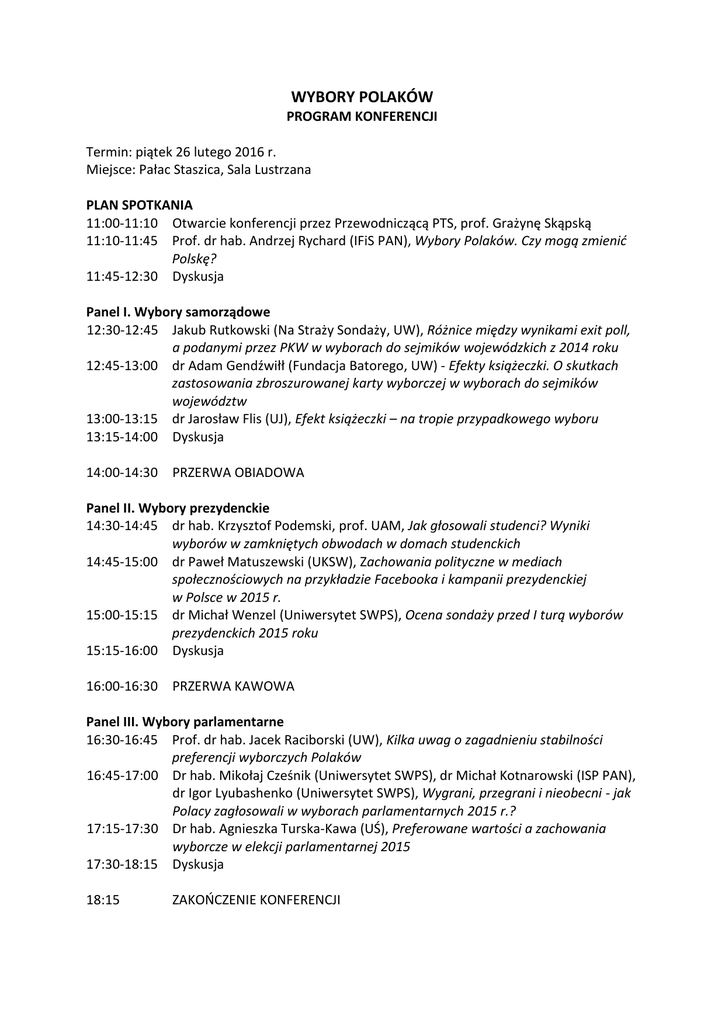 WYBORY POLAKÓW PROGRAM KONFERENCJI Termin: piątek 26 lutego 2016 r. Miejsce: Pałac Staszica, Sala Lustrzana PLAN SPOTKANIA 11:00-11:10 Otwarcie konferencji przez Przewodniczącą PTS, prof. Grażynę Skąpską 11:10-11:45 Prof. dr hab. Andrzej Rychard (IFiS PAN), Wybory Polaków. Czy mogą zmienić Polskę? 11:45-12:30 Dyskusja Panel I. Wybory samorządowe 12:30-12:45 Jakub Rutkowski (Na Straży Sondaży, UW), Różnice między wynikami exit poll, a podanymi przez PKW w wyborach do sejmików wojewódzkich z 2014 roku 12:45-13:00 dr Adam Gendźwiłł (Fundacja Batorego, UW) - Efekty książeczki. O skutkach zastosowania zbroszurowanej karty wyborczej w wyborach do sejmików województw 13:00-13:15 dr Jarosław Flis (UJ), Efekt książeczki – na tropie przypadkowego wyboru 13:15-14:00 Dyskusja 14:00-14:30 PRZERWA OBIADOWA Panel II. Wybory prezydenckie 14:30-14:45 dr hab. Krzysztof Podemski, prof. UAM, Jak głosowali studenci? Wyniki wyborów w zamkniętych obwodach w domach studenckich 14:45-15:00 dr Paweł Matuszewski (UKSW), Zachowania polityczne w mediach społecznościowych na przykładzie Facebooka i kampanii prezydenckiej w Polsce w 2015 r. 15:00-15:15 dr Michał Wenzel (Uniwersytet SWPS), Ocena sondaży przed I turą wyborów prezydenckich 2015 roku 15:15-16:00 Dyskusja 16:00-16:30 PRZERWA KAWOWA Panel III. Wybory parlamentarne 16:30-16:45 Prof. dr hab. Jacek Raciborski (UW), Kilka uwag o zagadnieniu stabilności preferencji wyborczych Polaków 16:45-17:00 Dr hab. Mikołaj Cześnik (Uniwersytet SWPS), dr Michał Kotnarowski (ISP PAN), dr Igor Lyubashenko (Uniwersytet SWPS), Wygrani, przegrani i nieobecni - jak Polacy zagłosowali w wyborach parlamentarnych 2015 r.? 17:15-17:30 Dr hab. Agnieszka Turska-Kawa (UŚ), Preferowane wartości a zachowania wyborcze w elekcji parlamentarnej 2015 17:30-18:15 Dyskusja 18:15 ZAKOŃCZENIE KONFERENCJI