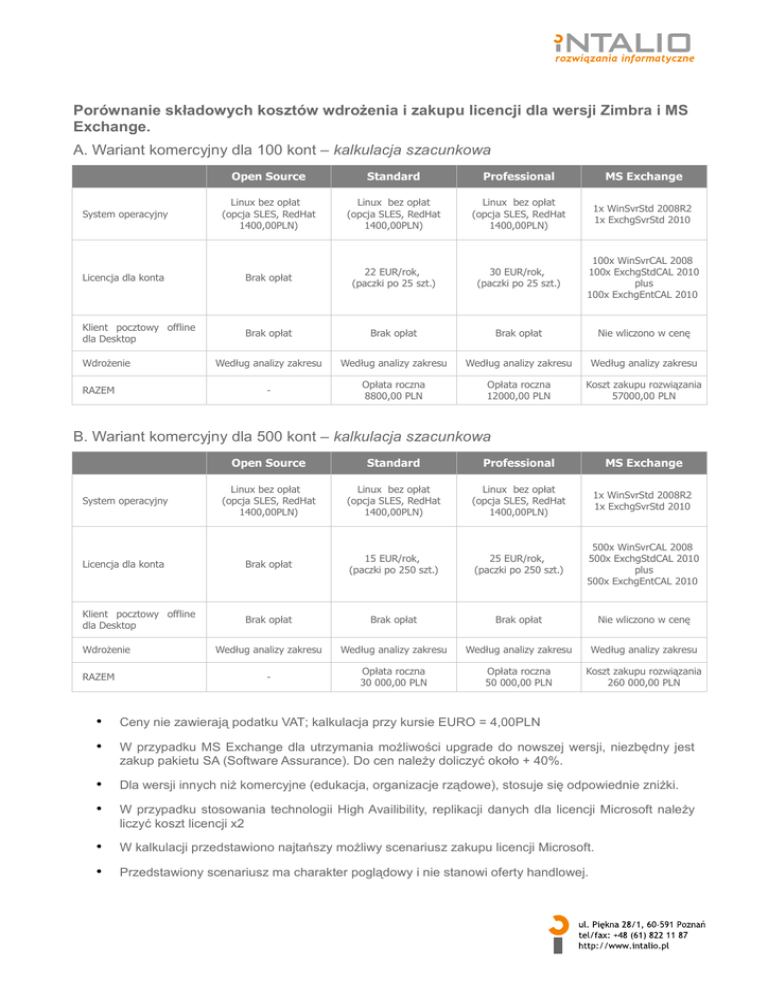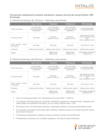 Porównanie składowych kosztów wdrożenia i zakupu licencji dla wersji Zimbra i MS Exchange. A. Wariant komercyjny dla 100 kont – kalkulacja szacunkowa Open Source Standard Professional MS Exchange Linux bez opłat (opcja SLES, RedHat 1400,00PLN) Linux bez opłat (opcja SLES, RedHat 1400,00PLN) Linux bez opłat (opcja SLES, RedHat 1400,00PLN) 1x WinSvrStd 2008R2 1x ExchgSvrStd 2010 Licencja dla konta Brak opłat 22 EUR/rok, (paczki po 25 szt.) 30 EUR/rok, (paczki po 25 szt.) 100x WinSvrCAL 2008 100x ExchgStdCAL 2010 plus 100x ExchgEntCAL 2010 Klient pocztowy offline dla Desktop Brak opłat Brak opłat Brak opłat Nie wliczono w cenę Według analizy zakresu Według analizy zakresu Według analizy zakresu Według analizy zakresu - Opłata roczna 8800,00 PLN Opłata roczna 12000,00 PLN Koszt zakupu rozwiązania 57000,00 PLN System operacyjny Wdrożenie RAZEM B. Wariant komercyjny dla 500 kont – kalkulacja szacunkowa Open Source Standard Professional MS Exchange Linux bez opłat (opcja SLES, RedHat 1400,00PLN) Linux bez opłat (opcja SLES, RedHat 1400,00PLN) Linux bez opłat (opcja SLES, RedHat 1400,00PLN) 1x WinSvrStd 2008R2 1x ExchgSvrStd 2010 Licencja dla konta Brak opłat 15 EUR/rok, (paczki po 250 szt.) 25 EUR/rok, (paczki po 250 szt.) 500x WinSvrCAL 2008 500x ExchgStdCAL 2010 plus 500x ExchgEntCAL 2010 Klient pocztowy offline dla Desktop Brak opłat Brak opłat Brak opłat Nie wliczono w cenę Według analizy zakresu Według analizy zakresu Według analizy zakresu Według analizy zakresu - Opłata roczna 30 000,00 PLN Opłata roczna 50 000,00 PLN Koszt zakupu rozwiązania 260 000,00 PLN System operacyjny Wdrożenie RAZEM • Ceny nie zawierają podatku VAT; kalkulacja przy kursie EURO = 4,00PLN • W przypadku MS Exchange dla utrzymania możliwości upgrade do nowszej wersji, niezbędny jest zakup pakietu SA (Software Assurance). Do cen należy doliczyć około + 40%. • Dla wersji innych niż komercyjne (edukacja, organizacje rządowe), stosuje się odpowiednie zniżki. • W przypadku stosowania technologii High Availibility, replikacji danych dla licencji Microsoft należy liczyć koszt licencji x2 • W kalkulacji przedstawiono najtańszy możliwy scenariusz zakupu licencji Microsoft. • Przedstawiony scenariusz ma charakter poglądowy i nie stanowi oferty handlowej.