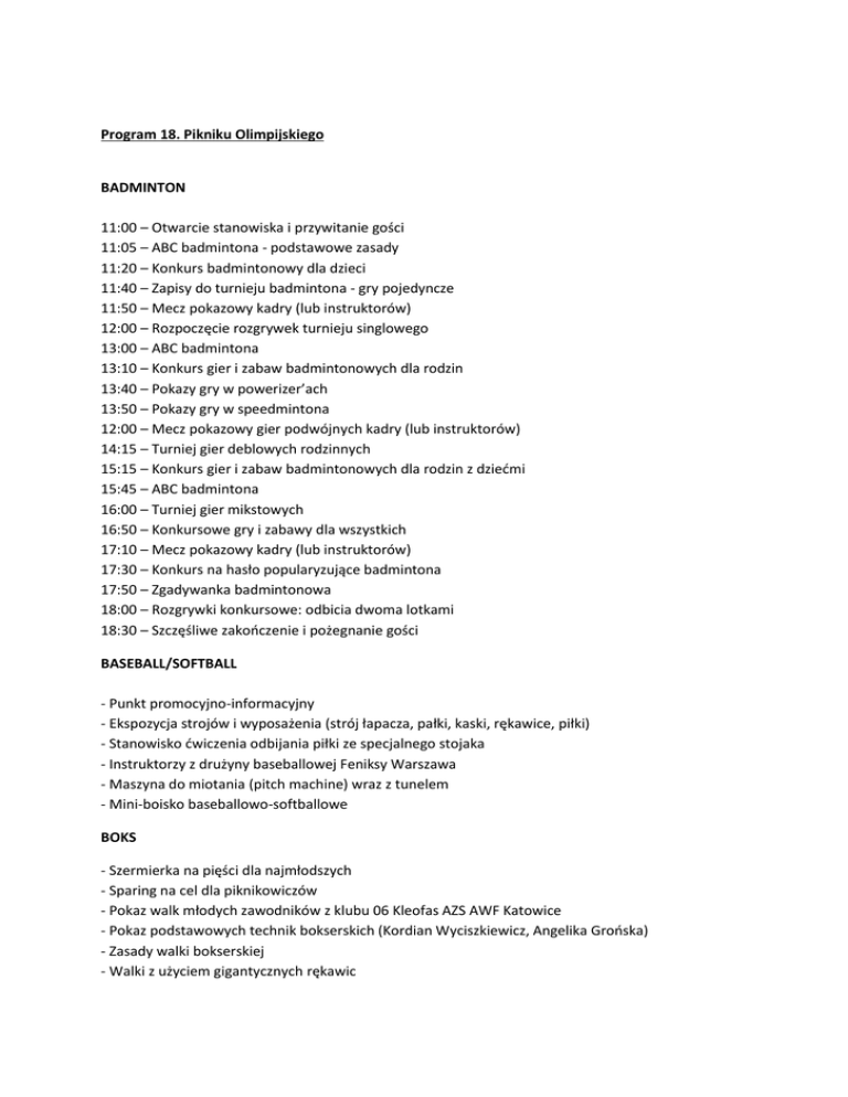 Program 18. Pikniku Olimpijskiego BADMINTON 11:00