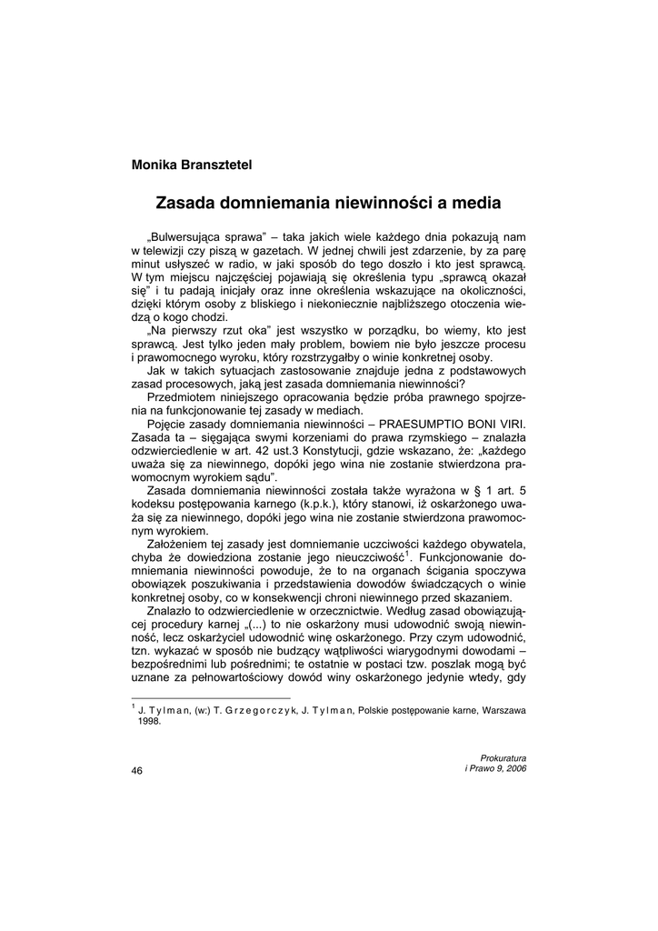 M. Bransztetel Monika Bransztetel Zasada domniemania niewinności a media „Bulwersująca sprawa” – taka jakich wiele każdego dnia pokazują nam w telewizji czy piszą w gazetach. W jednej chwili jest zdarzenie, by za parę minut usłyszeć w radio, w jaki sposób do tego doszło i kto jest sprawcą. W tym miejscu najczęściej pojawiają się określenia typu „sprawcą okazał się” i tu padają inicjały oraz inne określenia wskazujące na okoliczności, dzięki którym osoby z bliskiego i niekoniecznie najbliższego otoczenia wiedzą o kogo chodzi. „Na pierwszy rzut oka” jest wszystko w porządku, bo wiemy, kto jest sprawcą. Jest tylko jeden mały problem, bowiem nie było jeszcze procesu i prawomocnego wyroku, który rozstrzygałby o winie konkretnej osoby. Jak w takich sytuacjach zastosowanie znajduje jedna z podstawowych zasad procesowych, jaką jest zasada domniemania niewinności? Przedmiotem niniejszego opracowania będzie próba prawnego spojrzenia na funkcjonowanie tej zasady w mediach. Pojęcie zasady domniemania niewinności – PRAESUMPTIO BONI VIRI. Zasada ta – sięgająca swymi korzeniami do prawa rzymskiego – znalazła odzwierciedlenie w art. 42 ust.3 Konstytucji, gdzie wskazano, że: „każdego uważa się za niewinnego, dopóki jego wina nie zostanie stwierdzona prawomocnym wyrokiem sądu”. Zasada domniemania niewinności została także wyrażona w § 1 art. 5 kodeksu postępowania karnego (k.p.k.), który stanowi, iż oskarżonego uważa się za niewinnego, dopóki jego wina nie zostanie stwierdzona prawomocnym wyrokiem. Założeniem tej zasady jest domniemanie uczciwości każdego obywatela, chyba że dowiedziona zostanie jego nieuczciwość 1 . Funkcjonowanie domniemania niewinności powoduje, że to na organach ścigania spoczywa obowiązek poszukiwania i przedstawienia dowodów świadczących o winie konkretnej osoby, co w konsekwencji chroni niewinnego przed skazaniem. Znalazło to odzwierciedlenie w orzecznictwie. Według zasad obowiązującej procedury karnej „(...) to nie oskarżony musi udowodnić swoją niewinność, lecz oskarżyciel udowodnić winę oskarżonego. Przy czym udowodnić, tzn. wykazać w sposób nie budzący wątpliwości wiarygodnymi dowodami – bezpośrednimi lub pośrednimi; te ostatnie w postaci tzw. poszlak mogą być uznane za pełnowartościowy dowód winy oskarżonego jedynie wtedy, gdy 1 J. T y l m a n, (w:) T. G r z e g o r c z y k, J. T y l m a n, Polskie postępowanie karne, Warszawa 1998. 46 Prokuratura i Prawo 9, 2006 Zasada domniemania niewinności a media zespół tych poszlak pozwala na ustalenie jednej logicznej wersji zdarzenia, wykluczającej możliwość jakiejkolwiek innej wersji” 2 . O doniosłości tej zasady świadczy chociażby uregulowanie jej w międzynarodowych aktach prawnych, które w podobny sposób ujmują omawiane zagadnienie. Wspomniane regulacje znajdziemy między innymi w: – art. 6 ust. 2 Europejskiej Konwencji o Ochronie Praw Człowieka i Podstawowych Wolności sporządzonej w Rzymie dnia 4 listopada 1950 r., zmienionej następnie Protokołami nr 3, 5 i 8 oraz uzupełnionej Protokołem nr 2, – art. 14 ust. 2 Międzynarodowego Paktu Praw Politycznych i Obywatelskich otwarty do podpisu w Nowym Jorku dnia 19 grudnia 1966 r. Omawiana zasada stała się również przedmiotem rezolucji przyjętej na XII Kongresie Prawa Karnego w Hamburgu w 1979 roku. Uznano wówczas, iż domniemanie niewinności jest podstawową zasadą prawa karnego, przejawiająca się w tym, że: – nikt nie może zostać skazany lub formalnie uznany za winnego, póki przeciwko niemu nie zostanie przeprowadzone zgodnie z ustawą postępowanie sądowe, – w stosunku do takiej osoby nie można orzec kary lub równorzędnej sankcji, dopóki jej wina nie zostanie udowodniona zgodnie z ustawą, – od nikogo nie można wymagać, aby udowadniał swoją niewinność, – w razie wątpliwości ostateczne rozstrzygnięcie musi zapaść na korzyść oskarżonego 3 . W orzecznictwie strasburskim przyjmuje się, że domniemanie niewinności chroni oskarżonego zarówno w fazie postępowań poprzedzających postępowania sądowe aż do zakończenia postępowania odwoławczego 4 . Zasada domniemania niewinności jako domniemanie prawne wzruszalne (praesumptio iuris tantu) pozostaje w ścisłym związku z regułą in dubio pro reo – ujętą w art. 5 § 2 k.p.k. – oznaczającą, iż „nie dające się usunąć wątpliwości rozstrzyga się na korzyść oskarżonego” 5 . Adresatem normy wyrażonej w art. 5 § 1 k.p.k., w której swój wyraz znalazła zasada domniemania niewinności, są przede wszystkim organy prowadzące postępowanie, a więc np. policja, prokurator, sąd. Podkreślić należy, iż zamieszczenie zasady domniemania niewinności w art. 42 ust.3 Konstytucji powoduje, że oddziaływanie tego przepisu, nie ograniczająca się tylko do organów procesowych, lecz również swą emana2 Wyrok SA w Łodzi z dnia 25 maja 1995 r., II AKr 120/95, Prok. i Pr. 1996, dodatek „Orzecznictwo”, nr 7–8, poz. 20. 3 Tamże, s.125. 4 Z. G o s t y ń s k i, (w:) J. B a r t o s z e w s k i i in., t. I, 1998, s.162. 5 Szerzej: J. N e l k e n, Zasada in dubio pro reo w procesie karnym, NP. 1971, nr 3; M. C i e ś l a k, Polska procedura; K. D a s z k i e w i c z, Proces. Prokuratura i Prawo 9, 2006 47 M. Bransztetel cją obejmuje inne podmioty 6 . W wyniku tego konsekwencje zasady domniemania niewinności rozciągają się na aspekt procesowy i pozaprocesowy. Pomijając bardzo interesujące zagadnienie procesowych konsekwencji tejże zasady odniosę się do aspektu pozaprocesowego adresatów domniemania niewinności, jakim jest, w pewnym sensie, całe społeczeństwo. J. Tylman dzieli adresatów zasady domniemania niewinności na trzy grupy, a są to: 1) osoby fizyczne, 2) organy władzy i administracji, a także organy kierujące przedsiębiorstwami, instytucjami oraz organizacjami społecznymi, 3) media – czyli: pras