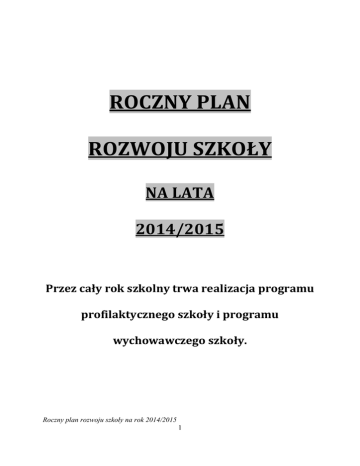 ROCZNY PLAN ROZWOJU SZKOŁY NA LATA 2014/2015 Przez cały rok szkolny trwa realizacja programu profilaktycznego szkoły i programu wychowawczego szkoły. Roczny plan rozwoju szkoły na rok 2014/2015 1 Źródła planu rozwoju szkoły na rok szkolny 2014/2015 1. Priorytety Ministra Edukacji Narodowej i Kuratora Oświaty na rok szkolny 2014/2015. 2. Podstawa programowa kształcenia ogólnego szkół podstawowych. 3. Raporty z wewnętrznej ewaluacji pracy szkoły w roku szkolnym 2014/2015. 4. Protokół z rady pedagogicznej z dnia 26 czerwca 2014 r. 5. Statut Szkoły. 6. Strategia rozwoju oświaty miasta Kędzierzyna- Koźla na lata 2011 – 2015. Podstawowe kierunki rozwoju polityki oświatowej państwa w roku szkolnym 2014/2015 MEN na podstawie przepisów ustawy o systemie oświaty (art.35 ust. 2 pkt. ) 1. Wspieranie rozwoju dziecka młodszego na I-szym i kolejnych etapach edukacyjnych w związku z obniżeniem wieku realizacji obowiązku szkolnego. 2. Podniesienie jakości kształcenia ponadgimnazjalnego w zakresie umiejętności określonych w podstawie programowej, ze szczególnym uwzględnieniem umiejętności w zakresie matematyki. 3. Profilaktyka agresji i przemocy w szkołach. 4. Edukacja włączająca uczniów niepełnosprawnych. Roczny plan rozwoju szkoły na rok 2014/2015 2 Zadania na rok szkolny 2014/2015 1. Wspieranie rozwoju dziecka młodszego na pierwszym i kolejnych etapach edukacyjnych w związku z obniżeniem wieku realizacji obowiązku szkolnego. 2. Profilaktyka agresji i przemocy w szkołach. Roczny plan rozwoju szkoły na rok 2014/2015 3 CELE DYDAKTYCZNE – objęcie opieką uczniów uzdolnionych i ze specyficznymi trudnościami w nauce, – podnoszenie poziomu i wyników pracy dydaktycznej poprzez stosowanie adekwatnych do potrzeb metod dydaktycznych, – pogłębianie znajomości zasad ortograficznych i interpunkcyjnych oraz poprawności językowej uczniów, – zachęcanie uczniów do samodzielnego zdobywania wiedzy poprzez umiejętne korzystanie z zasobów biblioteki szkolnej oraz sieci Internet, – zachęcenie uczniów do udziału w zajęciach dodatkowych organizowanych przez szkołę, – pogłębianie zainteresowań uczniów poprzez udział w projekcie Fascynujący Świat Nauki i Technologii, – doskonalenie umiejętności wykorzystania wiedzy w praktyce poprzez odpowiedni dobór treści i metod nauczania, – zachęcanie do uczestnictwa w konkursach i zawodach celem osiągnięcia wyższych wyników, – zadbanie o prawidłową organizację kształcenia uczniów niepełnosprawnych. WYCHOWAWCZE – pomoc uczniom klas pierwszych w adaptacji do życia szkoły ze szczególnym uwzględnieniem dzieci 6-letnich, – kształtowanie poczucia bezpieczeństwa u uczniów w szkole i w drodze do szkoły, – przeciwdziałanie agresji, – rozwijanie samorządności uczniowskiej, Roczny plan rozwoju szkoły na rok 2014/2015 4 – kształtowanie odpowiednich postaw uczniów w szkole i w środowisku, – kultywowanie tradycji szkolnych i regionalnych, – efektywne rozwiązywanie problemów wychowawczych, – pogłębianie współpracy z rodzicami w procesie wychowawczym i angażowanie ich w życie szkoły, – dyscyplinowanie uczniów klas młodszych podczas przechodzenia na posiłki i do szatni, – wsparcie nowych uczniów w procesie integracji w naszej szkole, zwłaszcza dzieci sześcioletnich. OPIEKUŃCZE – zapewnienie uczniom odpowiedniej opieki i wsparcia na terenie szkoły, – otoczenie troską dzieci znajdujących się w trudnej sytuacji materialnej i zaniedbanych środowiskowo. Zadania nauczyciela 1. Organizacja pracy dydaktyczno – wychowawczej ze szczególnym uwzględnieniem rzeczywistej samorządności uczniowskiej w szkole Sposób realizacji Osoba odpowiedzialna opiekun SU Rzecznik Praw Ucznia wychowawcy inni nauczyciele kierownik grupy wiekowej opiekun SU pedagog - wybory Samorządu Uczniowskiego, opiekuna SU oraz Rzecznika Praw Ucznia - wybory do samorządów klasowych - tworzenie planów pracy - dokonać ewaluacji programu wychowawczego celem jego modyfikacji - zapoznanie uczniów ze Statutem Szkoły, WSO, planami dydaktyczno wychowawcy – wychowawczymi, z zasadami klasyfikowania i oceniania - wyjaśnienie uczniom (kl. IV- VI) nazwę dokumentu oraz powiązać nazwę dokumentu z jego treścią - imprezy klasowe, szkolne, apele, uroczystości szkolne i wycieczki - prowadzenie gazetek, wystrój Rzecznik Praw klasopracowni Roczny plan rozwoju szkoły na rok 2014/2015 5 Termin cały rok 2. Doskonalenie i podnoszenie efektów pracy dydaktycznej szkoły 3. Współdziałanie z rodzicami w procesie wychowawczym i angażowanie ich w życie szkoły - szczegółowe ocenianie zachowania uczniów - Konwencja Praw Dziecka – zajęcia warsztatowe dla uczniów klas IV – VI - upowszechnianie aktywizujących metod nauczania. - analizowanie wyników osiąganych przez uczniów i uwzględnianie wniosków w doskonaleniu pracy dydaktycznej; diagnoza poziomu języków, gotowości szkolnej – odpowiedni dobór programów i podręczników - stwarzanie warunków dla rozwoju jednostek uzdolnionych (zajęcia pozalekcyjne, konkursy, wycieczki dydaktyczne, zawody, projekty, przeglądy, festiwale itp.) oraz uczniów z trudnościami (zajęcia wyrównawcze, zkk, indywidualne). - ewaluacja i doskonalenie systemu oceniania i zapoznawanie z nim uczniów i rodziców, wprowadzenie elementów oceniania kształtującego. - zadbanie o tzw. „porządną dydaktykę”, czyli: adekwatny dobór treści, obudowa metodyczna, podręczniki – prowadzenie zajęć z naciskiem na efekty kształcenia, a nie realizowanie materiału. - efektywnie wykorzystywać czas uczenia (zastępstwa, kalendarz imprez, dni wolne od zajęć dydaktyczno-wychowawczych). - zapoznanie rodziców ze Statutem Szkoły, WSO, planami dydaktyczno – wychowawczymi, z zasadami klasyfikowania i oceniania - wytłumaczyć , czym jest 5-letni program rozwoju szkoły - wskazać stronę internetową szkoły jako źródło informacji - zapo
