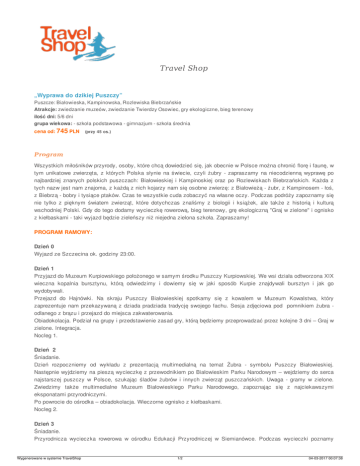 Travel Shop „Wyprawa do dzikiej Puszczy” Puszcze: Białowieska, Kampinowska, Rozlewiska Biebrzańskie Atrakcje: zwiedzanie muzeów, zwiedzanie Twierdzy Osowiec, gry ekologiczne, bieg terenowy ilość dni: 5/6 dni grupa wiekowa: - szkoła podstawowa - gimnazjum - szkoła średnia cena od: 745 PLN (przy 45 os.) Program Wszystkich miłośników przyrody, osoby, które chcą dowiedzieć się, jak obecnie w Polsce można chronić florę i faunę, w tym unikatowe zwierzęta, z których Polska słynie na świecie, czyli żubry - zapraszamy na niecodzienną wyprawę po najbardziej znanych polskich puszczach: Białowieskiej i Kampinoskiej oraz po Rozlewiskach Biebrzańskich. Każda z tych nazw jest nam znajoma, z każdą z nich kojarzy nam się osobne zwierzę: z Białowieżą - żubr, z Kampinosem - łoś, z Biebrzą - bobry i tysiące ptaków. Czas te wszystkie cuda zobaczyć na własne oczy. Podczas podróży zapoznamy się nie tylko z pięknym światem zwierząt, które dotychczas znaliśmy z biologii i książek, ale także z historią i kulturą wschodniej Polski. Gdy do tego dodamy wycieczkę rowerową, bieg terenowy, grę ekologiczną "Graj w zielone" i ognisko z kiełbaskami - taki wyjazd będzie zieleńszy niż niejedna zielona szkoła. Zapraszamy! PROGRAM RAMOWY: Dzień 0 Wyjazd ze Szczecina ok. godziny 23:00. Dzień 1 Przyjazd do Muzeum Kurpiowskiego położonego w samym środku Puszczy Kurpiowskiej. We wsi działa odtworzona XIX wieczna kopalnia bursztynu, którą odwiedzimy i dowiemy się w jaki sposób Kurpie znajdywali bursztyn i jak go wydobywali. Przejazd do Hajnówki. Na skraju Puszczy Białowieskiej spotkamy się z kowalem w Muzeum Kowalstwa, który zaprezentuje nam przekazywaną z dziada pradziada tradycję swojego fachu. Sesja zdjęciowa pod pomnikiem żubra odlanego z brązu i przejazd do miejsca zakwaterowania. Obiadokolacja. Podział na grupy i przedstawienie zasad gry, którą będziemy przeprowadzać przez kolejne 3 dni – Graj w zielone. Integracja. Nocleg 1. Dzień 2 Śniadanie. Dzień rozpoczniemy od wykładu z prezentacją multimedialną na temat Żubra - symbolu Puszczy Białowieskiej. Następnie wyjdziemy na pieszą wycieczkę z przewodnikiem po Białowieskim Parku Narodowym – wejdziemy do serca najstarszej puszczy w Polsce, szukając śladów żubrów i innych zwierząt puszczańskich. Uwaga - gramy w zielone. Zwiedzimy także multimedialne Muzeum Białowieskiego Parku Narodowego, zapoznając się z najciekawszymi eksponatami przyrodniczymi. Po powrocie do ośrodka – obiadokolacja. Wieczorne ognisko z kiełbaskami. Nocleg 2. Dzień 3 Śniadanie. Przyrodnicza wycieczka rowerowa w ośrodku Edukacji Przyrodniczej w Siemianówce. Podczas wycieczki poznamy Wygenerowane w systemie TravelShop 1/2 04-03-2017 00:07:38 ekosystem rzeki Narewki oraz zwierzaki z nim związane. Popołudniu w skansenie Sioło Budy weźmiemy udział w warsztatach „lepienie i gotowanie pierogów”, które zostaną przez uczestników spałaszowane razem z wiejską surówką z kiszonej kapusty lub ogórkami kiszonymi (każdy z uczestników zrobi min. 6 dużych pierogów z nadzieniem mięsnym, z kapustą i z nadzieniem „ruskim”). Powrót na obiadokolację. Wieczorny bieg terenowy z zagadkami przyrodniczymi i krajoznawczymi do rozwikłania. Nocleg 3. Dzień 4 Śniadanie. Wykwaterowanie. Przejazd przez Białystok i spacer po mieście, podczas którego zobaczymy Pałac Branickich, Sobór św. Mikołaja i archikatedrę . Następnie przejedziemy do królestwa łosia i bobra – w dolinę Biebrzy. Weźmiemy udział w zajęciach na terenach rozlewiskowych rzeki, które przybliżą uczestnikom różnorodności i bogactwo ptasiego świata Biebrzańskiego Parku Narodowego. Uczestnicy poznają charakterystyczne cechy ptaków wodnych i wodno-błotnych i drapieżnych typowych dla Bagien Biebrzańskich. Podczas obserwacji terenowych, nauczymy się rozpoznawania ptaków oraz poznamy sposoby ochrony miejsc ich występowania. Zwiedzimy Twierdzę Osowiec (zwaną polskim Verdun). Zwiedzanie fortu centralnego oraz Muzeum Twierdzy z przewodnikiem. Po południu przejazd do miejsca zakwaterowania. Obiadokolacja. Nocleg 4. Dzień 5. Śniadanie. Wykwaterowanie. Wyjazd w kierunku Puszczy Kampinpowskiej. Zajęcia warsztatowe na wybrany temat (las, płazy, drzewa, tropienie zwierząt) połączone z filmem edukacyjnym. Przejazd w kierunku Szczecina około godziny 15:00. Planowany powrót pod szkołę około godziny 24:00. Cena zawiera Transport,4 noclegi, 4 śniadania, 4 obiadokolacje, realizację programu , bilety wstępu do atrakcji wymienionych w programie, realizację zajęć edukacyjnych, opiekę przewodników zgodnie z programem, opiekę i komentarz pilota Travel Shop, miejsca gratis dla 4 Opiekunów (przy 45 uczestnikach), ubezpieczenie NNW i KL, podatek VAT. CENA NIE ZAWIERA: Ewentualny obiad w drodze powrotnej +18PLN/os. Dodatkowe informacje UWAGI: *Cena zostały ustalona dla grup liczących co najmniej 45 pełnopłatnych uczestników, **Cena dla grupy wyjeżdżającej ze Szczecina, ***Kolejność zwiedzania może ulec zmianie – wszelkie potencjalne zmiany wprowadzone będą po konsultacji z grupą; Wygenerowane w systemie TravelShop 2/2 04-03-2017 00:07:38