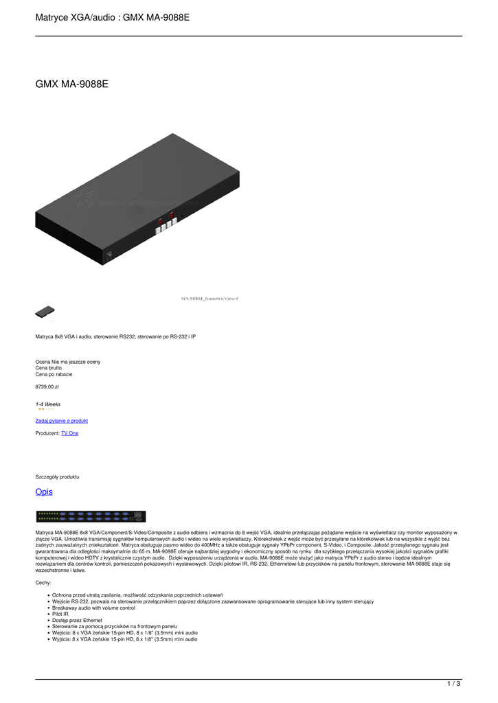 Matryce XGA/audio : GMX MA-9088E GMX MA-9088E Matryca 8x8 VGA i audio, sterowanie RS232, sterowanie po RS-232 i IP Ocena Nie ma jeszcze oceny Cena brutto Cena po rabacie 8739,00 zł Zadaj pytanie o produkt Producent: TV One Szczegóły produktu Opis Matryca MA-9088E 8x8 VGA/Component/S-Video/Composite z audio odbiera i wzmacnia do 8 wejść VGA, idealnie przełączając pożądane wejście na wyświetlacz czy monitor wyposażony w złącze VGA. Umożliwia transmisję sygnałów komputerowych audio i wideo na wiele wyświetlaczy. Którekolwiek z wejść może być przesyłane na którekolwiek lub na wszystkie z wyjść bez żadnych zauważalnych zniekształceń. Matryca obsługuje pasmo wideo do 400MHz a także obsługuje sygnały YPbPr component, S-Video, i Composite. Jakość przesyłanego sygnału jest gwarantowana dla odległości maksymalnie do 65 m. MA-9088E oferuje najbardziej wygodny i ekonomiczny sposób na rynku dla szybkiego przełączania wysokiej jakości sygnałów grafiki komputerowej i wideo HDTV z krystalicznie czystym audio. Dzięki wyposażeniu urządzenia w audio, MA-9088E może służyć jako matryca YPbPr z audio stereo i będzie idealnym rozwiązaniem dla centrów kontroli, pomieszczeń pokazowych i wystawowych. Dzięki pilotowi IR, RS-232, Ethernetowi lub przycisków na panelu frontowym, sterowanie MA-9088E staje się wszechstronne i łatwe. Cechy: Ochrona przed utratą zasilania, możliwość odzyskania poprzednich ustawień Wejście RS-232, pozwala na sterowanie przełącznikiem poprzez dołączone zaawansowane oprogramowanie sterujące lub inny system sterujący Breakaway audio with volume control Pilot IR Dostęp przez Ethernet Sterowanie za pomocą przycisków na frontowym panelu Wejścia: 8 x VGA żeńskie 15-pin HD, 8 x 1/8'' (3.5mm) mini audio Wyjścia: 8 x VGA żeńskie 15-pin HD, 8 x 1/8'' (3.5mm) mini audio 1/3 Matryce XGA/audio : GMX MA-9088E Konektory: HD15 (może być używana dla rozdzielczości PC do WUXGA — 1920x1200 lub HDTV do 1080p) Kompatybilne formaty: RGB, YPbPr lub RGBHV Uchywty rackowe 1RU Specyfikacja techniczna Nazwa Obsługiwane wejścia/wyjścia Pasmo przenoszenia wideo Obsługiwane rozdzielczości wideo Transmisja Obsługiwane audio Wejścia Konektor VGA Konektor RS-232 Konektor 3,5mm Konektor RJ45 Wybór wejścia Pilot IR MA-9088E Matryca HDMI 8x8 VGA/Component/S-Video/Composite 300MHz 1080p60, WUXGA (1920x1200@60) i UXGA (1600x1200@60) lub nawet wyższe HD (720p, 1080i) - 65 m (210 ft.) Analogowe stereo 8x VGA (poprzez adaptery: component, s-video, composite), 8x 3,5 mm analogowe stereo audio, 1x RS-232/1x Ethernet 8x VGA (poprzez adaptery: component, s-video, composite), 8x 3,5 mm analogowe stereo audio HD15 (15-pinowy D-Sub żeński DE9 (9-pinowy D-Sun żeński) Earphone jack do analogowego stereo audio Do sterowania za pomocą Ethernetu Ethernet/pilot IR/przycisk/RS-232 Cechy elektryczno-optyczne: częstotliwość=38kHz, Τ=25o Obudowa Wymiary urządzenia Wymiary opakowania Wymiary kartonu Masa urządzenia Masa z opakowaniem Mocowanie Zasilacz Pobór mocy Temperatura pracy Temperatura przechowywania Wilgotność względna Metalowa 1U - 44 x96x44mm (dł.x szer.x wys.) 490x225x70mm (dł.x szer.x wys.) 510x380x252mm (dł.x szer.x wys.) 890g 2100g Uchwyty rackowe 1U Wewnętrzny AC 100-240V Maks. 13W Od 0o do 40oC Od -20o do 60oC 20-90RH (bez kondensacji) Wyjścia Schemat połączeń English The MA-9088E 8x8 VGA/Component/S-Video/Composite Matrix with Audio receives and amplifies up to 8 VGA inputs, perfectly switches the desired input to the VGA equipped monitor or receiver. This matrix enables the broadcast of multiple computers’ audio and video outputs to multiple displays. Any one of the inputs can be broadcasted to any or all of the outputs without introducing noticeable video quality distortion. The matrix supports VGA video bandwidth up to 400MHz and also supports YPbPr component, S-Video, and Composite signals. The re-transmitted video quality is guaranteed and the longest transmission is up to 65 meters (210 feet). Therefore, MA-9088E offers the most convenient and cost effective means for swift switch of high quality PC graphics and HDTV videos with crystal clear audio in the market. With equipped audio matrix, MA-9088E is ready to be as YPbPr matrix with stereo audio and ideally for boardroom, showroom, and exhibition. Through IR remote, RS-232, Ethenet or front panel push button, the control of MA-9088E becomes versatile and easier. Features Power-fail protection, allows switcher to restore previous settings RS-232 communication control input, allows to control switcher via included advanced control software or third party control system Breakaway audio with volume control IR remote control Ethernet accessible Front panel button control Inputs: 8 x VGA female15-pin HD, 8 x 1/8'' (3.5mm) mini audio Outputs: 8 x VGA female 15-pin HD, 8 x 1/8'' (3.5mm) mini audio Connectors: 15-pin HD (could be used for PC resolutions up to WUXGA — 1920x1200 or HDTV up to 1080p) 2/3 Matryce XGA/audio : GMX MA-9088E Compatible formats: RGB, YPbPr or RGBHV 1RU Rack mountable 3/3 Powered by TCPDF (www.tcpdf.org)