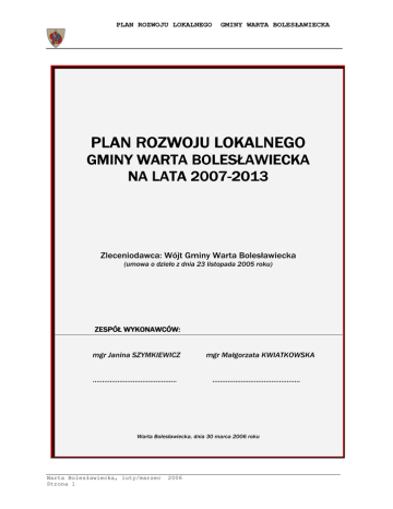 PLAN ROZWOJU LOKALNEGO GMINY WARTA BOLESŁAWIECKA PLAN ROZWOJU LOKALNEGO GMINY WARTA BOLESŁAWIECKA NA LATA 20072007-2013 Zleceniodawca: Wójt Gminy Warta Bolesławiecka (umowa o dzieło z dnia 23 listopada 2005 roku) ZESPÓŁ WYKONAWCÓW: mgr Janina SZYMKIEWICZ ............................................ mgr Małgorzata KWIATKOWSKA .............................................. Warta Bolesławiecka, dnia 30 marca 2006 roku Warta Bolesławiecka, luty/marzec Strona 1 2006 PLAN ROZWOJU LOKALNEGO GMINY WARTA BOLESŁAWIECKA SPIS TREŚCI strona I. WSTĘP ..................................................................................................................................... 3 OBSZAR 4 I CZAS TRWANIA PLANU ROZWOJU LOKALNEGO .................................................. II. AKTUALNA SYTUACJA SPOŁECZNO-GOSPODARCZA OBSZARU OBJĘTEGO WDRAŻANIEM PLANU ..................................................................................................................................... 1. 2. 3. 4. III. INFORMACJE OGÓLNE: .................................................................................................. 1.1. położenie, powierzchnia, ludność ........................................................... 1.2. środowisko przyrodnicze .......................................................................... 1.3. kultura, sport, turystyka ........................................................................... 1.4. analiza SWOT ........................................................................................... SFERA PRZESTRZENNA ................................................................................................ 2.1. uwarunkowanie ochrony środowiska naturalnego, w tym na terenach poprzemysłowych i powojskowych ......................................... 2.2. własność gruntów i budynków ................................................................ 2.3. infrastruktura techniczna ........................................................................ 2.4. stan obiektów dziedzictwa kulturowego ................................................. SFERA GOSPODARCZA .................................................................................................. 3.1. struktura branż na terenie gminy ........................................................... 3.2. pracodawcy .............................................................................................. 3.3. zatrudnienie według branż ...................................................................... SFERA SPOŁECZNA ....................................................................................................... 4.1. sytuacja demograficzna .......................................................................... 4.2. warunki i jakość życia i bezpieczeństwo mieszkańców ........................ 4.3. grupy społeczne wymagające wsparcia ................................................. 4.4. możliwości rynku pracy ........................................................................... IDENTYFIKACJA PROBLEMÓW W WYZNACZONYCH PRIORYTETACH I DZIAŁANIACH STRATEGICZNYCH ................................................................................................................ 1. Sfera przestrzenna .................................................................................................. 2. Sfera gospodarcza .................................................................................................. 3. Sfera społeczna ...................................................................................................... IV. CELE STRATEGICZNE I CELE OPERACYJNE .......................................................................... 1. Sfera przestrzenna................................................................................................... 2. Sfera gospodarcza .................................................................................................. 3. Sfera społeczna ...................................................................................................... V. 5 5 5 7 15 17 23 23 25 26 43 45 45 46 48 50 50 51 55 58 96 96 103 105 109 109 115 117 120 ZGODNOŚĆ PRZYJĘTYCH CELÓW STRATEGICZNYCH Z DOKUMENTAMI STRATEGICZNYMI WSPÓLNOTY, KRAJU, REGIONU, GMINY ............................................... VI. MIERNIKI PRODUKTU I REZULTATU JAKO WYZNACZNIKI EFEKTÓW REALIZACJI CELÓW OPERACYJNYCH I OSIĄGNIĘCIA CELÓW STRATEGICZNYCH PRZYJĘTYCH W PLANIE ROZWOJU LOKALNEGO ......................................................................................................... 127 VII. REALIZACJA CELÓW OPERACYJNYCH/ZADAŃ W LATACH 2007-2013 ORAZ STOPIEŃ ICH WAŻNOŚCI ....................................................................................................................... 138 VIII. SYSTEM WDRAŻANIA PLANU, SPOSÓB MONITOROWANIA, OCENY I KOMUNIKACJI SPOŁECZNEJ .......................................................................................................................... 1. System wdrażania Planu ........................................................................................ 2. Sposób monitorowania Planu ................................................................................ 3. Sposób oceny Planu ............................................................................................... 4. Komunikacja Społeczna – czyli public relations Planu ........................................ 5. Inicjowanie współpracy pomiędzy sektorem publicznym, 151 151 151 154 155 157 prywatnym i organizacjami pozarządowymi ................................ Strona 2 Warta Bolesławiecka, luty/marzec 2006 PLAN ROZWOJU LOKALNEGO GMINY WARTA BOLESŁAWIECKA WSTĘP Plan Rozwoju Lokalnego (PRL) jest dokumentem planistycznym wyznaczającym kierunek przyszłych zmian społeczno-gospodarczych gminy Warta Bolesławiecka i wpływających na jej atrakcyjność. Obowiązek opracowania planu wynika z 