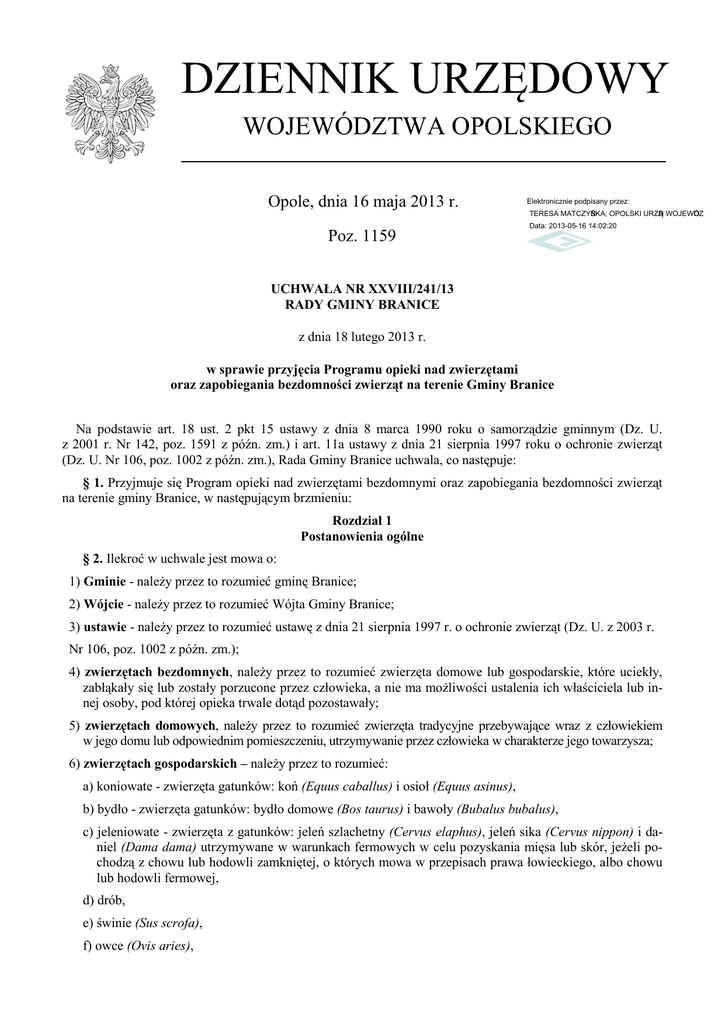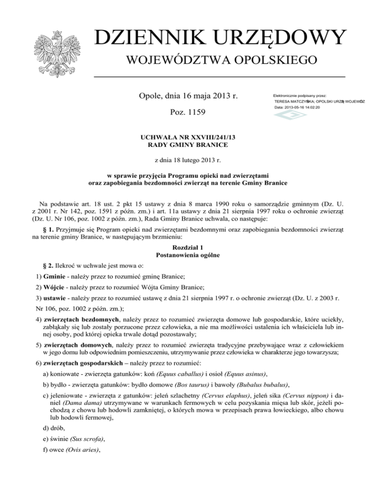 DZIENNIK URZĘDOWY WOJEWÓDZTWA OPOLSKIEGO Opole, dnia 16 maja 2013 r. Elektronicznie podpisany przez: TERESA MATCZYŃSKA; OPOLSKI URZĄD WOJEWÓDZKI Poz. 1159 Data: 2013-05-16 14:02:20 UCHWAŁA NR XXVIII/241/13 RADY GMINY BRANICE z dnia 18 lutego 2013 r. w sprawie przyjęcia Programu opieki nad zwierzętami oraz zapobiegania bezdomności zwierząt na terenie Gminy Branice Na podstawie art. 18 ust. 2 pkt 15 ustawy z dnia 8 marca 1990 roku o samorządzie gminnym (Dz. U. z 2001 r. Nr 142, poz. 1591 z późn. zm.) i art. 11a ustawy z dnia 21 sierpnia 1997 roku o ochronie zwierząt (Dz. U. Nr 106, poz. 1002 z późn. zm.), Rada Gminy Branice uchwala, co następuje: § 1. Przyjmuje się Program opieki nad zwierzętami bezdomnymi oraz zapobiegania bezdomności zwierząt na terenie gminy Branice, w następującym brzmieniu: Rozdział 1 Postanowienia ogólne § 2. Ilekroć w uchwale jest mowa o: 1) Gminie - należy przez to rozumieć gminę Branice; 2) Wójcie - należy przez to rozumieć Wójta Gminy Branice; 3) ustawie - należy przez to rozumieć ustawę z dnia 21 sierpnia 1997 r. o ochronie zwierząt (Dz. U. z 2003 r. Nr 106, poz. 1002 z późn. zm.); 4) zwierzętach bezdomnych, należy przez to rozumieć zwierzęta domowe lub gospodarskie, które uciekły, zabłąkały się lub zostały porzucone przez człowieka, a nie ma możliwości ustalenia ich właściciela lub innej osoby, pod której opieka trwale dotąd pozostawały; 5) zwierzętach domowych, należy przez to rozumieć zwierzęta tradycyjne przebywające wraz z człowiekiem w jego domu lub odpowiednim pomieszczeniu, utrzymywanie przez człowieka w charakterze jego towarzysza; 6) zwierzętach gospodarskich – należy przez to rozumieć: a) koniowate - zwierzęta gatunków: koń (Equus caballus) i osioł (Equus asinus), b) bydło - zwierzęta gatunków: bydło domowe (Bos taurus) i bawoły (Bubalus bubalus), c) jeleniowate - zwierzęta z gatunków: jeleń szlachetny (Cervus elaphus), jeleń sika (Cervus nippon) i daniel (Dama dama) utrzymywane w warunkach fermowych w celu pozyskania mięsa lub skór, jeżeli pochodzą z chowu lub hodowli zamkniętej, o których mowa w przepisach prawa łowieckiego, albo chowu lub hodowli fermowej, d) drób, e) świnie (Sus scrofa), f) owce (Ovis aries), Dziennik Urzędowy Województwa Opolskiego –2– Poz. 1159 g) kozy (Capra hircus), h) pszczołę miodną (Apis mellifera), i) zwierzęta futerkowe; 7) kotach wolno żyjących, należy przez to rozumieć koty urodzone lub żyjące na wolności, w stanie dzikim, nieudomowione, żyjące w warunkach niezależnych od człowieka; 8) Programie, należy przez to rozumieć Program opieki nad zwierzętami bezdomnymi oraz zapobiegania bezdomności zwierząt na terenie gminy Branice; 9) lekarzu weterynarii, należy przez to rozumieć lekarza weterynarii, z którym Gmina Branice posiada zawartą umowę - Aleksander Szeliga, Branice ul. Żymierskiego 60a; 10) Schronisku, należy przez to rozumieć schronisko dla zwierząt, z którym Gmina Branice posiada zawartą umowę na przyjmowanie zwierząt z jej terenu - Schronisko Racibórz Przedsiębiorstwo Komunalne sp. z o.o. Racibórz, ul. Komunalna 9; 11) tymczasowym azylu dla bezdomnych zwierząt, należy rozumieć azyl, z którym Gmina Branice posiada zawartą umowę na czasowe przetrzymywanie zwierząt przyjmowanie zwierząt z jej terenu do chwili odnalezienia dotychczasowego właściciela lub opiekuna, lub do czasu oddania do adopcji. Rozdział 2 Cel i zadania Programu § 3.1. Celem Programu jest zapobieganie bezdomności zwierząt na terenie gminy Branice oraz opieka nad zwierzętami bezdomnymi. 2. Zadania priorytetowe Programu to: 1) ograniczanie zjawiska bezdomności zwierząt domowych na terenie Gminy; 2) zapewnienie właściwej opieki bezdomnym zwierzętom domowym i gospodarskim na terenie Gminy; 3) ograniczenie populacji bezdomnych zwierząt poprzez sterylizację i kastrację zwierząt domowych, w szczególności psów i kotów; 4) poprawa bezpieczeństwa i porządku publicznego na terenie gminy; 5) sprawowanie opieki nad kotami wolno żyjącymi, w tym ich dokarmianie; 6) popularyzacja form utrzymania i hodowli zwierząt domowych, w tym psów oraz kotów; 7) promowanie prawidłowych postaw i zachowań człowieka w stosunku do zwierząt; 8) edukacja w zakresie opieki nad zwierzętami. Rozdział 3 Formy opieki nad bezdomnymi zwierzętami oraz przeciwdziałania bezdomności zwierząt § 4. Opieka nad bezdomnymi zwierzętami na terenie Gminy Branice polega w szczególności na: 1. Objęciu opieką zwierząt przebywających w schronisku dla zwierząt lub w tymczasowym azylu dla bezdomnych zwierząt poprzez zapewnienie im właściwych warunków bytowania oraz zapewnienie opieki weterynaryjnej na zasadach określonych w zawartych umowach. 2. Dokarmianiu dziko żyjących kotów na terenie ich przebywania. 3. Procedura postępowania w przypadku każdego zgłoszenia dot. zwierząt stanowi załącznik do niniejszej uchwały. § 5.1. Przeciwdziałanie bezdomności zwierząt na terenie Gminy Branice polega w szczególności na: 1) zapewnienie bezdomnym zwierzętom miejsca w schronisku dla zwierząt, z którym Gmina ma zawartą umowę; 2) odławianiu bezdomnych zwierząt; 3) poszukiwaniu właścicieli dla bezdomnych zwierząt; 4) wskazaniu gospodarstwa rolnego w celu zapewnienia miejsca dla zwierząt gospodarskich. Dziennik Urzędowy Województwa Opolskiego –3– Poz. 1159 2. W przypadku ustalenia właściciela zwierzęcia bezdomnego, które zostało umieszczone w schronisku, właściciel zobowiązany jest zwrócić Gminie Branice poniesione przez nią koszty związane z wyłapaniem, pobytem i opieką lekarsko-weterynaryjną. § 6.1. Odławianie bezdomnych zwierząt na terenie Gminy Branice przeprowadza się poprzez wyłapywanie zwierząt bezdomnych: a) stałe, na interwencje zgłoszone na nr zgłoszeniowy Gminy 774868228 w. 28, b) okresowe, po wcześniejszym ogłoszeniu. 2. Wyłapywaniem będą objęte bezdomne, zwier