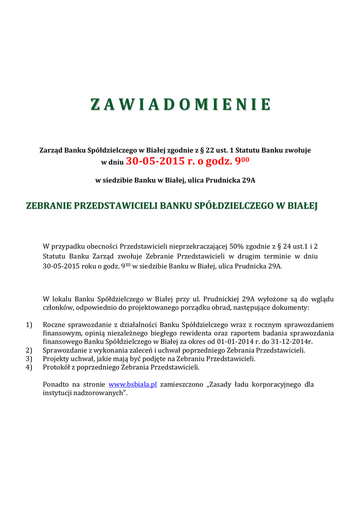 ZAWIADOMIENIE Zarząd Banku Spółdzielczego w Białej zgodnie z § 22 ust. 1 Statutu Banku zwołuje w dniu 30-05-2015 r. o godz. 900 w siedzibie Banku w Białej, ulica Prudnicka 29A ZEBRANIE PRZEDSTAWICIELI BANKU SPÓŁDZIELCZEGO W BIAŁEJ W przypadku obecności Przedstawicieli nieprzekraczającej 50% zgodnie z § 24 ust.1 i 2 Statutu Banku Zarząd zwołuje Zebranie Przedstawicieli w drugim terminie w dniu 30-05-2015 roku o godz. 930 w siedzibie Banku w Białej, ulica Prudnicka 29A. W lokalu Banku Spółdzielczego w Białej przy ul. Prudnickiej 29A wyłożone są do wglądu członków, odpowiednio do projektowanego porządku obrad, następujące dokumenty: 1) 2) 3) 4) Roczne sprawozdanie z działalności Banku Spółdzielczego wraz z rocznym sprawozdaniem finansowym, opinią niezależnego biegłego rewidenta oraz raportem badania sprawozdania finansowego Banku Spółdzielczego w Białej za okres od 01-01-2014 r. do 31-12-2014r. Sprawozdanie z wykonania zaleceń i uchwał poprzedniego Zebrania Przedstawicieli. Projekty uchwał, jakie mają być podjęte na Zebraniu Przedstawicieli. Protokół z poprzedniego Zebrania Przedstawicieli. Ponadto na stronie www.bsbiala.pl zamieszczono „Zasady ładu korporacyjnego dla instytucji nadzorowanych”. Porządek obrad Zebrania Przedstawicieli Banku Spółdzielczego w Białej w dniu 30-05-2015 roku 1. Otwarcie, stwierdzenie prawidłowości zwołania Zebrania i zdolności do podejmowania uchwał. 2. Przyjęcie Regulaminu obrad Zebrania. 3. Wybór Przewodniczącego i Sekretarza Zebrania. 4. Przyjęcie porządku obrad Zebrania. 5. Wybór Komisji Uchwał i Wniosków oraz Komisji ds. oceny odpowiedniości. 6. Przyjęcie protokołu z poprzedniego Zebrania Przedstawicieli. 7. Podjęcie uchwały w sprawie zmiany Statutu Banku Spółdzielczego w Białej. 8. Przyjęcie „Polityki dokonywania ocen odpowiedniości członków Rady Nadzorczej Banku Spółdzielczego w Białej”. 9. Przedstawienie sprawozdania Zarządu z działalności Banku Spółdzielczego w Białej za 2014 rok wraz ze sprawozdaniem z wykonania uchwał z poprzedniego Zebrania Przedstawicieli, wniosków z Zebrań Grup Członkowskich oraz realizacji wniosków polustracyjnych. 10. Przedstawienie sprawozdania finansowego wraz z opinią niezależnego biegłego rewidenta z badania sprawozdania finansowego za 2014 rok. 11. Przedstawienie sprawozdania z działalności Rady Nadzorczej Banku Spółdzielczego w Białej za rok 2014. 12. Dyskusja. 13. Podjęcie uchwał w sprawach: 1) zatwierdzenia sprawozdania Zarządu z działalności Banku Spółdzielczego w Białej za 2014 rok; 2) zatwierdzenia sprawozdania finansowego Banku Spółdzielczego w Białej za 2014 rok; 3) udzielenia absolutorium Członkom Zarządu Banku Spółdzielczego w Białej z wykonania przez nich obowiązków w roku 2014; 4) oceny odpowiedniości członków Rady Nadzorczej Banku Spółdzielczego w Białej; 5) zatwierdzenia sprawozdania Rady Nadzorczej Banku Spółdzielczego w Białej za 2014 rok; 6) podziału nadwyżki bilansowej Banku Spółdzielczego w Białej za 2014 rok; 7) oznaczenia najwyższej sumy zobowiązań; 8) wdrożenia „Zasad ładu korporacyjnego dla instytucji nadzorowanych”; 9) przyjęcia „Polityki wynagrodzeń Członków organu nadzorującego w Banku Spółdzielczym w Białej”; 10) przyjęcia „Regulaminu działania Rady Nadzorczej Banku Spółdzielczego w Białej”. 14. Rozpatrzenie i uchwalenie kierunków działania Banku Spółdzielczego w Białej na 2015 rok. 15. Wolne wnioski. 16. Zamknięcie obrad. Zarząd Banku Spółdzielczego w Białej