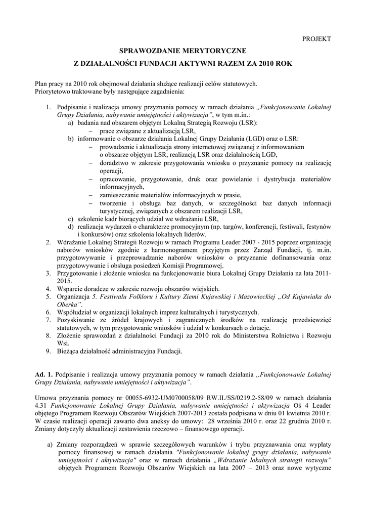 PROJEKT SPRAWOZDANIE MERYTORYCZNE Z DZIAŁALNOŚCI FUNDACJI AKTYWNI RAZEM ZA 2010 ROK Plan pracy na 2010 rok obejmował działania służące realizacji celów statutowych. Priorytetowo traktowane były następujące zagadnienia: 1. Podpisanie i realizacja umowy przyznania pomocy w ramach działania „Funkcjonowanie Lokalnej Grupy Działania, nabywanie umiejętności i aktywizacja”, w tym m.in.: a) badania nad obszarem objętym Lokalną Strategią Rozwoju (LSR): − prace związane z aktualizacją LSR, b) informowanie o obszarze działania Lokalnej Grupy Działania (LGD) oraz o LSR: − prowadzenie i aktualizacja strony internetowej związanej z informowaniem o obszarze objętym LSR, realizacją LSR oraz działalnością LGD, − doradztwo w zakresie przygotowania wniosku o przyznanie pomocy na realizację operacji, − opracowanie, przygotowanie, druk oraz powielanie i dystrybucja materiałów informacyjnych, − zamieszczanie materiałów informacyjnych w prasie, − tworzenie i obsługa baz danych, w szczególności baz danych informacji turystycznej, związanych z obszarem realizacji LSR, c) szkolenie kadr biorących udział we wdrażaniu LSR, d) realizacja wydarzeń o charakterze promocyjnym (np. targów, konferencji, festiwali, festynów i konkursów) oraz szkolenia lokalnych liderów. 2. Wdrażanie Lokalnej Strategii Rozwoju w ramach Programu Leader 2007 - 2015 poprzez organizację naborów wniosków zgodnie z harmonogramem przyjętym przez Zarząd Fundacji, tj. m.in. przygotowywanie i przeprowadzanie naborów wniosków o przyznanie dofinansowania oraz przygotowywanie i obsługa posiedzeń Komisji Programowej. 3. Przygotowanie i złożenie wniosku na funkcjonowanie biura Lokalnej Grupy Działania na lata 20112015. 4. Wsparcie doradcze w zakresie rozwoju obszarów wiejskich. 5. Organizacja 5. Festiwalu Folkloru i Kultury Ziemi Kujawskiej i Mazowieckiej „Od Kujawiaka do Oberka”. 6. Współudział w organizacji lokalnych imprez kulturalnych i turystycznych. 7. Pozyskiwanie ze źródeł krajowych i zagranicznych środków na realizację przedsięwzięć statutowych, w tym przygotowanie wniosków i udział w konkursach o dotacje. 8. Złożenie sprawozdań z działalności Fundacji za 2010 rok do Ministerstwa Rolnictwa i Rozwoju Wsi. 9. Bieżąca działalność administracyjna Fundacji. Ad. 1. Podpisanie i realizacja umowy przyznania pomocy w ramach działania „Funkcjonowanie Lokalnej Grupy Działania, nabywanie umiejętności i aktywizacja”. Umowa przyznania pomocy nr 00055-6932-UM0700058/09 RW.II./SS/0219.2-58/09 w ramach działania 4.31 Funkcjonowanie Lokalnej Grupy Działania, nabywanie umiejętności i aktywizacja Oś 4 Leader objętego Programem Rozwoju Obszarów Wiejskich 2007-2013 została podpisana w dniu 01 kwietnia 2010 r. W czasie realizacji operacji zawarto dwa aneksy do umowy: 28 września 2010 r. oraz 22 grudnia 2010 r. Zmiany dotyczyły aktualizacji zestawienia rzeczowo – finansowego operacji. a) Zmiany rozporządzeń w sprawie szczegółowych warunków i trybu przyznawania oraz wypłaty pomocy finansowej w ramach działania "Funkcjonowanie lokalnej grupy działania, nabywanie umiejętności i aktywizacja" oraz w ramach działania „Wdrażanie lokalnych strategii rozwoju” objętych Programem Rozwoju Obszarów Wiejskich na lata 2007 – 2013 oraz nowe wytyczne Ministerstwa Rolnictwa i Rozwoju Wsi nałożyły na Fundację obowiązek aktualizacji Lokalnej Strategii Rozwoju Nadwiślańskiego Pogranicza Mazowiecko-Kujawskiego. Aktualizacją zostały objęte rozdziały: 1. Charakterystyka LGD. 2. Obszar objęty LSR. 3. Analiza SWOT dla obszaru objętego LSR. 4. Cele ogólne i szczegółowe LSR (w tym wskaźniki i kryteria wyboru operacji). 5. Wewnętrzna spójność LSR – specyfika obszaru, SWOT, cele, przedsięwzięcia. 6. Podejście zintegrowane i innowacyjne. 7. Procedury przyjmowania wniosków oraz oceny i wyboru operacji. 8. Budżet. Z Lokalnej Strategii Rozwoju został usunięty rozdział, w którym zawarto szczegółowy opis działań PROW. Zaktualizowano i zweryfikowano załączniki do LSR. W pracach nad aktualizacją LSR wykorzystano: − materiały szkoleniowe i wytyczne Ministerstwa Rolnictwa i Rozwoju Wsi, − poradnik „Kryteria i wskaźniki LSR”, − Rozporządzenie Ministra Rolnictwa i Rozwoju Wsi z dnia 19 sierpnia 2010 r. zmieniające rozporządzenie w sprawie szczegółowych warunków i trybu przyznawania oraz wypłaty pomocy finansowej w ramach działania "Wdrażanie lokalnych strategii rozwoju" objętego Programem Rozwoju Obszarów Wiejskich na lata 2007-2013 (Dz.U. 2010 nr 158 poz.1067), − Rozporządzenie Ministra Rolnictwa i Rozwoju Wsi z dnia 12 sierpnia 2010 r. zmieniające rozporządzenie w sprawie szczegółowych warunków i trybu przyznawania oraz wypłaty pomocy finansowej w ramach działania "Funkcjonowanie lokalnej grupy działania, nabywanie umiejętności i aktywizacja" objętego Programem Rozwoju Obszarów Wiejskich na lata 2007-2013 (Dz.U. 2010 nr 153 poz. 1029), − materiały warsztatowe wypracowane przez członków Zarządu, Komisji Programowej i pracowników biura Fundacji, − uwagi, propozycje i potrzeby zgłaszane przez potencjalnych beneficjentów pomocy. b) w ramach informowania o obszarze działania Lokalnej Grupy Działania oraz o LSR wykonano następujące zadania: • modernizacja i przebudowa strony internetowej Fundacji • bieżąca aktualizacja i zamieszczanie informacji dotyczących prowadzonych naborów • doradztwo w zakresie przygotowania wniosków o przyznanie pomocy na realizację operacji • doradztwo w zakresie realizacji i rozliczania wniosków o przyznanie pomocy na realizację operacji • opracowanie i wydanie materiałów informacyjnych i promocyjnych w postaci: − plakatów (650 egz.), − publikacji Z Mazowsza i Kujaw, zbiór wierszy (500 egz.), − publikacji Z Mazowsza i Kujaw, wybrane przepisy” (500 egz.), − toreb ekologicznych (1200 szt.), − ulotek informacyjnych o LGD (1000 s