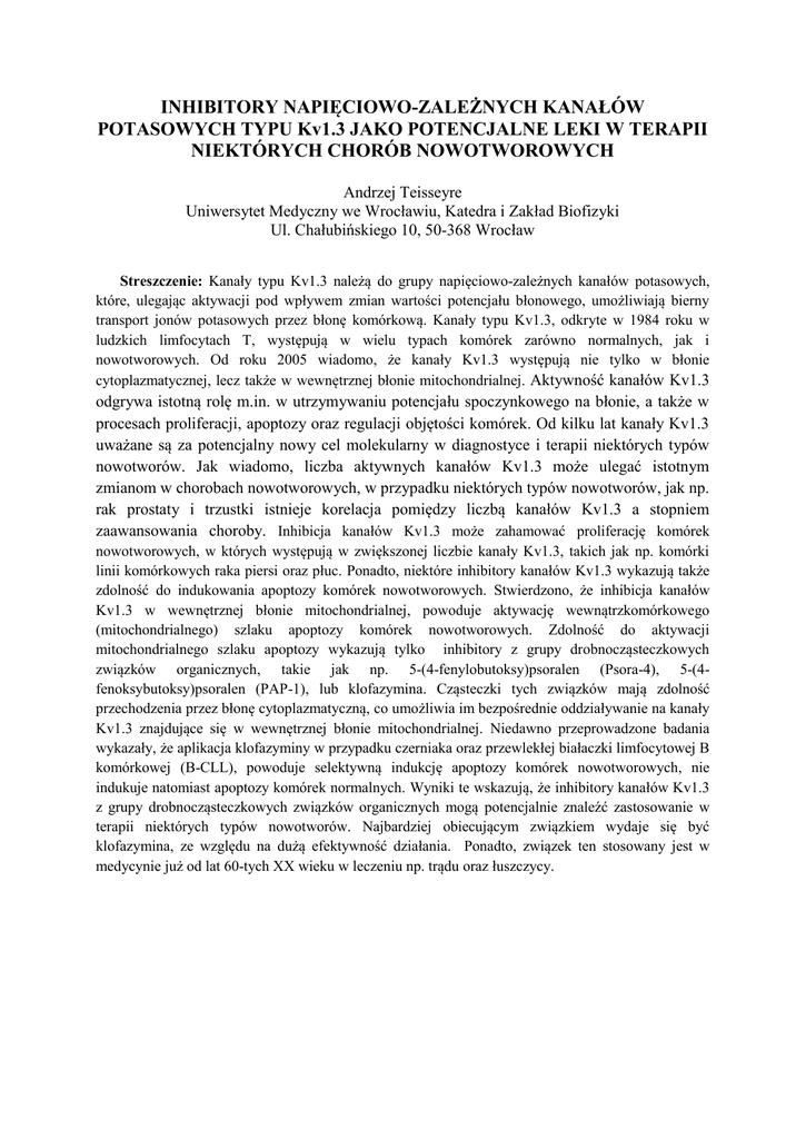 INHIBITORY NAPIĘCIOWO-ZALEŻNYCH KANAŁÓW POTASOWYCH TYPU Kv1.3 JAKO POTENCJALNE LEKI W TERAPII NIEKTÓRYCH CHORÓB NOWOTWOROWYCH Andrzej Teisseyre Uniwersytet Medyczny we Wrocławiu, Katedra i Zakład Biofizyki Ul. Chałubińskiego 10, 50-368 Wrocław Streszczenie: Kanały typu Kv1.3 należą do grupy napięciowo-zależnych kanałów potasowych, które, ulegając aktywacji pod wpływem zmian wartości potencjału błonowego, umożliwiają bierny transport jonów potasowych przez błonę komórkową. Kanały typu Kv1.3, odkryte w 1984 roku w ludzkich limfocytach T, występują w wielu typach komórek zarówno normalnych, jak i nowotworowych. Od roku 2005 wiadomo, że kanały Kv1.3 występują nie tylko w błonie cytoplazmatycznej, lecz także w wewnętrznej błonie mitochondrialnej. Aktywność kanałów Kv1.3 odgrywa istotną rolę m.in. w utrzymywaniu potencjału spoczynkowego na błonie, a także w procesach proliferacji, apoptozy oraz regulacji objętości komórek. Od kilku lat kanały Kv1.3 uważane są za potencjalny nowy cel molekularny w diagnostyce i terapii niektórych typów nowotworów. Jak wiadomo, liczba aktywnych kanałów Kv1.3 może ulegać istotnym zmianom w chorobach nowotworowych, w przypadku niektórych typów nowotworów, jak np. rak prostaty i trzustki istnieje korelacja pomiędzy liczbą kanałów Kv1.3 a stopniem zaawansowania choroby. Inhibicja kanałów Kv1.3 może zahamować proliferację komórek nowotworowych, w których występują w zwiększonej liczbie kanały Kv1.3, takich jak np. komórki linii komórkowych raka piersi oraz płuc. Ponadto, niektóre inhibitory kanałów Kv1.3 wykazują także zdolność do indukowania apoptozy komórek nowotworowych. Stwierdzono, że inhibicja kanałów Kv1.3 w wewnętrznej błonie mitochondrialnej, powoduje aktywację wewnątrzkomórkowego (mitochondrialnego) szlaku apoptozy komórek nowotworowych. Zdolność do aktywacji mitochondrialnego szlaku apoptozy wykazują tylko inhibitory z grupy drobnocząsteczkowych związków organicznych, takie jak np. 5-(4-fenylobutoksy)psoralen (Psora-4), 5-(4fenoksybutoksy)psoralen (PAP-1), lub klofazymina. Cząsteczki tych związków mają zdolność przechodzenia przez błonę cytoplazmatyczną, co umożliwia im bezpośrednie oddziaływanie na kanały Kv1.3 znajdujące się w wewnętrznej błonie mitochondrialnej. Niedawno przeprowadzone badania wykazały, że aplikacja klofazyminy w przypadku czerniaka oraz przewlekłej białaczki limfocytowej B komórkowej (B-CLL), powoduje selektywną indukcję apoptozy komórek nowotworowych, nie indukuje natomiast apoptozy komórek normalnych. Wyniki te wskazują, że inhibitory kanałów Kv1.3 z grupy drobnocząsteczkowych związków organicznych mogą potencjalnie znaleźć zastosowanie w terapii niektórych typów nowotworów. Najbardziej obiecującym związkiem wydaje się być klofazymina, ze względu na dużą efektywność działania. Ponadto, związek ten stosowany jest w medycynie już od lat 60-tych XX wieku w leczeniu np. trądu oraz łuszczycy.