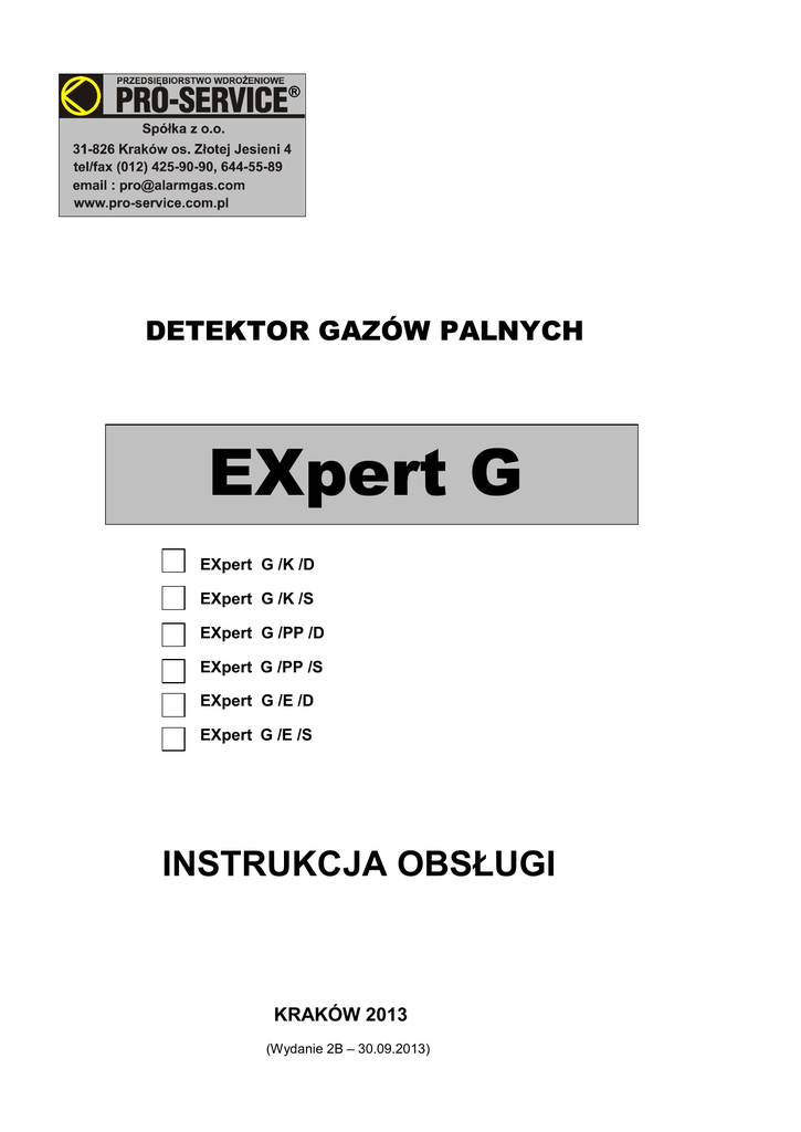 DETEKTOR GAZÓW PALNYCH EXpert G EXpert G /K /D EXpert G /K /S EXpert G /PP /D EXpert G /PP /S EXpert G /E /D EXpert G /E /S INSTRUKCJA OBSŁUGI KRAKÓW 2013 (Wydanie 2B – 30.09.2013) Spis treści : I. II. III. IV. V. VI. VII. VIII. IX. X. Przeznaczenie Podstawowe parametry techniczne Opis funkcjonalny 1. Płyta czołowa 2. Listwy zaciskowe Połączenie detektora z jednostkami centralnymi 1. Wykorzystanie wyjść detekcyjnych 2. Połączenie strefowe 3. Wykorzystanie wyjścia prądowego 4…20mA Instalacja detektora 1. Kable połączeniowe 2. Zasady montażu Uwagi i zalecenia eksploatacyjne 1. Kontrola okresowa działania detektora 2. Kontrola kalibracyjna 3. Wpływ substancji zakłócających Warunki gwarancji Karta Gwarancyjna Atest Kalibracyjny Deklaracja Zgodności WE - str. 3 - str. 3 - str. 4 - str. 4 - str. 4 - str. 5 - str. 5 - str. 6 - str. 7 - str. 8 - str. 8 - str. 8 - str. 8 - str. 8 - str. 9 - str. 9 - str. 10 - str. 11 - str. 12 - str. 13 Uwaga : Instrukcja dotyczy detektorów EXpert G –wersja G2 (produkcja od kwietnia 2010). 2 I. PRZEZNACZENIE Detektory Gazów Palnych "EXpert.G" przeznaczone są do stosowania w stacjonarnych systemach pomiaru lub detekcji gazów oraz par cieczy palnych , poza strefami zagrożonymi wybuchem. Wykrywanymi gazami mogą być: metan, LPG, amoniak, opary benzyny, opary styrenu i ksylenu, opary alkoholi itp. Obszary zastosowań : kotłownie, kuchnie, stacje kontroli pojazdów, chłodnie, oczyszczalnie ścieków laboratoria itp. Pomiar stężenia gazu jest wykonywany w oparciu o czujniki półprzewodnikowe lub katalityczne . Detektor „EXpert G” może współpracować z różnymi centralkami alarmowymi (np. EXter4z, uniSTER 8z, PAG8 itp.), systemami sterowania wentylacją i sterownikami przemysłowymi. II. PODSTAWOWE PARAMETRY TECHNICZNE : 1. Napięcie zasilania: nominalne 12 V DC, dopuszczalne 10 – 15 V DC 2. Pobór prądu: max. 250 mA (zależne od typu zastosowanego czujnika) 3. Kontrola zasilania modułu – optyczna (zielona dioda LED „ PRACA” na płycie czołowej) 4. Metoda pomiaru – dyfuzyjna (pomiar ciągły) 5. Czas reakcji (T90) – ≤ 60 sek. 6. Rodzaj sensorów: półprzewodnikowe (wersja /PP), katalityczne (wersja /K), elektrochemiczne (wersja /E) 7. Czas życia sensorów : średnio 5 lat (czujniki półprzewodnikowe i katalityczne), 2…3 lata (czujniki elektrochem.) 8. Zakresy pomiarowe – zależne od zastosowanego czujnika i wykrywanych gazów lub oparów (podano w Ateście Kalibracyjnym). Przykładowo : - dla metanu, LPG : 0…50% DGW (czujniki półprzewodnikowe), 0...100%DGW (czujniki katalityczne) - dla styrenu, ksylenu, alkoholi (opary) : 0…50% DGW (czujniki półprzewodnikowe), 0...100%DGW (czujniki katalityczne) - dla wodoru : 0…50% DGW (czujniki elektrochemiczne) - dla benzyny, oleju napędowego (opary) : 0…50% DGW (czujniki półprzewodnikowe), 0...100%DGW (czujniki katalityczne) 9. Progi alarmowe – zależne od zastosowanego czujnika i wykrywanych gazów lub oparów (podano w Ateście Kalibracyjnym). Przykładowo : - dla metanu, LPG, oparów alkoholi - 10 / 30 %DGW - dla amoniaku - 0,5 / 1 %V/V 9. Stany alarmowe detektora: - brak alarmów (nie przekroczone wartości stężeń alarmowych I i II progu ) – nieaktywne wyjścia A1 i A2, wyjście S – prąd=4mA (wyj. w wersji 4/8/12mA) -alarm I stopnia (przekroczenie stężenia I progu alarmowego) – aktywne wyjście A1, nieaktywne wyjście A2, wyjście S – prąd=8mA (wyj. w wersji 4/8/12mA). -alarm II stopnia (przekroczenie stężenia I progu alarmowego ) – aktywne wyjścia A1 i A2, wyjście S – prąd=12mA (wyj. w wersji 4/8/12mA). 10. Wyjścia sygnału alarmowego: - wyjścia detekcyjne (dwustanowe): dwa wyjścia „A1” i „A2” sygnalizujące przekroczenie gazu na poziomie I i II progu alarmowego . Wyjścia typu OC – NC (standardowo) lub OC –NO (opcja). Zmiana typu wyjścia może nastąpić na etapie produkcji detektora. - wyjście sygnałowe, prądowe 4-20mA (lub 4/8/12) mA. 11. Wpusty kablowy (dławice) – 1 x PG 11 12. Klimatyczne warunki pracy: o -temperatura pracy: - 20 do + 50 C -wilgotność: 10... 90 % bez kondensacji pary 13. Obudowa: materiał - PS, stopień ochrony- IP33, mocowanie dwupunktowe. 14. Waga : 215g 15. Wymiary: wysokość x szerokość x głębokość : 136mm x 102mm x 56mm (z dławicą i komorą pomiarową) 16. Wersje detektora : - EXpert G /K/D - detektor z czujnikiem katalitycznym, wyjście detekcyjne A1/A2 - EXpert G /K/S - detektor z czujnikiem katalitycznym, wyjście prądowe 4-20mA (4/8/12mA) - EXpert G /PP/D - detektor z czujnikiem półprzewodnikowym, wyjście detekcyjne A1/A2 - EXpert G /PP/D - detektor z czujnikiem półprzewodnikowym, wyjście prądowe 4-20mA (4/8/12mA) - EXpert G /E/D - detektor z czujnikiem elektrochemicznym, wyjście detekcyjne A1/A2 - EXpert G /E/D - detektor z czujnikiem elektrochemicznym wyjście prądowe 4-20mA (4/8/12mA 3 III. OPIS FUNKCJONALNY III.1. Płyta czołowa Dławica kablowa PG11 Wlot gazu Rys.1. Widok Detektora Gazów Palnych "EXpert G" Na deklu płyty czołowej znajdują się trzy diody LED informujące o stanie detektora: - dioda LED „ALARM” czerwona -gdy świeci światłem pulsującym - sygnalizuje stężenia gazu powyżej I progu alarmowego -gdy świeci światłem ciągłym - sygnalizuje stężenia gazu powyżej II progu alarmowego - dioda LED „AWARIA” czerwona – sygnalizuje uszkodzenie detektora - dioda LED „PRACA” zielona – sygnalizuje zasilanie czujnika napięciem 12V DC (10...15V) III.2. Listwy zaciskowe Listwa zaciskowa detektora EXpert G pokazana została na rys.2. Dostęp do niej uzyskuje się po odkręceniu czterech wkrętów i zdjęciu dekla płyty czołowej. Listwa zaciskowa znajduje się po prawej stronie płytki elektroniki. Na listwie znajdują się (patrząc od góry) następujące zaciski śrubowe: - zacisk (S ) – wyjście prądowe 4-20mA (4/8/12mA) - zacisk (A/A2) – wyjście detekcyjne A2 (wyjście alarmu II) - zacisk (B/A1) 