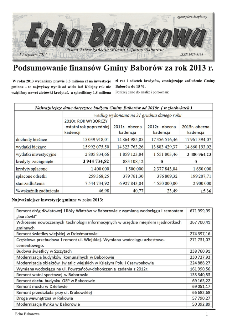 egzemplarz bezpłatny 1 / styczeń 2014 Pismo Mieszkańców Miasta i Gminy Baborów ISSN 14278138 Podsumowanie finansów Gminy Baborów za rok 2013 r. W roku 2013 wydaliśmy prawie 3,5 miliona zł na inwestycje zł rat i odsetek kredytów, zmniejszając zadłużenie Gminy gminne – to najwyższy wynik od wielu lat! Kolejny rok nie Baborów do 15 %. wzięliśmy nawet złotówki kredytu!, a spłaciliśmy 1,8 miliona Poniżej dane do analiz i porównań: Najważniejsze inwestycje gminne w roku 2013: Echo Baborowa 1 Zrealizowaliśmy również zadania (nie należące do inwestycji) takie jak: „Rewitalizacja Parku Miejskiego w Baborowie” za kwotę 94 620,78 zł, „Wydanie pocztówek i folderów promujących miejscowości Gminy Baborów'' za sumę 14 883,00 zł oraz „Opracowanie analizy historyczno – kulturowej Gminy Baborów” za kwotę 12 000, 00 zł. W TRZECH latach obecnej kadencji, spłacając ogromne długi, wykonaliśmy inwestycje na kwotę: 6 891 891,53 zł, co cieszy tym bardziej, że w ciągu CZTERECH lat ubiegłej kadencji wykonano inwestycje za: Echo Baborowa 4 773 789,02 zł, zaciągając 8 044 734,82 zł KREDYTÓW. W TRZECH latach obecnej kadencji spłaciliśmy KREDYTY i ODSETKI na kwotę: 6 483 621,37 zł ( ile za tę kwotę moglibyśmy zainwestować!). 883 108,12 zł - kwota KREDYTU wziętego w obecnej kadencji, w 2011 r. -by wyjść z „zapaści” finansowej po poprzedniej kadencji. Elżbieta Kielska 2 Szopka Bożonarodzeniowa Gminnego Ośrodka Kultury Dzieci przychodzące na warsztaty twórcze do Gminnego Ośrodka Kultury wzięły po raz pierwszy udział w konkursie Szopek Bożonarodzeniowych. Organizatorem była Szkoła Podstawowa w Uciechowicach. Możemy się pochwalić tym, iż nasza szopka została wyróżniona z pośród 345 szopek z całego kraju, a nawet z zagranicy. Szczególne gratulacje kierujemy dla dzieci, które brały czynny udział w tworzeniu szopki. Wyróżnienie wraz z nagrodami rzeczowymi otrzymali: Oliwa Wołk, Monika Margazyn, Alena Surma, Łukasz Lechoszest i Marek Lechoszest. Cieszymy się dużym zainteresowaniem dzieci w tworzeniu tradycji Świąt Bożego Narodzenia. Zapraszamy chętnych na nasze warsztaty twórcze w każdą środę od godz. 15.00. Instruktor ds. kultury Sylwia Bolik Turniej i Jarmark Bożonarodzeniowy Z niespodziewanie dużym zainteresowaniem spotkał się organizowany przez Gminny Ośrodek Kultury w Baborowie i rodziców najmłodszych zawodników Bożonarodzeniowy Turniej Piłki Nożnej, który odbył się w dniu 21 grudnia 2013 r., na sali gimnastycznej przy ul. Wiejskiej. Podczas uroczystego rozpoczęcia rozgrywek można było zobaczyć występ zespołu Czad Dance z GOK w Baborowie i pokazowy mecz przedszkolaków. Ojciec Mateusz Otręba podzielił się ze wszystkimi opłatkiem i świątecznymi życzeniami, do których przyłączyła się Pani Burmistrz Elżbieta Kielska i otworzyła turniej. W turnieju udział wzięło 6 drużyn: Sparta Prudnik I i II, Chemik Kędzierzyn-Koźle I i II, GOK Baborów oraz Cukrownik Baborów, sędziowali Panowie Henryk Wilczek i Andrzej Kanas. Po emocjonujących rozgrywkach stojących na bardzo dobrym sportowym poziomie zwycięzcami zostali: • rocznik 2004 i młodsi – I miejsce SparEcho Baborowa 3 ta Prudnik, II miejsce Chemik KędzierzynKoźle, III miejsce GOK Baborów, • rocznik 2001 – 2003 – I miejsce Sparta Prudnik, II miejsce Cukrownik Baborów, III miejsce Chemik Kędzierzyn-Koźle. Zwycięskie drużyny i zawodnicy uhonorowani zostali pucharami, medalami, książkami i słodyczami ufundowanymi przez serdecznych darczyńców: Panią Burmistrz Baborowa Elżbietę Kielską, dyrektora GOK w Baborowie - Lidię Piecha , Pana Tomasza Krupę – prezesa ZUK w Baborowie, Pana Jacka Blecharczyka – prezesa Cukrownik Baborów, Pana Andrzeja Kanasa – trenera najmłodszych zawodników z Baborowa, Pana Jerzego Tomczyka – trenera MUKS Baborów Panią Krysię Pohl-Tatura, Panią Martę Lechodzest, firmę Agropol oraz Bank Spółdzielczy w Baborowie. Najlepszym zawodnikiem został wybrany Igor Pawelec z Baborowa, najwaleczniejszym Marek Lechoszest z Baborowa, najlepszym strzelcem Choiński Łukasz z Prudnika, najlepszym bramkarzem Piotruś Baran z Baborowa. Nagroda specjalna od Pana Ryszarda Tatura dla najmłodszego zawodnika Bartusia Cykowskiego z Sułkowa, puchar fair play od Pani Burmistrz dla młodszej drużyny z Kędzierzyna-Koźla. Przy okazji Turnieju został zorganizowany Jarmark Bożonarodzeniowy, na którym można było zaopatrzyć się w świąteczne ozdoby i stroiki wykonane przez dzieci z kółka plastycznego Pani Eli Olejnik przy ZSP w Baborowie, w domowe ciasta upieczone przez panie ze Stowarzyszenia Miłośników Sułkowa, przepyszne smakołyki wigilijne – uszka, pierogi, krokiety, paszteciki przygotowane przez gospodynie z Suchej Psiny oraz gołąbki i pasztety z Cateringu Pani Bożeny Słoneckiej z Rakowa. W ciepłej, miłej, atmosferze spędziliśmy przedświąteczną sobotę. Dziękuję instruktorom i pracownikom GOK-u oraz Panu Andrzejowi Kanas za zaangażowanie i trud włożony w organizację całego świątecznego przedsięwzięcia. Podziękowanie kieruję również do Dyrektora ZSP w Baborowie Pani Alicji Szuba za udostępnienie sali na ten pełen wrażeń, emocji i sportowej rywalizacji magiczny dzień. Na pewno na taki sam, a może jeszcze piękniejszy zapraszamy za rok. Lidia Piecha Przesłanie naszych zwycięskich szopek Tradycja tworzenia szopek bożonarodzeniowych wywodzi się z Włoch. Za jej prekursora uważa się św. Franciszka, który w 1223r. w swojej pustelni w pobliżu wioski Greccio, wspólnie z pobliskimi mieszkańcami wystawił inscenizację narodzin Jezusa. Do Polski zwyczaj trafił także w XIII wieku, ale największy rozkwit tej wigilijnej tradycji nastąpił w XVIII stuleciu. Przez wieki szopki bożonarodzeniowe przechodziły najróżniejsze modyfikacje, ale przesłanie zawsze było to samo – syn Boga w ubogiej stajni się narodził. Ucz