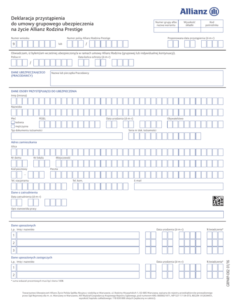 Deklaracja przystąpienia do Allianz Rodzina Prestige