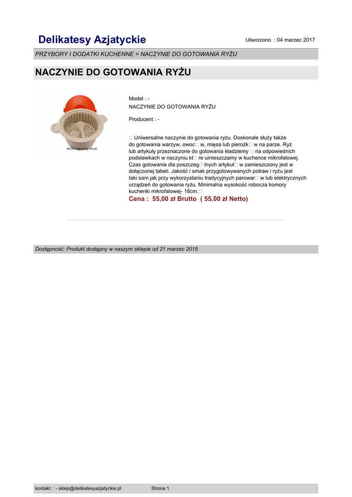 Delikatesy Azjatyckie Utworzono : 04 marzec 2017 PRZYBORY I DODATKI KUCHENNE > NACZYNIE DO GOTOWANIA RYŻU NACZYNIE DO GOTOWANIA RYŻU Model : NACZYNIE DO GOTOWANIA RYŻU Producent : Uniwersalne naczynie do gotowania ryżu. Doskonale służy także do gotowania warzyw, owoc�w, mięsa lub pierożk�w na parze. Ryż lub artykuły przeznaczone do gotowania kładziemy �na odpowiednich podstawkach w naczyniu kt�re umieszczamy w kuchence mikrofalowej. Czas gotowania dla poszczeg�lnych artykuł�w zamieszczony jest w dołączonej tabeli. Jakość i smak przygotowywanych potraw i ryżu jest taki sam jak przy wykorzystaniu tradycyjnych parowar�w lub elektrycznych urządzeń do gotowania ryżu. Minimalna wysokość robocza komory kuchenki mikrofalowej- 18cm.� Cena : 55,00 zł Brutto ( 55,00 zł Netto) Dostępność: Produkt dostępny w naszym sklepie od 21 marzec 2015 kontakt : - [email protected] Strona 1