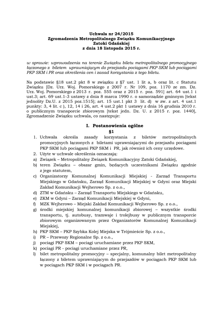 Uchwała nr 24/2015 Zgromadzenia Metropolitalnego Związku Komunikacyjnego Zatoki Gdańskiej z dnia 18 listopada 2015 r. w sprawie: wprowadzenia na terenie Związku biletu metropolitalnego promocyjnego łączonego z biletem uprawniającym do przejazdu pociągami PKP SKM lub pociągami PKP SKM i PR oraz określenia cen i zasad korzystania z tego biletu. Na podstawie §18 ust.2 pkt 8 w związku z §7 ust. 1 lit a, b oraz lit. c Statutu Związku [Dz. Urz. Woj. Pomorskiego z 2007 r. Nr 109, poz. 1170 ze zm. Dz. Urz. Woj. Pomorskiego z 2013 r. poz. 555 oraz z 2015 r. poz. 591] art. 64 ust.1 i ust.3; art. 69 ust.1-3 ustawy z dnia 8 marca 1990 r. o samorządzie gminnym [tekst jednolity Dz.U. z 2015 poz.1515]; art. 15 ust.1 pkt 3 lit. d) w zw. z art. 4 ust.1 punkty: 3, 4 lit. c ), 12, 14 i 26, art. 4 ust.2 pkt 1 ustawy z dnia 16 grudnia 2010 r. o publicznym transporcie zbiorowym [tekst jedn. Dz. U. z 2015 r. poz. 1440], Zgromadzenie Związku uchwala, co następuje: I. Postanowienia ogólne 1. 2. a) b) c) d) e) f) g) h) i) j) k) l) §1 Uchwała określa zasady korzystania z biletów metropolitalnych promocyjnych łączonych z biletami uprawniającymi do przejazdu pociągami PKP SKM lub pociągami PKP SKM i PR, jak również ich ceny urzędowe. Użyte w uchwale określenia oznaczają: Związek – Metropolitalny Związek Komunikacyjny Zatoki Gdańskiej, teren Związku – obszar gmin, będących uczestnikami Związku zgodnie z jego statutem, Organizatorzy Komunalnej Komunikacji Miejskiej - Zarząd Transportu Miejskiego w Gdańsku, Zarząd Komunikacji Miejskiej w Gdyni oraz Miejski Zakład Komunikacji Wejherowo Sp. z o.o., ZTM w Gdańsku – Zarząd Transportu Miejskiego w Gdańsku, ZKM w Gdyni – Zarząd Komunikacji Miejskiej w Gdyni, MZK Wejherowo – Miejski Zakład Komunikacji Wejherowo Sp. z o.o., środki miejskiej komunalnej komunikacji zbiorowej – wszystkie środki transportu, tj. autobusy, tramwaje i trolejbusy w publicznym transporcie zbiorowym organizowanym przez Organizatorów Komunalnej Komunikacji Miejskiej, PKP SKM – PKP Szybka Kolej Miejska w Trójmieście Sp. z o.o., PR – Przewozy Regionalne Sp. z o.o., pociągi PKP SKM – pociągi uruchamiane przez PKP SKM, pociągi PR - pociągi uruchamiane przez PR, bilet metropolitalny promocyjny – specjalny, komunalny bilet metropolitalny łączony z biletem uprawniającym do przejazdów w pociągach PKP SKM lub w pociągach PKP SKM i w pociągach PR. 1. 2. 3. 4. §2 Na terenie Związku wprowadza się bilety metropolitalne promocyjne uprawniające do przejazdu środkami miejskiej komunalnej komunikacji zbiorowej oraz przewozu bagażu pod warunkiem jednoczesnego zakupu biletu uprawniającego do przejazdu pociągami PKP SKM lub pociągami PKP SKM i PR. Emitentem biletów metropolitalnych promocyjnych jest Metropolitalny Związek Komunikacyjny Zatoki Gdańskiej. Bilety metropolitalne promocyjne występują jako: a. bilety metropolitalne promocyjne Gdańsk-Sopot, b. bilety metropolitalne promocyjne Gdynia-Sopot, c. bilety metropolitalne promocyjne MZKZG. Uchwala się ceny biletów metropolitalnych promocyjnych zgodnie z załącznikiem nr 1 do niniejszej uchwały. II. Bilety metropolitalne promocyjne §3 1. Bilet metropolitalny promocyjny Gdańsk-Sopot to komunalny bilet metropolitalny sprzedawany łącznie i jednocześnie z biletem uprawniającym do przejazdów pociągami PKP SKM na odcinkach, których krańce wyznaczają w gminie miasta Gdańsk stacje Gdańsk Lipce, Gdańsk Osowa oraz (dla przejazdów w kierunku do/z Żukowa) stacja Gdańsk Rębiechowo a w gminie miasta Sopot stacja Sopot Kamienny Potok. 2. Bilet metropolitalny promocyjny Gdańsk-Sopot jest biletem: a) normalnym lub ulgowym; b) elektronicznym, tj. zapisywanym na elektronicznych kartach miejskich, które przeszły proces personalizacji u jednego z Organizatorów Komunalnej Komunikacji Miejskiej; c) imiennym, na którym umieszczone są: zdjęcie oraz dane personalne posiadacza biletu, tj. jego imię i nazwisko; d) umożliwiającym realizację przejazdu w granicach administracyjnych gminy miasta Gdańsk oraz gminy miasta Sopot wszystkimi liniami ZTM w Gdańsku i ZKM w Gdyni; e) przesiadkowym, tj. uprawniającym do nieograniczonej zmiany środka transportu w trakcie realizacji przejazdu wszystkimi liniami ZTM w Gdańsku i ZKM w Gdyni w granicach administracyjnych gminy miasta Gdańsk oraz gminy miasta Sopot; f) ważnym we wszystkie dni tygodnia; g) miesięcznym, ważnym na okres jednego miesiąca lub ważnym od początkowego dnia ważności biletu do dnia poprzedzającego dzień, który datą odpowiada początkowemu dniowi terminu, np. od 1 do 31 października lub od 15 października do 14 listopada. 3. Bilet metropolitalny promocyjny Gdańsk-Sopot nie wymaga nadawania ważności (kasowania/rejestrowania) w środkach miejskiej komunalnej komunikacji zbiorowej. §4 1. Bilet metropolitalny promocyjny Gdynia-Sopot to komunalny bilet metropolitalny sprzedawany łącznie i jednocześnie z biletem uprawniającym do przejazdów pociągami PKP SKM na odcinkach, których krańce wyznaczają w gminie miasta Gdynia stacje Gdynia Cisowa i Gdynia Wielki Kack a w gminie miasta Sopot stacja Sopot Wyścigi. 2. Bilet metropolitalny promocyjny Gdynia-Sopot jest biletem: a) normalnym lub ulgowym; b) elektronicznym, tj. zapisywanym na elektronicznych kartach miejskich, które przeszły proces personalizacji u jednego z Organizatorów Komunalnej Komunikacji Miejskiej; c) imiennym, na którym umieszczone są: zdjęcie oraz dane personalne posiadacza biletu, tj. jego imię i nazwisko; d) umożliwiającym realizację przejazdu w granicach administracyjnych gminy miasta Gdynia oraz gminy miasta Sopot wszystkimi liniami ZKM w Gdyni i ZTM w Gdańsku; e) przesiadkowym, tj. uprawniającym do nieograniczonej zmiany środka transportu w trakcie realizacji przejazdu wszystkimi liniami ZKM w Gdyni i ZTM w Gdańsku w granicach administracyjnych gminy miasta Gdynia oraz gminy miasta Sopot; f) ważnym we wszys