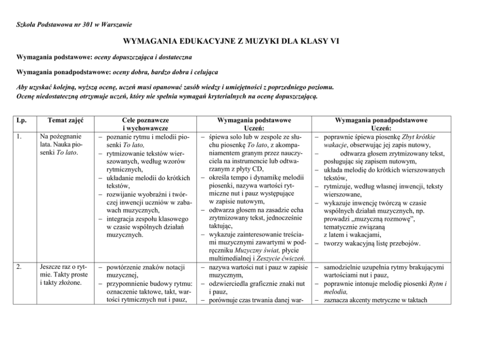 Szkoła Podstawowa nr 301 w Warszawie WYMAGANIA EDUKACYJNE Z MUZYKI DLA KLASY VI Wymagania podstawowe: oceny dopuszczająca i dostateczna Wymagania ponadpodstawowe: oceny dobra, bardzo dobra i celująca Aby uzyskać kolejną, wyższą ocenę, uczeń musi opanować zasób wiedzy i umiejętności z poprzedniego poziomu. Ocenę niedostateczną otrzymuje uczeń, który nie spełnia wymagań kryterialnych na ocenę dopuszczającą. Lp. 1. Temat zajęć Na pożegnanie lata. Nauka piosenki To lato. 2. Jeszcze raz o rytmie. Takty proste i takty złożone. Cele poznawcze i wychowawcze poznanie rytmu i melodii piosenki To lato, rytmizowanie tekstów wierszowanych, według wzorów rytmicznych, układanie melodii do krótkich tekstów, rozwijanie wyobraźni i twórczej inwencji uczniów w zabawach muzycznych, integracja zespołu klasowego w czasie wspólnych działań muzycznych. powtórzenie znaków notacji muzycznej, przypomnienie budowy rytmu: oznaczenie taktowe, takt, wartości rytmicznych nut i pauz, Wymagania podstawowe Uczeń: śpiewa solo lub w zespole ze słuchu piosenkę To lato, z akompaniamentem granym przez nauczyciela na instrumencie lub odtwarzanym z płyty CD, określa tempo i dynamikę melodii piosenki, nazywa wartości rytmiczne nut i pauz występujące w zapisie nutowym, odtwarza głosem na zasadzie echa zrytmizowany tekst, jednocześnie taktując, wykazuje zainteresowanie treściami muzycznymi zawartymi w podręczniku Muzyczny świat, płycie multimedialnej i Zeszycie ćwiczeń. nazywa wartości nut i pauz w zapisie muzycznym, odzwierciedla graficznie znaki nut i pauz, porównuje czas trwania danej war- Wymagania ponadpodstawowe Uczeń: poprawnie śpiewa piosenkę Zbyt krótkie wakacje, obserwując jej zapis nutowy, odtwarza głosem zrytmizowany tekst, posługując się zapisem nutowym, układa melodię do krótkich wierszowanych tekstów, rytmizuje, według własnej inwencji, teksty wierszowane, wykazuje inwencję twórczą w czasie wspólnych działań muzycznych, np. prowadzi „muzyczną rozmowę”, tematycznie związaną z latem i wakacjami, tworzy wakacyjną listę przebojów. samodzielnie uzupełnia rytmy brakującymi wartościami nut i pauz, poprawnie intonuje melodię piosenki Rytm i melodia, zaznacza akcenty metryczne w taktach Szkoła Podstawowa nr 301 w Warszawie 3. Z dawnych dziejów muzyki – o muzyce średniowiecza. 4. Muzyka z dedykacją (audycja muzyczna). rozróżnianie taktów prostych i taktów złożonych, wskazywanie mocnych i słabych części taktu, poznanie piosenki Rytm i melodia, wykonanie zespołowe utworu, nauka gry utworu Cygańska ballada, kształcenie dyscypliny zespołowej podczas wspólnego muzykowania. poznanie ośrodków kultury średniowiecza oraz najważniejszych gatunków i form muzyki tej epoki, słuchanie utworów muzycznych z epoki średniowiecza, określanie charakterystycznych cech stylu muzycznego, wykonywanie zespołowe pieśni Breve regnum, *inscenizacja ruchowa treści pieśni. tości rytmicznej w stosunku do całej nuty, określa łączny czas trwania kilku wartości rytmicznych, wystukuje wzory rytmiczne, rozróżnia mocne i słabe części taktów prostych i złożonych, włącza się w śpiew piosenki Rytm i melodia, wyklaskuje jej miary taktu. prostych i taktach złożonych, wskazuje grupy metryczne w taktach złożonych, gra na instrumencie utwór Cygańska ballada przy akompaniamencie odtwarzanym z płyty multimedialnej. wykorzystuje różne programy narzędziowe do pisania nut i odtwarzania dźwięków. określa najważniejsze cechy i funkcje muzyki średniowiecznej, wykazuje zainteresowanie słuchanymi utworami muzycznymi, rozpoznaje w słuchanych utworach śpiew chorałowy, wymienia tytuły utworów poznanych na lekcji oraz nazwiska ich twórców, włącza się w zespole w wykonanie powierzonych zadań. słuchanie utworów muzycznych różnych kompozytorów, określanie charakterystycznych cech wysłuchanych kompozycji, utrwalenie zdobytych wiadomości o kwartecie smyczkowym, słucha utworów kompozytorów z różnych epok muzycznych, określa ich nastrój, tempo, charakter, wymienia skład instrumentalny kwartetu smyczkowego, wyklaskuje na zasadzie echa rytm piosenki Profesor Robert, włącza się w śpiew piosenki Profe- wypowiada się o wartości muzyki średniowiecza, rozróżnia styl muzyki średniowiecza w słuchanych utworach muzycznych, wymienia najstarsze zabytki muzyki polskiej, zna ich genezę, wyjaśnia nowe terminy muzyczne, np. neumy, chorał gregoriański, melizmat, improwizuje ruch do treści pieśni Breve regnum, poszukuje w różnych źródłach informacji poszerzających wiadomości o muzyce średniowiecza. formułuje wypowiedź na temat oceny dzieła muzycznego, rozpoznaje w utworach brzmienie kwartetu smyczkowego, śpiewa linię melodyczną piosenki Profesor Robert, obserwując zapis nutowy utworu, układa według własnej inwencji dedykację rytmiczną dla ulubionego nauczyciela, Szkoła Podstawowa nr 301 w Warszawie 5. 6., 7. Muzycznopoetyckie impresje na temat jesieni. Nauka piosenki Jesienne marzenia. Renesansowe granie i śpiewanie. wykonywanie zespołowe lub indywidualne piosenki Profesor Robert, utrwalenie wartości nut i pauz z kropką. poznanie rytmu i melodii piosenki Jesienne marzenia, układanie na instrumentach ilustracji muzycznej inspirowanej dziełami plastycznymi, wykonywanie ćwiczeń dykcyjnych, granie na instrumencie muzycznego wstępu i zakończenia. poznanie źródeł muzyki renesansu oraz głównego hasła epoki, dostrzeganie charakterystycznych cech i funkcji muzyki renesansowej, słuchanie utworów renesansowych, uwrażliwianie na styl muzyczny epoki, nauka gry na flecie lub dzwonkach renesansowego utworu Pavana, *nauka tańca kurant (krok podstawowy w parze), kształcenie dyscypliny zespołowej w czasie wspólnego muzykowania. sor Robert, wyjaśnia znaczenie kropki przy nucie i pauzie, włącza się w muzyczne działania zespołowe. włącza się w śpiew piosenki Jesienne m