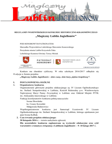 REGULAMIN WOJEWÓDZKIEGO KONKURSU HISTORYCZNO-KRASOMÓWCZEGO „Magiczny Lublin Jagiellonów” POD HONOROWYM PATRONATEM: Marszałka Województwa Lubelskiego Sławomira Sosnowskiego Prezydenta miasta Lublin Krzysztofa Żuka Lubelskiego Kuratora Oświaty Teresy Misiuk Konkurs ma charakter cykliczny. W roku szkolnym 2016/2017 odbędzie się II edycja w formie projektu: „Magiczny Lublin Jagiellonów - złote czasy, złote kury, piękne krajobrazy”. I. 1. POSTANOWIENIA OGÓLNE Organizatorzy konkursu. Organizatorami głównymi projektu edukacyjnego są: IV Liceum Ogólnokształcące im. Stefanii Sempołowskiej w Lublinie, Kościół Rektoralny p.w. Wniebowzięcia Najświętszej Maryi Panny Zwycięskiej w Lublinie oraz Oddział Miejski PTTK im. Aleksandra Janowskiego w Lublinie. Funkcję koordynatorów konkursu pełnią nauczyciele: Iwona Słowińska ks. Cezary Kowalski Małgorzata Badurowicz Współorganizatorem konkursu jest Samorząd Uczniowski IV Liceum Ogólnokształcącego im. Stefanii Sempołowskiej w Lublinie, którego opiekunem jest pani Iwona Kołbuk. 2. Czas trwania projektu edukacyjnego: 30 listopada 2016 r. – termin nadsyłania zgłoszeń. Dla uczestników konkursu zaplanowane są wycieczki edukacyjne oraz cykl warsztatów o tematyce związanej z Lublinem Jagiellonów – 9- 10 lutego 2017 r. 3. 4. 5. 6. (O szczegółach związanych z organizacją warsztatów i wycieczek uczestnicy konkursu zostaną poinformowani drogą mailową.) 30 maja 2017 r. godz. 1000 – eliminacje konkursowe opowiadaczy historii w IV Liceum Ogólnokształcącym im. Stefanii Sempołowskiej w Lublinie, o godz. 1900 koncert muzyki z epoki Jagiellonów w Kościele Rektoralnym p.w. Wniebowzięcia Najświętszej Maryi Panny Zwycięskiej w Lublinie, 31 maja 2017. godz. 1200 – finał konkursu w Kościele Rektoralnym p.w. Wniebowzięcia Najświętszej Maryi Panny Zwycięskiej w Lublinie –wyłonienie zwycięzców. Cele konkursu. zapoznanie uczniów z historią miasta okresu jagiellońskiego, popularyzacja materialnego i niematerialnego dziedzictwa Lublina poprzez różne narracje, wprowadzenie historii mówionej do kanonu regionalnej edukacji przy współpracy z instytucjami naszego miasta, historia mówiona jako metoda badawcza w poznaniu ważnych wydarzeń historycznych okresu jagiellońskiego naszego miasta, pielęgnowanie sztuki narracji i kultury żywego słowa, wychowanie młodego człowieka świadomego przeszłości swojego miasta, wolnego od stereotypów i kompleksów „peryferyjności” Lublina. Przedmiot konkursu. Przedmiotem konkursu jest zrealizowany przez uczestników projekt obejmujący narrację ustną opowiadacza historii połączoną z dowolną formą prezentacji multimedialnej lub z elementami dramy, zgodną z regulaminem konkursu i zaakceptowaną przez organizatorów – z podaniem pełnej dokumentacji źródłowej. Opis projektu konkursowego. Projekt będący przedmiotem konkursu to samodzielnie przygotowane wystąpienie (prezentacja). Prezentacje będące przedmiotem konkursu stanowią wynik autorskiego projektu każdego z uczestników. Dopuszczalna regulaminem forma wystąpienia konkursowego to gawęda autorska. Zaprezentowane fakty, wydarzenia, postaci i wątki muszą spełniać warunek autentyczności Lublina okresu jagiellońskiego. Ich prezentacja winna zostać poprzedzona samodzielnym, rzetelnym opracowaniem tematu (poszukiwaniem źródeł historycznych okresu, publikacji naukowych). Towarzysząca gawędzie prezentacja multimedialna musi opierać się na poszukiwaniach źródłowych, stanowiących potwierdzenie zgodności zaprezentowanych wydarzeń i postaci z historiografią, oba elementy powinny tworzyć przemyślaną kompozycję autorską. W dniu rozstrzygnięcia konkursu zgłoszone prezentacje będą przedstawiane osobiście przez każdego z uczestników przed komisją konkursową. Czas przygotowanej do konkursu prezentacji nie powinien przekraczać 5-7 minut. Ocenie podlegają wszystkie elementy wystąpienia: atrakcyjność tematu, rzetelność opracowania, wartość dokumentacji i wsz ystkich wykorzystanych 2 źródeł, forma art ystyczna prz ygotowanej prezentacji, kultura i piękno słowa mówionego (w wystąpieniu na ż ywo) . 7. Spośród zgłoszonych prezentacji, jury, składające się z osób wskazanych przez organizatorów, podczas przeglądu konkursowego dokonuje wyboru Laureatów. Jury przyznaje trzy nagrody za trzy najlepsze prezentacje. Nagrodzeni uczestnicy konkursu wygłoszą swoje gawędy podczas gali finałowej. 8. Organizatorzy konkursu mają prawo do rejestrowania (utrwalenia), powielania prezentacji konkursowych oraz dokumentacji źródłowej i wykorzystywania ich w celach dydaktycznych. II. UCZESTNICY KONKURSU I JEGO PRZEBIEG 1. W konkursie mogą wziąć dwie kategorie uczestników: uczniowie szkół gimnazjalnych, uczniowie szkół ponadgimnazjalnych. 2. Uczniowie przygotowują prezentacje indywidualne. 3. Uczestników zgłaszają nauczyciele pełniący funkcję opiekunów. 4. Organizatorzy nie ponoszą kosztów uczestnictwa uczniów i ich opiekunów w projekcie. III. WARUNKI KONKURSU 1. Zgłoszenia udziału w konkursie należy przesłać drogą elektroniczną, faksem, przesyłką pocztową lub dostarczyć osobiście do sekretariatu liceum, z dopiskiem: „Magiczny Lublin Jagiellonów” – dla p. Iwony Słowińskiej. Adres szkoły: IV Liceum Ogólnokształcące im. Stefanii Sempołowskiej w Lublinie ul. Szkolna 4 20-124 Lublin Fax: 817478023 Email: [email protected] Formularz zgłoszenia do konkursu jest dostępny w formie elektronicznej na stronie internetowej liceum www.4lo.lublin.pl. Formularz ten stanowi integralną część niniejszego regulaminu i musi być w przypadku ucznia szkoły gimnazjalnej i ponadgimnazjalnej podpisany przez dyrektora szkoły lub opiekuna konkursu (nauczyciela prowadzącego). Uczestnik konkursu oraz opiekun, składając swój podpis na formularzu zgłoszenia, wyrażają zgodę na przetwarzanie i udostępnianie danych os