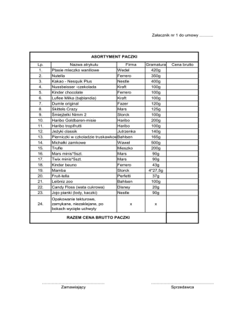 Załacznik nr 1 do umowy ………. ASORTYMENT PACZKI Lp. 1. 2. 3. 4. 5. 6. 7. 8. 9. 10. 11. 12. 13. 14. 15. 16. 17. 18. 19. 20. 21. 22. 23. Nazwa atrykułu Firma Ptasie mleczko waniliowe Wedel Nutella Ferrero Kakao - Nesquik Plus Nestle Nussbeisser -czekolada Kraft Kinder chocolate Ferrero Luflee Milka (bąblandia) Kraft Dumle original Fazer Skittels Crazy Mars ŚmiejŜelki Nimm 2 Storck Haribo Goldbaren-misie Haribo Haribo tropifrutti Haribo JeŜyki classik Jutrzenka Pierniczki w czkoladzie truskawkowe Bahlsen Michałki zamkowe Wawel Trufle Mieszko Mars minis*5szt. Mars Twix minis*5szt. Mars Kinder beuno Ferrero Mamba Storck Fruit-tella Perfetti Leibniz zoo Bahlsen Candy Floss (wata cukrowa) Disney Jojo pianki (lody, kaczki) Nestle 24. Opakowanie tekturowe, zamykane, niezaklejane, po bokach wycięte uchwyty x Gramatura 420g 350g 400g 100g 100g 100g 120g 125g 100g 200g 100g 140g 165g 500g 200g 90g 90g 43g 4*27,5g 37g 100g 20g 90g Cena brutto x RAZEM CENA BRUTTO PACZKI ……………………………………… Zamawiający ……………………………………… Sprzedawca