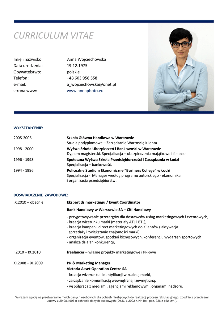 CURRICULUM VITAE Imię i nazwisko: Data urodzenia: Obywatelstwo: Telefon: e-mail: strona www: Anna Wojciechowska 19.12.1975 polskie +48 603 958 558 [email protected] www.annaphoto.eu WYKSZTAŁCENIE: 2005-2006 1998 - 2000 1996 - 1998 1994 - 1996 Szkoła Główna Handlowa w Warszawie Studia podyplomowe – Zarządzanie Wartością Klienta Wyższa Szkoła Ubezpieczeń i Bankowości w Warszawie Dyplom magisterski. Specjalizacja – ubezpieczenia majątkowe i finanse. Społeczna Wyższa Szkoła Przedsiębiorczości i Zarządzania w Łodzi Specjalizacja – bankowość. Policealne Studium Ekonomiczne "Business College" w Łodzi Specjalizacja - Manager według programu autorskiego - ekonomika i organizacja przedsiębiorstw. DOŚWIADCZENIE ZAWODOWE: IX.2010 – obecnie Ekspert ds marketingu / Event Coordinator Bank Handlowy w Warszawie SA – Citi Handlowy - przygotowywanie przetargów dla dostawców usług marketingowych i eventowych, - kreacja wizerunku marki (materiały ATL i BTL), - kreacja kampanii direct marketingowych do Klientów ( aktywacja sprzedaży i zwiększanie znajomości marki), - organizacja eventów, spotkań biznesowych, konferencji, wydarzeń sportowych - analiza działań konkurencji, I.2010 – IX.2010 freelancer – własne projekty marketingowe i PR-owe XI.2008 – XI.2009 PR & Marketing Manager Victoria Asset Operation Centre SA - kreacja wizerunku i identyfikacji wizualnej marki, - zarządzanie komunikacją wewnętrzną i zewnętrzną, - współpraca z mediami, agencjami reklamowymi, organami nadzoru, Wyrażam zgodę na przetwarzanie moich danych osobowych dla potrzeb niezbędnych do realizacji procesu rekrutacyjnego, zgodnie z przepisami ustawy z 29.08.1997 o ochronie danych osobowych (Dz.U. z 2002 r. Nr 101, poz. 926 z póź. zm.). X.2007 – VIII.2008 Project Manager NORDNET BANK AB - Stockholm, Sweden - realizacja projektu dot. funduszy inwestycyjnych na Polskę, - budowa platformy transakcyjnej we współpracy z Comarch, - analiza rynku produktów finansowych w Polsce, analiza konkurencji, - współpraca z mediami, X.2003 – VII.2007 CRM Manager / departament sprzedaży i marketingu / SEB Towarzystwo Funduszy Inwestycyjnych SA - zarządzanie projektem kampanii edukacyjnej dotyczącej inwestowania w fundusze i oszczędzania (w kooperacji z mediami), - odpowiedzialność za komunikację zewnętrzną i wewnętrzną, - organizacja eventów i konferencji, III.2003 – IX.2003 pobyt za granicą na kursie językowym VII.2001 – II.2003 Pełnomocnik Zarządu / Office Manager AICON Polska Sp. z o.o. – Warszawa - analiza ryzyk i przygotowywanie ofert ubezpieczeniowych dla małych i średnich przedsiębiorstw - sprzedaż B2B, - tworzenie wizerunku firmy na rynku, budowa marki, - zarządzanie i administrowanie Spółką, XII.2000 - V.2001 Specjalista ds. ubezpieczeń i obsługi posprzedażowej Polskie Towarzystwo Finansowe S.A. Oddział w Łodzi - negocjowanie umów współpracy z dealerami samochodów oraz towarzystwami ubezpieczeniowymi, - obsługa i wsparcie B2B w zarządzaniu flotą pojazdów, V.1998 - VII.2000 stanowiska asystenckie w firmach ubezpieczeniowych: TU ALLIANZ Polska S.A. – MT Ubezpieczenia Sp. z o.o. w Łodzi American Insurance Group PTE w Łodzi AGF Ubezpieczenia S.A. i AGF Życie S.A. Oddział w Łodzi UMIEJĘTNOSCI: Dobra znajomość obsługi komputera (Excel, Word, PowerPoint, Adobe Photoshop) Język angielski – bardzo dobra znajomość w mowie i piśmie, Prawo jazdy kat. A i B, ZAINTERESOWANIA: Sport: narciarstwo, squash, tenis, windsurfing, żeglarstwo, motocykle Fotografia Podróże Wyrażam zgodę na przetwarzanie moich danych osobowych dla potrzeb niezbędnych do realizacji procesu rekrutacyjnego, zgodnie z przepisami ustawy z 29.08.1997 o ochronie danych osobowych (Dz.U. z 2002 r. Nr 101, poz. 926 z póź. zm.).
