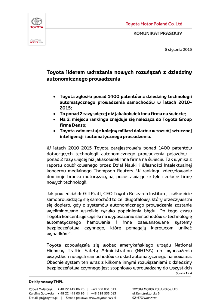 8 stycznia 2016 Toyota liderem wdrażania nowych rozwiązań z dziedziny autonomicznego prowadzenia Toyota zgłosiła ponad 1400 patentów z dziedziny technologii automatycznego prowadzenia samochodów w latach 20102015; To ponad 2 razy więcej niż jakakolwiek inna firma na świecie; Na 2. miejscu rankingu znajduje się należąca do Toyota Group firma Denso; Toyota zainwestuje kolejny miliard dolarów w rozwój sztucznej inteligencji i automatycznego prowadzenia. W latach 2010-2015 Toyota zarejestrowała ponad 1400 patentów dotyczących technologii autonomicznego prowadzenia pojazdów – ponad 2 razy więcej niż jakakolwiek inna firma na świecie. Tak wynika z raportu opublikowanego przez Dział Nauki i Własności Intelektualnej koncernu medialnego Thompson Reuters. W rankingu zdecydowanie dominuje branża motoryzacyjna, pozostawiając w tyle czołowe firmy nowych technologii. Jak powiedział dr Gill Pratt, CEO Toyota Research Institute, „całkowicie samoprowadzący się samochód to cel długofalowy, który urzeczywistni się dopiero, gdy z systemów autonomicznego prowadzenia zostanie wyeliminowane wszelkie ryzyko popełnienia błędu. Do tego czasu Toyota koncentruje wysiłki na wyposażaniu samochodów w technologię automatycznego hamowania i inne zaawansowane systemy bezpieczeństwa czynnego, które pomagają kierowcom unikać wypadków”. Toyota zobowiązała się wobec amerykańskiego urzędu National Highway Traffic Safety Administration (NHTSA) do wyposażenia wszystkich nowych samochodów w układ automatycznego hamowania. Obecnie system ten wraz z kilkoma innymi rozwiązaniami z dziedziny bezpieczeństwa czynnego jest stopniowo wprowadzany do wszystkich Strona 1 z 4 modeli japońskiej marki pod nazwą Toyota Safety Sense. Nowa generacja pakietu, która wejdzie na rynek w tym roku, otrzyma dodatkowe funkcje: zapobieganie zderzeniom z dodatkową funkcją wykrywania pieszych oraz aktywny tempomat, który samodzielnie będzie utrzymywał bezpieczną odległość od poprzedzającego samochodu. W Japonii nowe modele Priusa i Crown otrzymały przełomowy system ITS Connect, który opiera swoje działanie na automatycznej komunikacji między pojazdami oraz między pojazdami a urządzeniami infrastruktury drogowej. System ostrzega o zagrożeniu zderzenia z autami, których nie są w stanie wykryć czujniki zamontowane w pojeździe, asystuje kierowcy podczas skrętu w lewo, zapobiega wypadkom z udziałem pieszych, informuje o czerwonym świetle, a także ostrzega o zbliżającym się pojeździe uprzywilejowanym na sygnale. Toyota jako pierwszy producent samochodów na świecie wprowadziła ITS do komercyjnej oferty. W listopadzie Toyota utworzyła w Stanach Zjednoczonych Toyota Research Institute, który skupi się na rozwoju sztucznej inteligencji i technologii automatycznego prowadzenia pojazdów. Inwestycja jest warta miliard dolarów. Podczas konferencji prasowej na targach CES w Las Vegas Gill Pratt przedstawił nowy zespół Toyota Research Institute, składający się z wybitnych specjalistów w dziedzinie robotyki, sztucznej inteligencji i autonomicznego prowadzenia, wśród których znalazł się James Kuffner, dotychczasowy szef Google Robotics i współtwórca autonomicznego samochodu Google. Wyniki badania zespołu Reutersa to nie pierwszy sukces Toyoty w dziedzinie innowacyjności. W sierpniu Center of Automotive Management (CAM) na Uniwersytecie Nauk Stosowanych (FHDW) w Niemczech opublikował raport, z którego wynika, że Toyota zarejestrowała najwięcej patentów na polu napędów samochodowych (26% wszystkich zarejestrowanych wniosków). Toyota od lat należy do ścisłej czołówki najbardziej innowacyjnych firm na świecie według Boston Consulting Group. W tym roku japoński koncern zajął 6. miejsce, dystansując pozostałych największych graczy w branży motoryzacyjnej oraz większość technologicznych gigantów. Strona 2 z 4 Strona 3 z 4 Strona 4 z 4