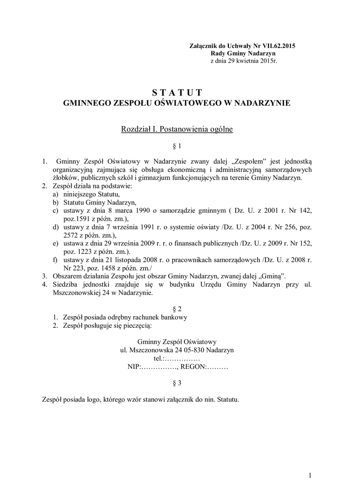 Załącznik do Uchwały Nr VII.62.2015 Rady Gminy Nadarzyn z dnia 29 kwietnia 2015r. STATUT GMINNEGO ZESPOŁU OŚWIATOWEGO W NADARZYNIE Rozdział I. Postanowienia ogólne §1 1. Gminny Zespół Oświatowy w Nadarzynie zwany dalej „Zespołem” jest jednostką organizacyjną zajmująca się obsługa ekonomiczną i administracyjną samorządowych żłobków, publicznych szkół i gimnazjum funkcjonujących na terenie Gminy Nadarzyn. 2. Zespół działa na podstawie: a) niniejszego Statutu, b) Statutu Gminy Nadarzyn, c) ustawy z dnia 8 marca 1990 o samorządzie gminnym ( Dz. U. z 2001 r. Nr 142, poz.1591 z późn. zm.), d) ustawy z dnia 7 września 1991 r. o systemie oświaty /Dz. U. z 2004 r. Nr 256, poz. 2572 z późn. zm.), e) ustawa z dnia 29 września 2009 r. r. o finansach publicznych /Dz. U. z 2009 r. Nr 152, poz. 1223 z późn. zm.). f) ustawy z dnia 21 listopada 2008 r. o pracownikach samorządowych /Dz. U. z 2008 r. Nr 223, poz. 1458 z późn. zm./ 3. Obszarem działania Zespołu jest obszar Gminy Nadarzyn, zwanej dalej „Gminą”. 4. Siedziba jednostki znajduje się w budynku Urzędu Gminy Nadarzyn przy ul. Mszczonowskiej 24 w Nadarzynie. §2 1. Zespół posiada odrębny rachunek bankowy 2. Zespół posługuje się pieczęcią: Gminny Zespół Oświatowy ul. Mszczonowska 24 05-830 Nadarzyn tel.:…………… NIP:……………, REGON:……… §3 Zespół posiada logo, którego wzór stanowi załącznik do nin. Statutu. 1 Rozdział II. Organizacja wewnętrzna Zespołu §4 1. Zespół ma strukturę bezwydziałową. 2. Wielkość i strukturę zatrudnienie ustala Dyrektor w uzgodnieniu z Wójtem Gminy. §5 1. Zespołem kieruje Dyrektor. 2. Dyrektora powołuje i odwołuje Wójt Gminy, zgodnie z ustawą o pracownikach samorządowych. 3. Wójt Gminy wykonuje wobec Dyrektora zespołu czynności pracodawcy samorządowego. 4. W razie dłuższej nieobecności Dyrektora lub w innych szczególnych przypadkach Wójt Gminy może wyznaczyć osobę pełniącą obowiązki Dyrektora. §6 1. Dyrektor wykonuje czynności z zakresu prawa pracy wobec pracowników Zespołu. 2. Do podstawowych obowiązków i uprawnień Dyrektora należy: a) ustalenie wewnętrznej organizacji pracy Zespołu a w szczególności opracowanie regulaminu organizacyjnego oraz określenie obowiązków, uprawnień i odpowiedzialności pracowników zatrudnionych na poszczególnych stanowiskach; b) podejmowanie decyzji w sprawach zatrudnienia i wynagrodzenia pracowników Zespołu; zapewnienie pracownikom bezpiecznych i higienicznych warunków pracy; c) wykonywanie za Zespół innych czynności w sprawach z zakresu prawa pracy wobec pracowników Zespołu; d) wydawanie zarządzeń i instrukcji regulujących bieżącą działalność Zespołu; e) określanie kierunku i przedmiotu kontroli wewnętrznej oraz podejmowanie stosownych decyzji; f) ustalenie zasad obiegu dokumentów wewnątrz Zespołu; g) współpraca z dyrektorami obsługiwanych jednostek; h) akceptowanie i odpowiedzialność za celowość wydatków związanych z realizacją budżetu przy współpracy z dyrektorami obsługiwanych jednostek; i) współpraca z Kuratorium Oświaty, OKE oraz Poradnią Psychologiczno-Pedagogiczną; j) nadzór nad opracowaniem projektów planów, analiz i informacji oraz nad arkuszami organizacyjnymi szkół i przedszkoli; k) w ramach czynności związanych ze sprawowanym nadzorem, Dyrektor ma prawo wstępu do szkół i przedszkoli oraz wglądu do prowadzonej przez placówki oświatowe dokumentacji dotyczącej przebiegu nauczania, wychowania i opieki, organizacji pracy oraz przestrzegania obowiązujących przepisów dotyczących bezpieczeństwa i higieny pracy pracowników i uczniów; l) wydawanie dyrektorom placówek oświatowych zarządzeń i doraźnych zalecenia oraz zgłaszanie uwag i wniosków wynikających z przeprowadzanych czynności; m) organizowanie pracy komisji egzaminacyjnej na stopień nauczyciela mianowanego; n) przygotowanie oceny pracy dyrektorów w zakresie zadań znajdujących się w kompetencjach organu prowadzącego. 2 3. 4. 5. 6. 7. Dyrektor wykonuje swoje obowiązki przy pomocy Głównego Księgowego oraz pracowników Zespołu, zgodnie z zatwierdzoną przez Wójta Gminy liczbą etatów. Głównego Księgowego zatrudnia i zwalnia Dyrektor Zespołu. Główny Księgowy wykonuje powierzone mu zadania przez Dyrektora Zespołu, a w szczególności koordynuje i nadzoruje pracę podległych mu pracowników. Pracownicy Zespołu wynagradzani są wg. zasad wynagradzania pracowników samorządowych zatrudnionych w jednostkach organizacyjnych jednostek samorządu terytorialnego, zgodnie z regulaminem wynagradzania. Strukturę organizacyjną Zespołu oraz zakres działania i zadania poszczególnych stanowisk, liczbę etatów, godziny pracy oraz schemat organizacyjny określa regulamin organizacyjny i regulamin pracy. Rozdział III. Zadania i zakres działania Zespołu §7 Do podstawowych zadań Zespołu należy: 1. Planowanie i prowadzenie scentralizowanej obsługi finansowo-księgowej w oparciu o jednostkowe budżety poszczególnych placówek oświatowych, a w szczególności: a) obsługa finansowo-księgowa placówek oświatowych i żłobków oraz nadzór nad prawidłową realizacją wydatków przestrzegania dyscypliny budżetowej przez te placówki. b) dokonywanie wypłat wynagrodzeń i innych zobowiązań finansowych oraz ewidencjonowanie danych o zatrudnieniu i wynagrodzeniach, c) sporządzanie sprawozdań z realizacji zadań rzeczowych , zatrudniania, wynagrodzeń oraz innych sprawozdań analityczno-statystycznych, gromadzenie i przechowywanie dokumentacji finansowo-księgowej, w tym dowodów księgowych, d) opracowywanie na wniosek dyrektorów szkół oświatowych projektów planów finansowych oraz ich zmian, e) prowadzenie rachunkowości zgodnie z przyjętymi zasadami rachunkowości, f) prowadzenie, na podstawie dowodów księgowych, ksiąg rachunkowych ujmujących zapisy zdarzeń w porządku chronologicznym i systematy