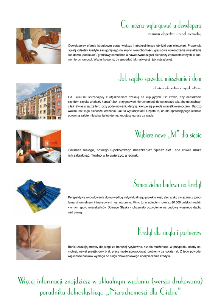 Co można wytargować u dewelopera zdaniem ekspertów - rynek pierwotny Deweloperzy oferują kupującym coraz większe i atrakcyjniejsze obniżki cen mieszkań. Proponują spłatę odsetek kredytu zaciągniętego na kupno nieruchomości, gratisowe wykończenie mieszkania lub domu „pod klucz”, gratisowy samochód a nawet zwrot części pieniędzy zainwestowanych w kupno nieruchomości. Wszystko po to, by sprzedać jak najwięcej i jak najszybciej. Jak szybko sprzedać mieszkanie i dom zdaniem ekspertów - rynek wtórny Od kilku lat sprzedający z utęsknieniem czekają na kupujących. Co zrobić, aby mieszkanie czy dom szybko znalazły kupca? Jak przygotować nieruchomość do sprzedaży tak, aby go zachwyciła? Zwłaszcza, że ten, przy podejmowaniu decyzji, kieruje się przede wszystkim emocjami. Bardzo ważne jest więc pierwsze wrażenie. Jak to wykorzystać? Często to, co dla sprzedającego stanowi ogromną zaletę mieszkania lub domu, kupujący uznaje za wady. Wybierz nowe „M” dla siebie Szukasz małego, nowego 2-pokojowego mieszkania? Śpiesz się! Lada chwila może ich zabraknąć. Trudno w to uwierzyć, a jednak... Samodzielna budowa na kredyt Perspektywa wybudowania domu według indywidualnego projektu kusi, ale ryzyko związane z problemami formalnymi i finansowymi jest ogromne. Mimo to, w ubiegłym roku aż 80 000 polskich rodzin - w tym sporo mieszkańców Dolnego Śląska - otrzymało pozwolenie na budowę własnego dachu nad głową. Kredyt dla singla i partnerów Banki uważają kredyty dla singli za bardziej ryzykowne, niż dla małżeństw. W przypadku osoby samotnej, nawet przejściowy brak pracy może spowodować problemy ze spłatą rat. Z tego powodu, większość banków wymaga od singli obowiązkowego ubezpieczenia kredytu. Więcej informacji znajdziesz w aktualnym wydaniu (wersja drukowana) poradnika dolnośląskiego „Nieruchomości dla Ciebie”