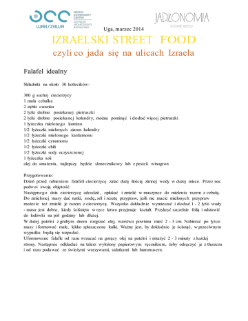 Uga, marzec 2014 IZRAELSKI STREET FOOD czyli co jada się na ulicach Izraela Falafel idealny Składniki na około 30 kotlecików: 300 g suchej ciecierzycy 1 mała cebulka 2 ząbki czosnku 2 łyżki drobno posiekanej pietruszki 2 łyżki drobno posiekanej kolendry, można pominąć i dodać więcej pietruszki 1 łyżeczka mielonego kuminu 1/2 łyżeczki mielonych ziaren kolendry 1/2 łyżeczki mielonego kardamonu 1/2 łyżeczki cynamonu 1/2 łyżeczki chili 1/2 łyżeczki sody oczyszczonej 1 łyżeczka soli olej do smażenia, najlepszy będzie słonecznikowy lub z pestek winogron Przygotowanie: Dzień przed robieniem falafeli ciecierzycę zalać dużą ilością zimnej wody w dużej misce. Przez noc podwoi swoją objętość. Następnego dnia ciecierzycę odcedzić, opłukać i zmielić w maszynce do mielenia razem z cebulą. Do zmielonej masy dać natki, sodę, sól i resztę przypraw, jeśli nie macie mielonych przypraw możecie też zmielić je razem z ciecierzycą. Wszystko dokładnie wymieszać i dodać 1 - 2 łyżki wody - masa jest dobra, kiedy ściśnięta w ręce łatwo przyjmuje kształt. Przykryć szczelnie folią i odstawić do lodówki na pół godziny lub dłużej. W dużej patelni z grubym dnem rozgrzać olej, warstwa powinna mieć 2 - 3 cm. Nabierać po łyżce masy i formować małe, lekko spłaszczone kulki. Ważne jest, by dokładnie je ścisnąć, w przeciwnym wypadku będą się rozpadać. Uformowane falafle od razu wrzucać na gorący olej na patelni i smażyć 2 - 3 minuty z każdej strony. Następnie odkładać na talerz wyłożony papierowym ręcznikiem, żeby odsączyć je z tłuszczu i od razu podawać ze świeżymi warzywami, sałatkami lub hummusem. Hummus idealny Składniki: 1 szklanka suchej ciecierzycy 1 szklanka jasnej pasty tahini 1/3 szklanki lodowatej wody 3 łyżki soku z cytryny 3 ząbki czosnku 2 łyżeczki sody sól do posypania: dobra oliwa, posiekania pietruszka, słodka papryka, orzeszki piniowe albo zatar Przygotowanie: Dzień przed przygotowywaniem hummusu ciecierzycę zalać zimną wodą z łyżeczką sody, powinno być przynajmniej dwa razy tyle tyle wody ile ciecierzycy. Zostawić na noc. Następnego dnia ciecierzycę odcedzić i opłukać, teraz jest już jej ponad dwie szklanki. Zalać dużą ilością świeżej wody, dodać łyżeczkę sody i zagotować. Gotować przez około 40 minut lub do czasu, kiedy pojedyncze ziarenko cieciorki z łatwością będzie dało się rozgnieść w palcach i będzie maślane w środku - nie może być białe i suche wewnątrz. Jeżeli ciecierzyca nie będzie dostatecznie ugotowana to hummus będzie klapą. Ugotowaną cieciorkę odcedzić i opłukać. Przełożyć do naczynia blendera, dodać tahinę, sól, sok z cytryny i czosnek i wszystko zmiksować na bardzo gładką pastę. Na zwyczajnym, domowym blenderze zajmuje to około 2-3 minut - jest gotowe, kiedy pasta jest aksamitna i nie ma żadnej grudki. Do gęstej sezamowo-ciecierzycowej pasty dolewam powoli lodowatą wodę cały czas miksując. To najprzyjemniejszy moment całego procesu - nagle hummus zmienia kolor i nabiera przyjemnej, aksamitnej konsystencji. Ucieram hummus przez kolejne 2-3 minuty lub do momentu, aż woda idealnie połączy się z pastą i całość zmieni się w jasny, gładki krem. Przekładam gotowy hummus do miski i pozwalam mu chwilę odpocząć. Posypuję ulubionymi dodatkami, u mnie jest to obowiązkowo pietruszka i oliwa, czasem jeszcze sumak albo słodka papryka i jem ze świeżym pieczywem. Resztę hummusu przekładam do szczelnego pojemnika i trzymam w lodówce do 5 dni.
