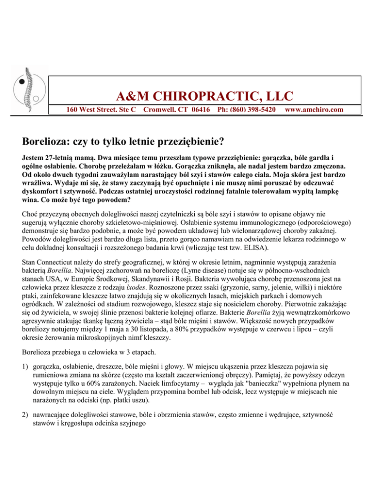 A&M CHIROPRACTIC, LLC 160 West Street, Ste C Cromwell, CT 06416 Ph: (860) 398-5420 www.amchiro.com Borelioza: czy to tylko letnie przeziębienie? Jestem 27-letnią mamą. Dwa miesiące temu przeszłam typowe przeziębienie: gorączka, bóle gardła i ogólne osłabienie. Chorobę przeleżałam w łóżku. Gorączka zniknęła, ale nadal jestem bardzo zmęczona. Od około dwuch tygodni zauważyłam narastający ból szyi i stawów całego ciała. Moja skóra jest bardzo wrażliwa. Wydaje mi się, że stawy zaczynają być opuchnięte i nie muszę nimi poruszać by odczuwać dyskomfort i sztywność. Podczas ostatniej uroczystości rodzinnej fatalnie tolerowałam wypitą lampkę wina. Co może być tego powodem? Choć przyczyną obecnych dolegliwości naszej czytelniczki są bóle szyi i stawów to opisane objawy nie sugerują wyłącznie choroby szkieletowo-mięśniowej. Osłabienie systemu immunologicznego (odporościowego) demonstruje się bardzo podobnie, a może być powodem układowej lub wielonarządowej choroby zakaźnej. Powodów dolegliwości jest bardzo długa lista, przeto gorąco namawiam na odwiedzenie lekarza rodzinnego w celu dokładnej konsultacji i rozszeżonego badania krwi (wliczając test tzw. ELISA). Stan Connecticut należy do strefy geograficznej, w której w okresie letnim, nagminnie występują zarażenia bakterią Borellia. Najwięcej zachorowań na boreliozę (Lyme disease) notuje się w północno-wschodnich stanach USA, w Europie Środkowej, Skandynawii i Rosji. Bakteria wywołująca chorobę przenoszona jest na człowieka przez kleszcze z rodzaju lxodes. Roznoszone przez ssaki (gryzonie, sarny, jelenie, wilki) i niektóre ptaki, zainfekowane kleszcze łatwo znajdują się w okolicznych lasach, miejskich parkach i domowych ogródkach. W zależności od stadium rozwojowego, kleszcz staje się nosicielem choroby. Pierwotnie zakażając się od żywiciela, w swojej ślinie przenosi bakterie kolejnej ofiarze. Bakterie Borellia żyją wewnątrzkomórkowo agresywnie atakując tkankę łączną żywiciela – stąd bóle mięśni i stawów. Większość nowych przypadków boreliozy notujemy między 1 maja a 30 listopada, a 80% przypadków występuje w czerwcu i lipcu – czyli okresie żerowania mikroskopijnych nimf kleszczy. Borelioza przebiega u człowieka w 3 etapach. 1) gorączka, osłabienie, dreszcze, bóle mięśni i głowy. W miejscu ukąszenia przez kleszcza pojawia się rumieniowa zmiana na skórze (często ma kształt zaczerwienionej obręczy). Pamiętaj, że powyższy odczyn występuje tylko u 60% zarażonych. Naciek limfocytarny – wygląda jak "banieczka" wypełniona płynem na dowolnym miejscu na ciele. Wyglądem przypomina bombel lub odcisk, lecz występuje w miejscach nie narażonych na odciski (np. płatki uszu). 2) nawracające dolegliwości stawowe, bóle i obrzmienia stawów, często zmienne i wędrujące, sztywność stawów i kręgosłupa odcinka szyjnego 3) zaburzenia czucia, niedowład, porażenie nerwów obwodowych, zanikowe zapalenie skóry, bóle mięśniowostawowe, przewlekłe zmęczenie Diagnoza jest prosta we wczesnych przypadkach, gdy zostało zauważone ukąszenie kleszcza i jeśli pojawił się charakterystyczny rumień na skórze. Pierwszy i drugi etap infekcji leczy się kilkutygodniową lub kilkumiesięczną terapią antybiotykiem, choć poszczególne formy bakteri mają różną wrażliwość na podawane lekarstwa. Np. forma krętka ginie pod wpływem penicylin lub cefalosporyn, podczas gdy forma L ginie pod wpływem makrolidow lub tetracyklin. Najprostrzymi metodami zapobiegania infekcji Boreliozą są: używanie maści lub środków odstraszających kleszcze. Zakładanie długich, jasnych ubrań by szybko zauważyć na nich ciemną plamkę kleszcza. Po powrocie z lasu lub ogrodu dokładnie sprawdź włosy, szyję, faudy za uszami, pachwiny ramion, nóg i kolan. Jeśli zauważysz kleszcza czym prędzej musisz go usunąć. Po więcej informacji i bezpłatną konsultację prosimy o kontakt. Lekarze i personel gabinetu A&M Chiropractic, LLC płynnie mówią po polsku.